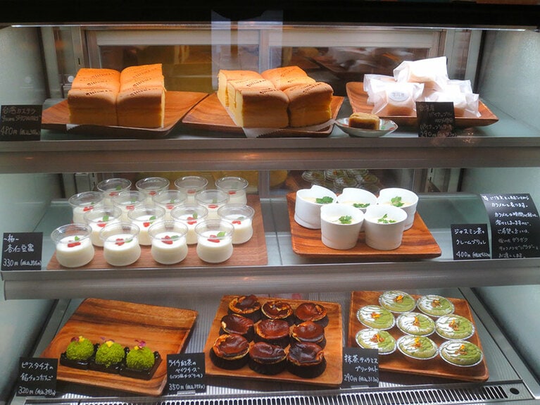 吉田シェフが丁寧に説明しながら販売。 左:「~極~杏仁豆富」356円。豆腐ではなく「豆富」です。右:「台湾カステラ”fuwa SHUWARI”」 518円。 左から:「ライチ紅茶のベイクチーズ」378円と「パイナップルケーキ」313円。 スイーツ3点。左から「ジャスミン茶のクレームブリュレ」432円、「ピスタチオの餡チョコだんご」345円、「抹茶ティラミスプリンタルト」313円。 オリエンタル・フレーバー・クッキー。左:「natsume × 洛神花(ローゼル)」680円、右:「yuzu × 蝶豆(バタフライピー)」680円。他に「Ki-mon紅茶」626円、「黒goma × 古代米」626円あり。 ナッツ菓子。左から「肴(あて)ナッツ」648円、「霜掛けナッツ」648円、「くるみ硝子」756円。 クッキーやナッツ菓子と台湾茶が並ぶ茶飾棚。お客様をもてなすという意味があるそう。 パイナップルケーキはパイナップル餡を1個ずつ手で包んで。