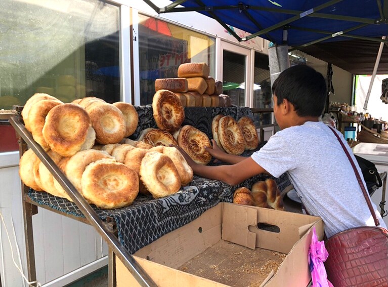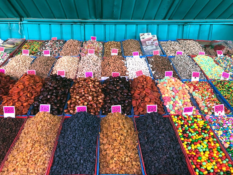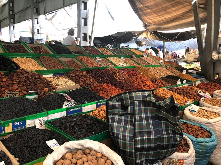 チェーン店のハチミツ屋さんにて。これ全部ハチミツ! おしゃれにハチミツをディスプレイ。 これが白いハチミツ。 オシュバザールの入り口は、映画『アラジン』に出てくる市場のよう。 オシュバザールの一角に積まれたスイカとメロン。 オシュバザールの売り場にて。 ドライフルーツ売り場。 スパイスの数々。東京に帰ったら、キルギス料理を作りたい! 製造農家が直接販売をしているハチミツ屋さん。 肝臓に効くといわれるマリアアザミ。 レストラン「ファイザー」の入り口。 「ファイザー」で食べたラグマン。 さようなら、またねキルギス! 見送ってきれたホストファミリー。 見送ってきれたホストファミリー。彼女がナズカ。