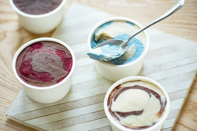 男木島発の美味しいもの通常定期便 5,000円(送料込)。 Cool Cream Cup marble & dark〈4種各1個〉1,944円。 ラヴィンマフィンズ(簡易ジップロック入り)〈2種各3個〉3,240円。 ナカシマファームのおすすめチーズセット〈5種〉4,000円。 有機JAS認定三角経木納豆 いっ歩〈大粒80g、小粒80g〉各324円。