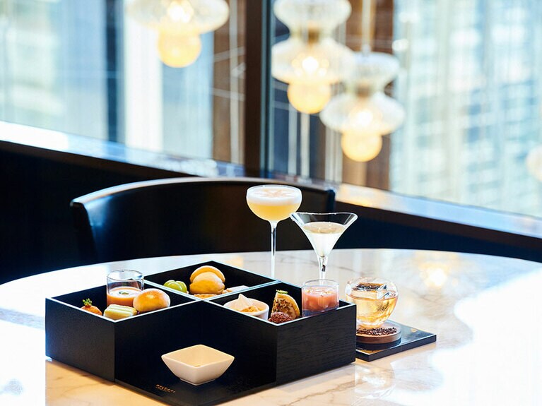 アフタヌーンティーボックス。平日 4,730円、土・日曜・祝日 5,390円(別途サービス料13%)。 右から時計回り、サルシッチャのミニバーガー、サーモンとリコッタのサンドイッチ、トマトとチーズのスップリ、冷製トマトスープ。 右から時計回り、ココナッツとパッションフルーツのカプレーゼ、さやいんげんとベーコンのキッシュ、季節のフルーツタルト、マリトッツォ コン パンナ。 右から時計回り、桃のビッキエーレ、チョコレートとヘーゼルナッツのビニエ、デリツィア アル リモーネ、ズコット、中央はブルガリ チョコレート ジェム。 左から、オレンジフラワーサワー、ロイヤル・マスカルポーネ・ティー、カカオとビターオレンジのスモーキーカクテル。アフタヌーンティーボックスとのペアリングコースのみでの提供で、平日 9,794円、土・日曜・祝日 10,462円(別途サービス料)。8月1日より販売開始。