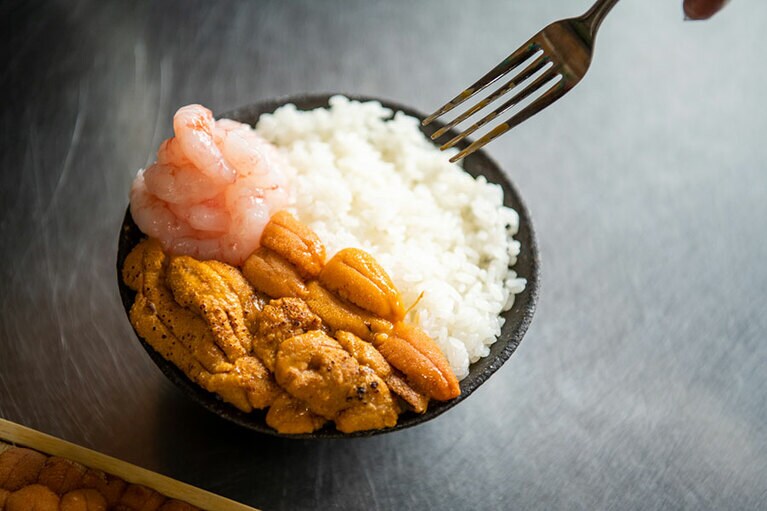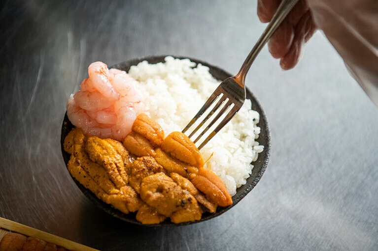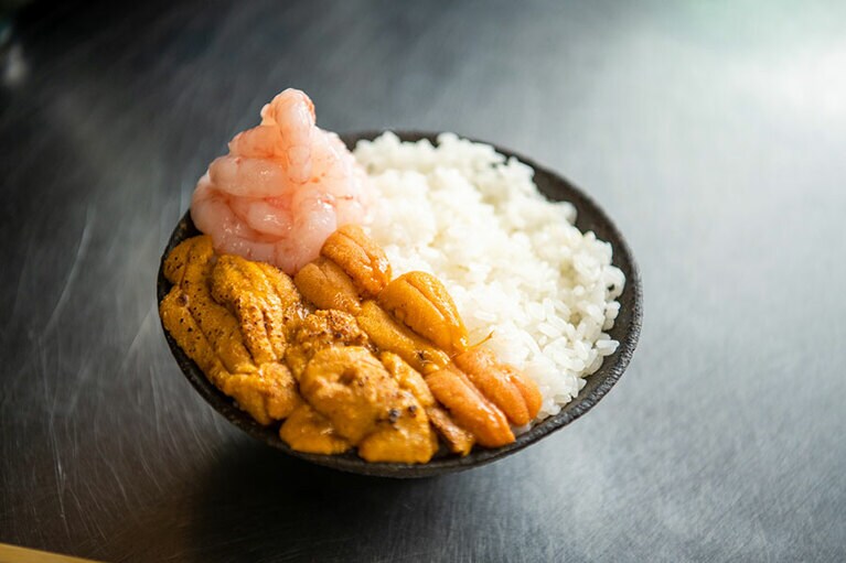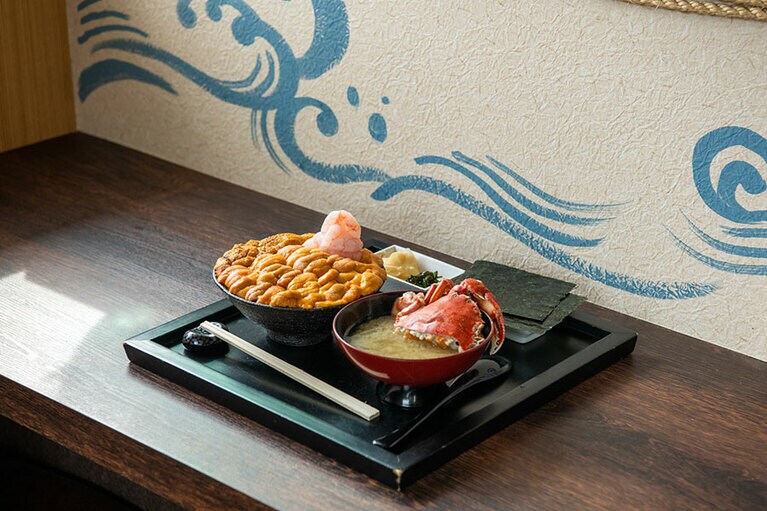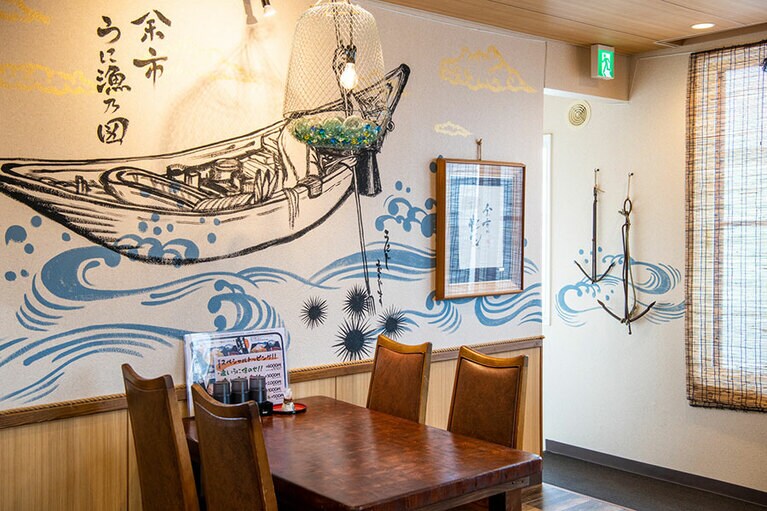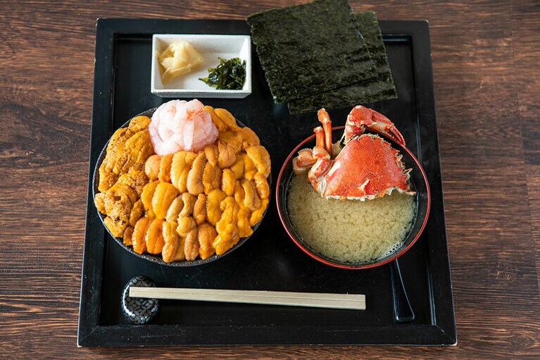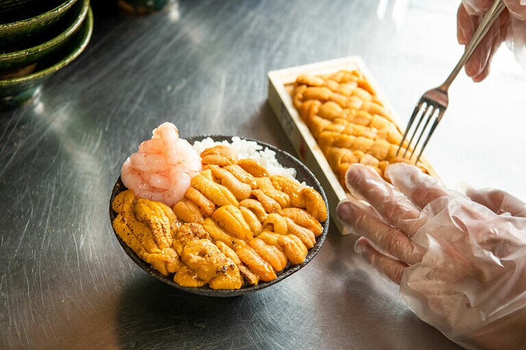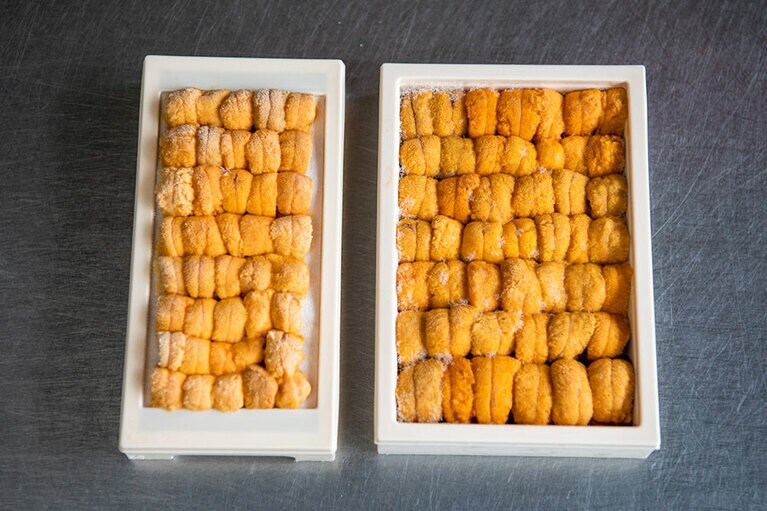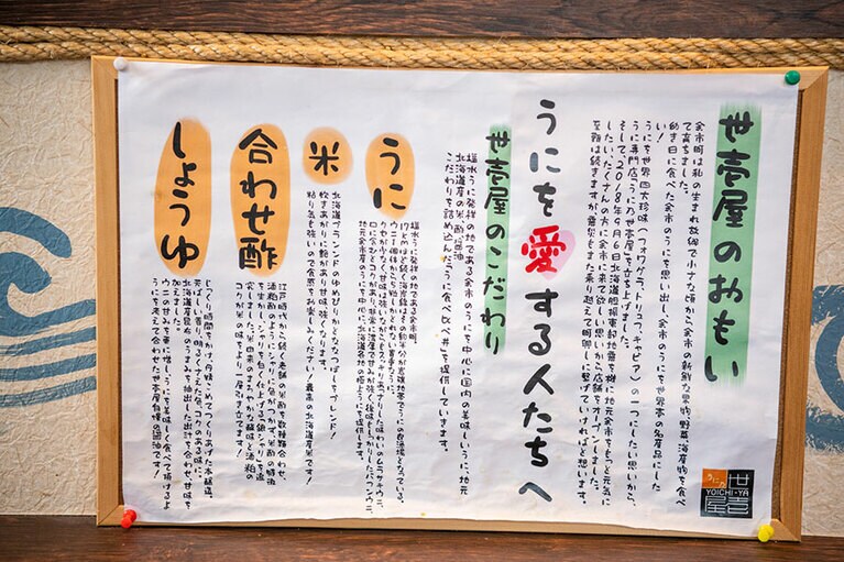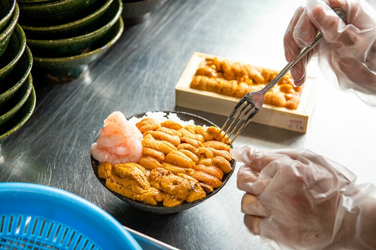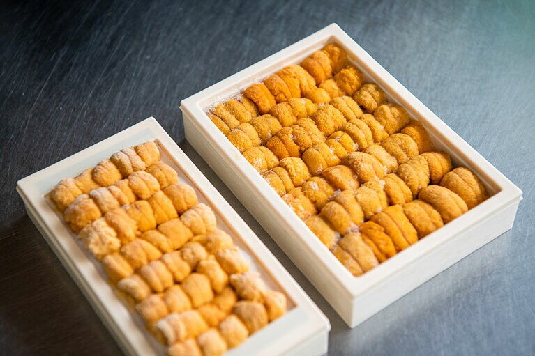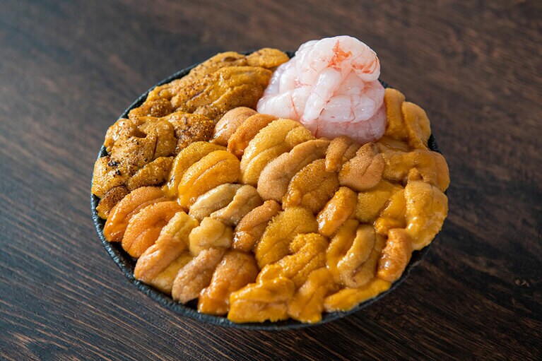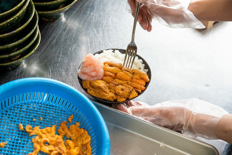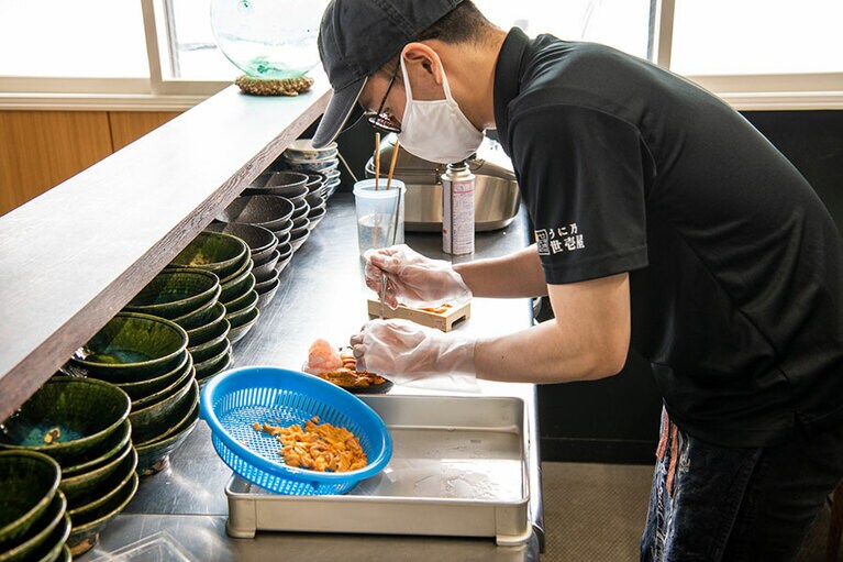 「余市産うに食べ比べ丼」7,150円。ムラサキうにとバフンうにの生と炙りがてんこ盛り。余市産の甘エビもオン。余市で獲れたヘラガニの味噌汁付き。 店長の加藤修平さんとスタッフの名越倫子さん。二人とも、うに好きが高じて入社したという。 スタート当初はこの建物の1階の一角だけだったのが、評判を呼び、いまでは2階も含めて丸ごと「世壱屋」となった。 うにを堪能してもらうために、盛り付けの美しさも重要。うにを丁寧に敷き詰めていく。 余市のうに漁は船の上に横になって箱メガネを覗きながらひとつひとつ採っていく。 「世壱屋」が開発した独自製法によって旬のおいしさそのままに冷凍保存することに成功した「熟成うに」80g 3,780円~。 供された時は、あまりのボリュームに驚くけれど、いざ食べ始めると箸(スプーン)が止まらない。