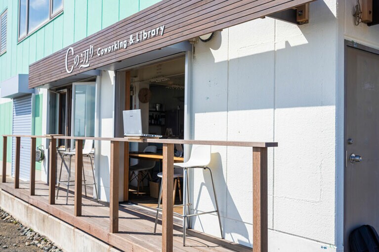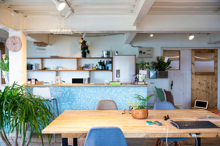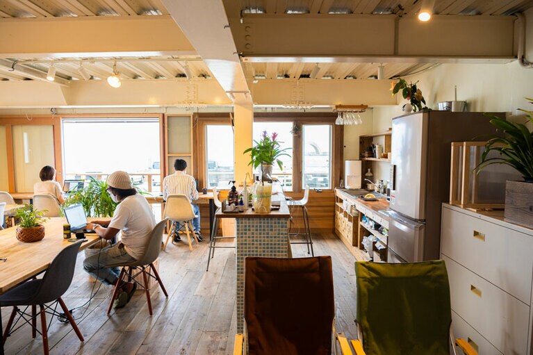 茅ヶ崎・サザンビーチのシンボル「茅ヶ崎サザンC」。 平日の午前10時頃にお邪魔してみると、すでにワークスペースには5名ほどの利用者が。皆さん仕事に集中しています。 ウェブ会議にぴったりな個室。 キッチンスペース。 リモート会議のお相手に目の前に広がる海を見せたら「いいなあ……」と羨ましがられました。 クッション付きの小さなパソコンデスクも貸し出し可。 オーナーの池田さんご夫妻。