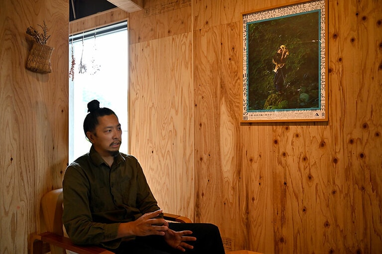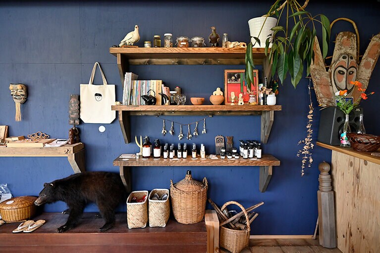 2014年に開催された「みちのおくの芸術祭 山形ピエンナーレ」のプリミティブなインパクトがあるポスター。 月山メイプルシロップ各6,480円。2月から3月の3週間しか採れない樹液を使った希少価値のあるシロップ。 月山のふきのとう味噌各648円。春一番の香り豊かな山菜の代表。 「yes.」のボディオイル各¥3,300、アロマスキンクリーム各2,750円。 山トランプ 1,540円。東北の神話や民話などをモチーフにした絵を版画に起こしたデザインに。