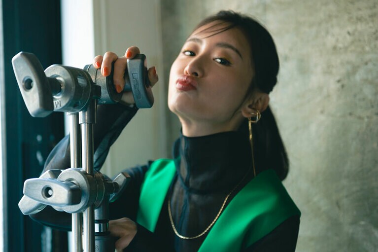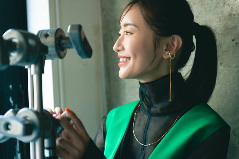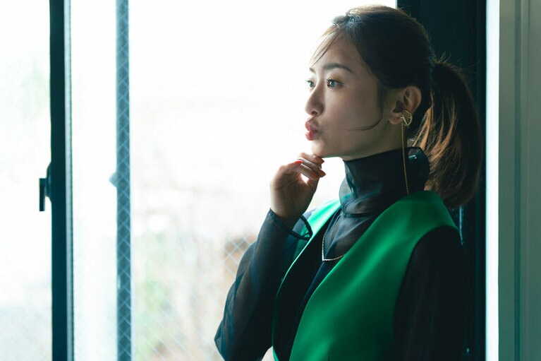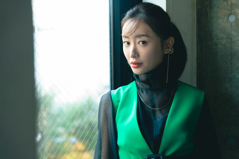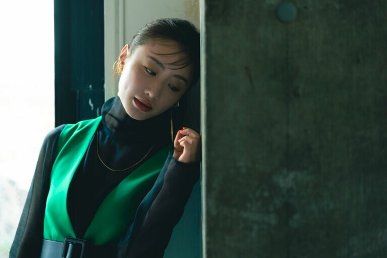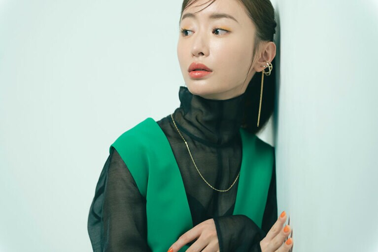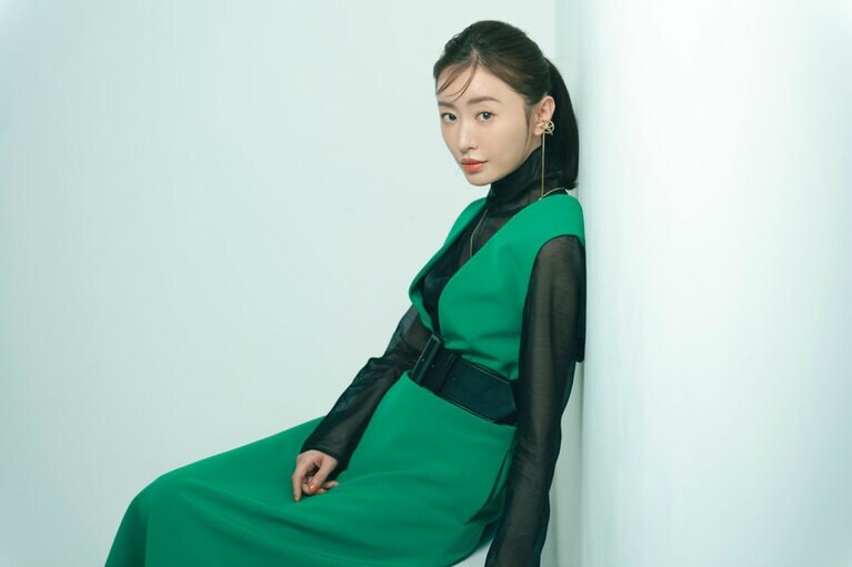 ワンピース 50,600円、ブラウス[ニットとアンサンブル価格]47,300円(ともにアドーア 03-6748-0540)、イヤカフ[左耳]8,800円 イヤカフ[右耳・2Pセット]11,000円、ネックレス 9,900円(すべてD.U.E/e.m. PRESS ROOM 03-6712-6798)、パンプス 29,700円(ヘンリエンヴァーゴ×エストネーション/エストネーション 0120-503-971) 『MIRRORLIAR FILMS Season2』より紀里谷和明監督作品『The Little Star』©2021 MIRRORLIAR FILMS PROJECT ©2021 MIRRORLIAR FILMS PROJECT ©2021 MIRRORLIAR FILMS PROJECT ©2021 MIRRORLIAR FILMS PROJECT ©2021 MIRRORLIAR FILMS PROJECT ©2021 MIRRORLIAR FILMS PROJECT