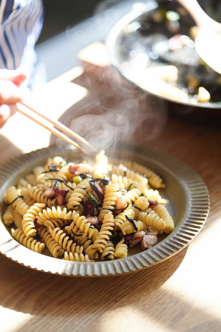 キッチンを中心としたダイニングが、広沢さんの仕事場。グレイッシュなブルーのタイルは多治見から取り寄せたもの。 糸島の食材を引き立てる、糸島の調味料。新三郎商店の「またいちの塩」と、ミツル醤油の「生成り」はキッチンに欠かせない。 庭にワサワサと茂っているフェンネルの葉を摘み今日の料理に。 この家に移り住んで10年。オリーブなどの植栽もすっかりなじんだ。 3歳から糸島暮らしの息子さんは少年野球の選手で今年から中学生。「いずれは糸島を出て、世界を見てきてほしいですね。そうすれば、ここの良さも改めて分かると思うから」 摘みたてのあまおう 820円。 陽の光をたっぷり浴びて甘みを蓄えるいちご。 広沢さん考案のスムージー 580円は、お隣佐賀の村山牛乳を使用。 採れたての野菜はみずみずしく、生でかじってもイケる。 新生姜の出荷は例年8月ごろから。 生命力溢れる畑で野菜談議に花が咲く。