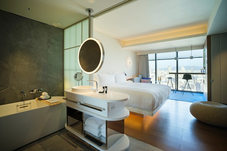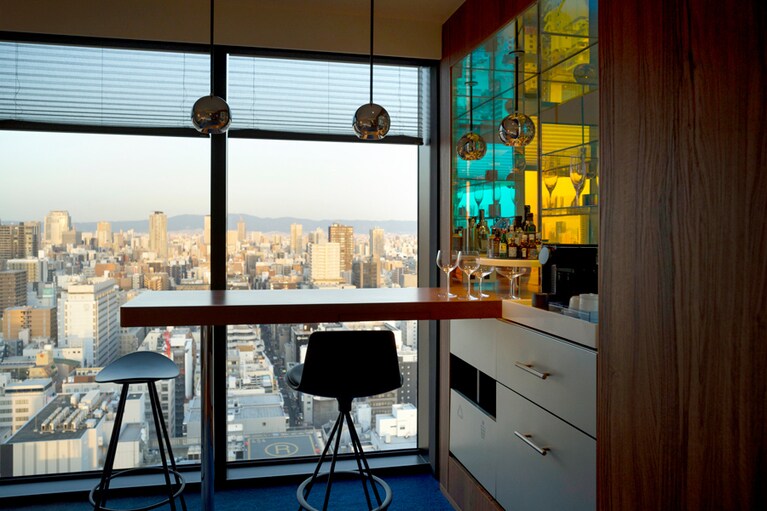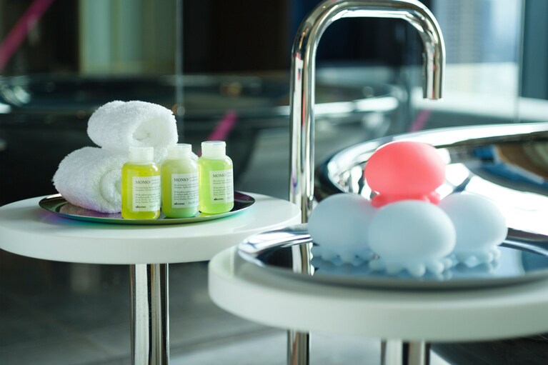 黒い建物に数百個のクロームボウルでできた「W」のロゴが映える。 1階エントランスと外をつなぐトンネル。ここから別世界へ! イベントやパーティが開かれるLIVING ROOM。 左:「ハイビスカス フィズ」、右:「リビングルーム“G&T”」各2,280円。 本格的な設備のDJブース。大きなソファとカラフルなクッションが「W」らしい。 インテリアデザインはオランダのコンクリートアーキテクチャルアソシエイツ社が担当。 ベッドボードはテキスタイル作家、シグリッド・カロンの作品。 新しい施設だけに、器具も最新。 朝・昼・夜の食シーンに。窓の外は御堂筋の並木道。 「ボタン海老・グリーンアスパラ・苺」。13,000円のコースから。 新登場のシグネチャーカクテル「POM DE MER」。2,800円 パンは好きなものを好きなだけ! 一番人気の「エッグベネディクト」。アボカドソースが特徴。アメリカンブレックファスト4,800円から。 メインのセレクトのひとつ「チーズカンパーニュトースト」。左はパルメザンチーズが、右はクリームチーズにナッツのはちみつ漬けがたっぷり。 ゲストを外で出迎えてくれる猫はKARAのアイテム。 ウェルカムプレートはリアルなレコード。ほかにソファ席も。 「ロックンロール」1,450円。 「船場裏路地」への入り口。「W大阪」とはまた違った異世界感あり! 「小倉屋山本」直営。だし巻き玉子などのランチも人気だ。 左上から時計回りに:昆布焼酎(ロック)680円、あさりの酒蒸し 700円、昆布じめ盛り合わせ 700円、ホタルイカとタラの芽 ぬた和え 700円。 数寄屋風のこぢんまりとした店内。凛とした雰囲気。 マグロ赤身のヅケ。この日は和歌山産天然マグロを使い、さっとヅケに。おまかせコース 13,200円から。 焼き場を囲むカウンターのほか、個室もある。 左上から時計回りに、タタキ、むね、ねぎみ、ささみ。5,000円のコースから。 カウンターに立つママ、高橋愛さん。 どこまでも赤い空間に骨董が映える。混雑時はもう一室の「青い部屋」も。 梅酢サワー880円。チャージは1,000円で、「小倉屋山本」の塩昆布(右)が出ることも。