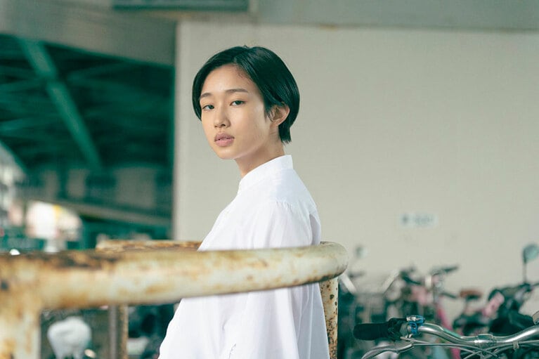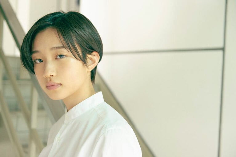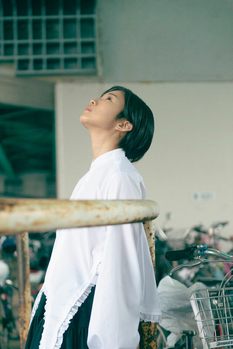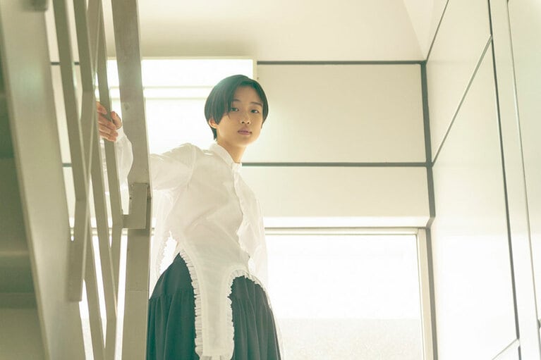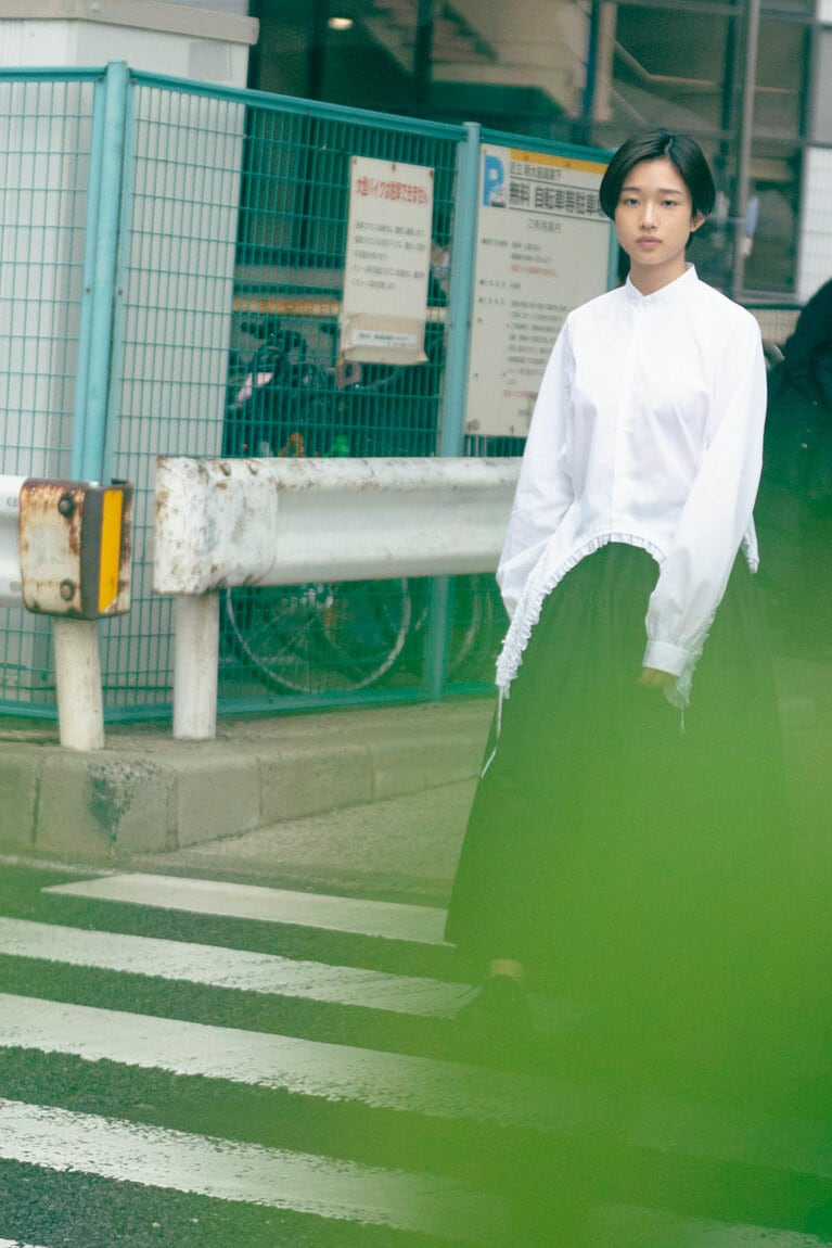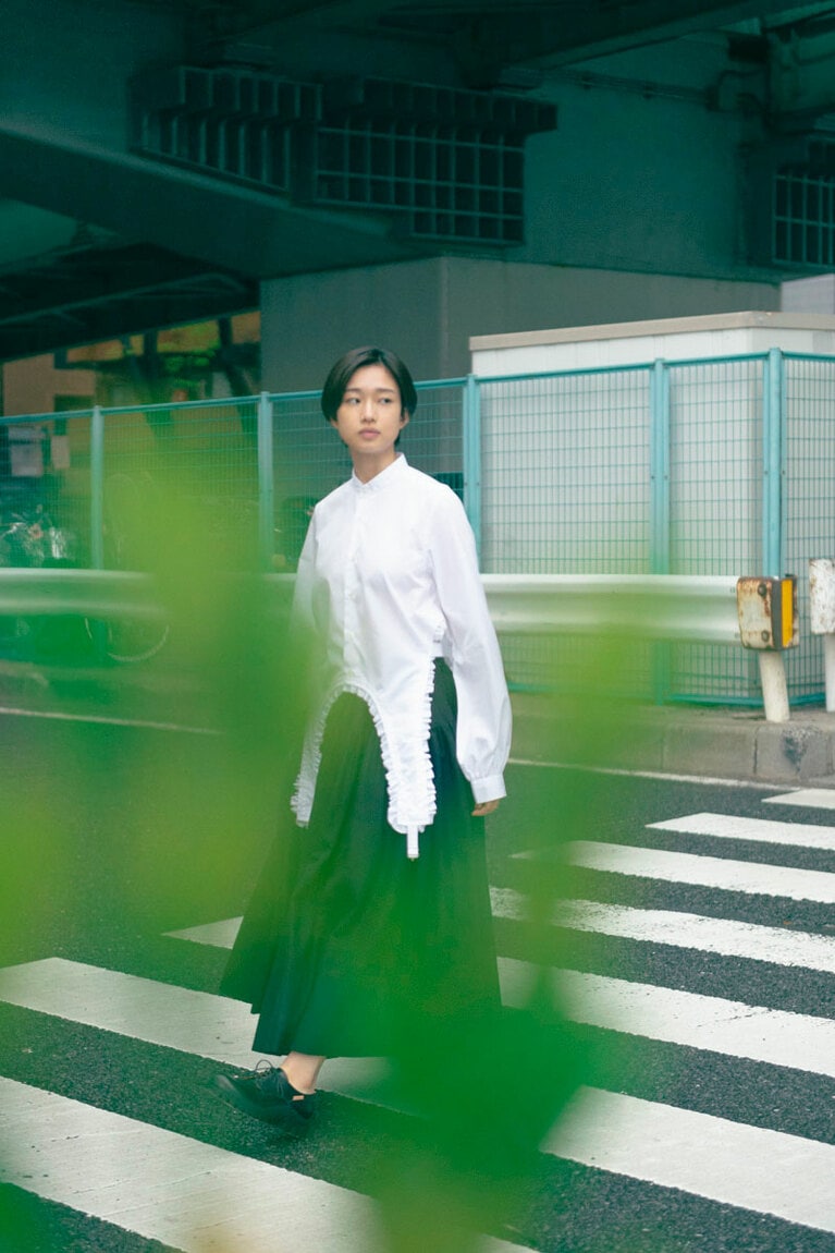 ブラウス 53,900円、スカート 69,300円(ノワール ケイ ニノミヤ/コム デ ギャルソン 03-3486-7611)、シューズ 55,000円(エンダースキーマ/スキマ 恵比寿 03-6447-7448)