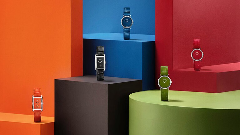 左から、クラシックブラック、スプリンググリーン、コバルトブルー、カーマインレッド、バーントオレンジ。クォーツムーブメントL176.2 (ETA 980.163)、時/分機能、6時位置にスモールセコンド、レクタンギュラー型、23.30 x 37.00 mm、ステンレススティールケース、ブラックまたはグリーンまたはブルーまたはレッドまたはオレンジカラーラッカーポリッシュドダイアル、ポリッシュドシルバー針、3気圧 防水(30メートル)、サファイアクリスタル、ブラックまたはグリーンまたはブルーまたはレッドまたはオレンジカラー尾錠付きアリゲーターストラップ、インターチェンジャブル。予価176,000円。