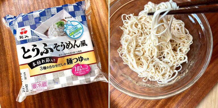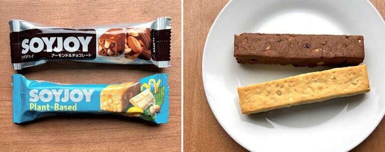 この2品、セブンイレブンの冷蔵コーナーに並んで売られていますが、製造元は違います。 ●「セブンプレミアム 枝豆とひじきの豆腐バー」170円。エネルギー163kcal、たんぱく質10.7g、脂質10.7g、糖質5.3g、食物繊維1.4g。製造:アサヒコ。 ●「がんもバー」149円。エネルギー125Kcal、たんぱく質10.3g、脂質8.0g、糖質2.2g、食物繊維1.1g。製造:相模屋食料。 ●「とうふそうめん風」237円(編集部調べ)。麺状とうふ150g、添付つゆ18g。エネルギー108kcal/85kcal、たんぱく質6.3g/5.6g、糖質11.6g/6.5g、食物繊維2.4g/2.4g。 ●「ごまつゆで食べるとうふそうめん風」237円(編集部調べ)。麺状とうふ150g、添付つゆ15g。エネルギー115kcal/85kcal、たんぱく質6.5g/5.6g、糖質10.2g/6.5g、食物繊維2.9g/2.4g。 ※数字は、「(麺状とうふ、つゆ含む)/(麺状とうふのみ)」 ●「ソイジョイ アーモンド&チョコレート」 30g 115円(税抜/希望小売価格)。エネルギー145kcal、タンパク質5g、糖質7.6g、食物繊維4.6g。 ●「ソイジョイ プラントベース ホワイトチョコ&レモン」 25g 115円(税抜/希望小売価格)。エネルギー129Kcal、タンパク質6g、糖質5.7g、食物繊維2.7g。