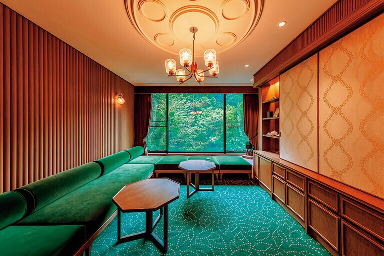 和洋折衷の気品ある料理を華やかな切子の器などでいただく「日本料理 節中」のコース。日光にまつわる食材を目の前で焼き上げる鉄板焼きも選べる。 和洋折衷の気品ある料理を華やかな切子の器などでいただく「日本料理 節中」のコース。日光にまつわる食材を目の前で焼き上げる鉄板焼きも選べる。 「ふふ ラグジュアリープレミアムスイート」のリビングルーム。上質なソファと自然を満喫できるテラスが魅力。 全室に自家源泉の温泉が。内風呂は木の香り漂う癒やしの空間。
