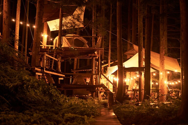 森に溶け込むかのようなこのツリーハウスは元の森の姿に戻せるよう、木に穴を開けないサンドイッチ工法で建てられている。宿泊は1日1組限定、6名からの利用。¥50,000(1人)。ガイド込み。※ディナー、サウナ、サップ体験などは別途追加オプション 森林浴をして過ごすことができるテント。 ライフ ファーミング キャンプの菜園で育てられたほうれん草は柔らかく甘い。 ミルフィーユ状に織り重なったブナの落ち葉。野沢の豊かな森が名水を生み出す。 湧き水をタンブラーに入れて。雪解け水は夏でも冷たく、柔らかい口当たり。 野沢温泉のシンボルともいえる大湯。温泉街の中心にあり、江戸時代の趣を現在に伝える美しい湯屋建築が目を引く。 旅のしおりと、外湯めぐりのパンフレット。岡本太郎もこの野沢温泉を愛したという。 レクチャーを受けてテントを組み立てる。中は広々、快適な空間だ。 日が暮れると柔らかな光がグリーンフィールドを優しく包む。 左)テーブルには旬の食材がずらり。右)畑や村で採れた野菜は、シンプルにローストしていただく。 左) 旬の根曲り茸がたっぷり入った炊き込みごはんは至高の味。右) 焚き火を囲んでワインを。 朝は坐禅で心を整える。 早朝の境内。座禅が終わると日が昇り気持ちいい青空が広がっていた。 左)山の新鮮な空気を目一杯に吸い込む。右)野沢温泉の台所とも言われる大釜では、昔からここで山菜や野菜などをゆでて温泉を活用していた。 野沢菜のおひたし、根曲り茸の和物などお野菜たっぷりの朝食。 Eバイク楽々移動。15分ほどで湖へ到着。湖畔にはサウナも。 サウナ内はレッドシダーの香りに包まれ、高いリラックス効果を得られる。