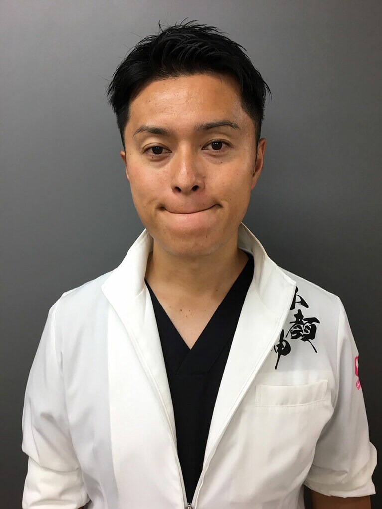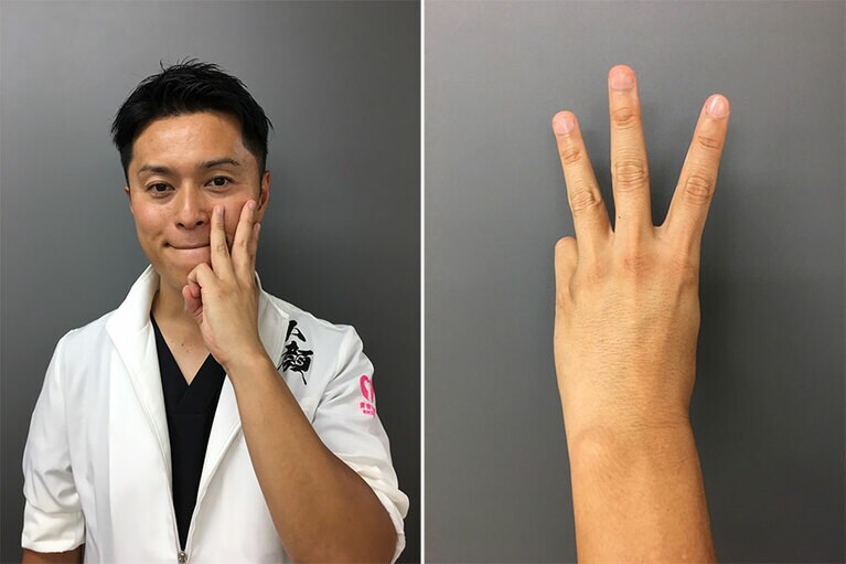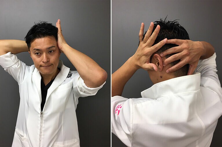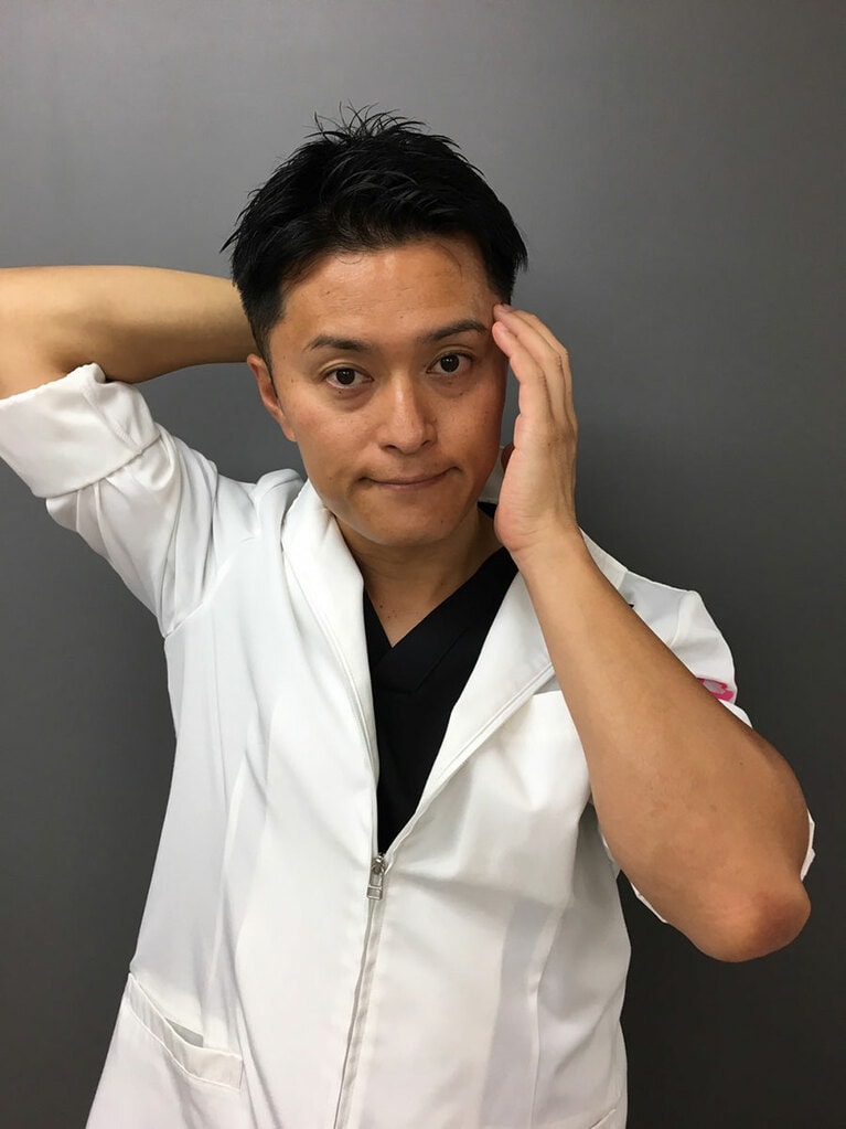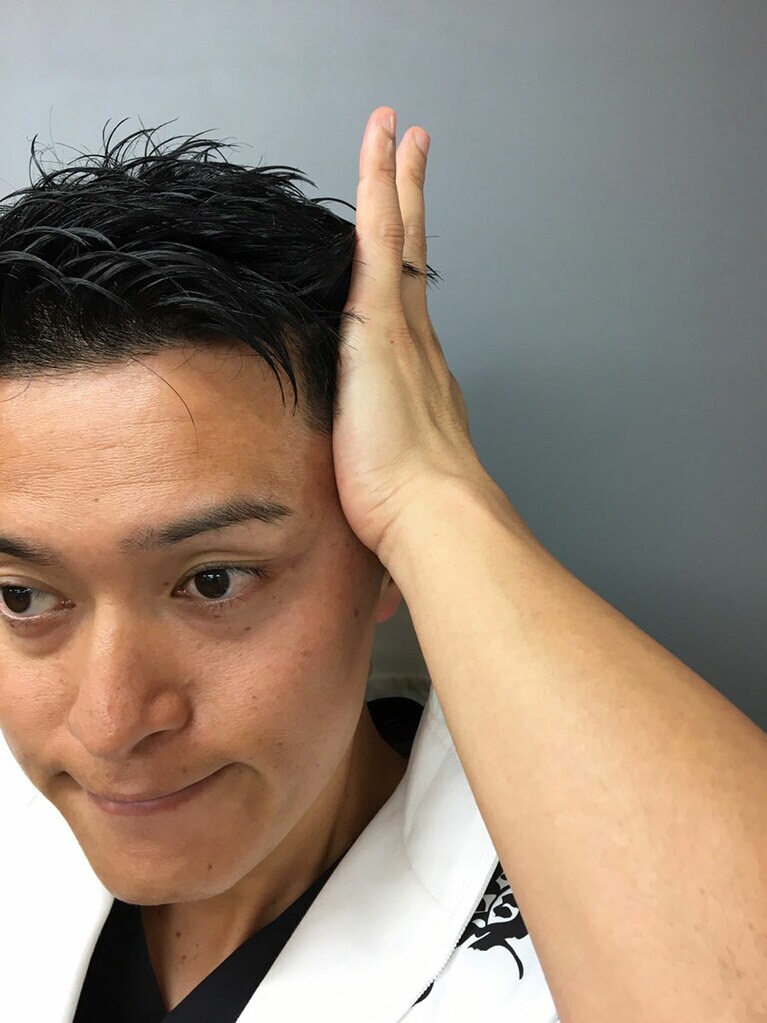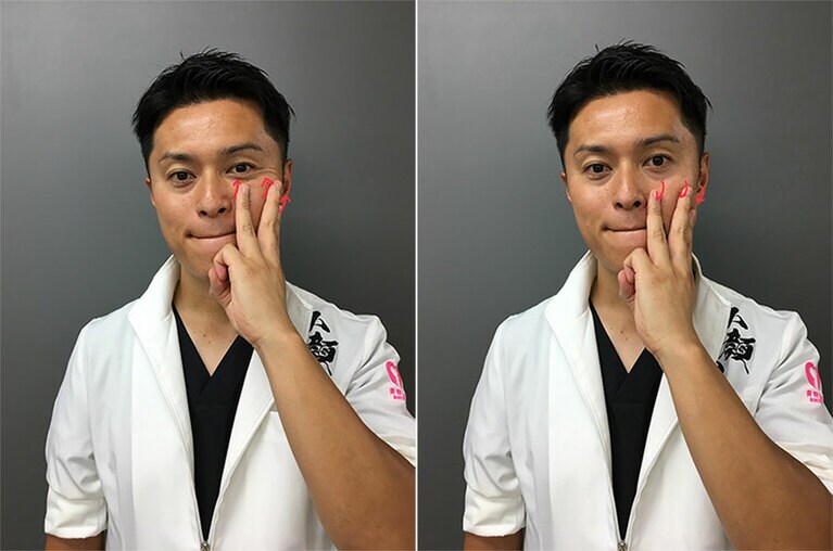 小顔神HIRO先生。「美ボディも美顔も、まずは骨を正しい位置に戻してから」と先生。 Aが上唇挙筋、Bが小頬骨筋、Cが大頬骨筋。全て口輪筋から頬に向かって伸びている。 唇の中心に時計を置いたとイメージして、1時と1時半、2時の位置に指を置く。反対側は、10時・10時半・11時の位置。 赤で囲った場所が側頭筋の位置。 側頭骨は頭蓋骨の一部で、耳の辺りに位置する。赤で囲った辺りの骨を押さえる。
