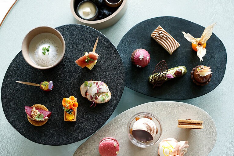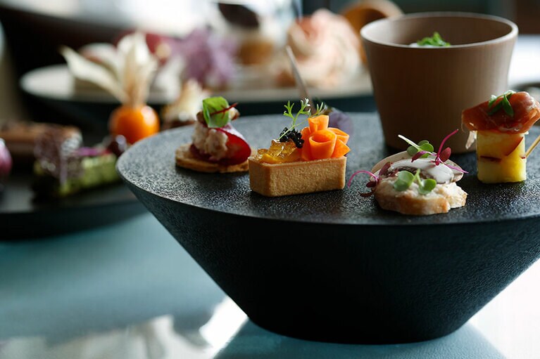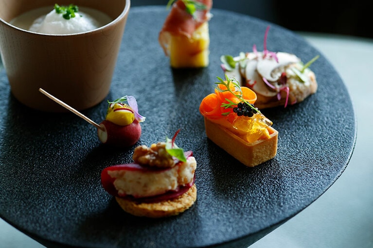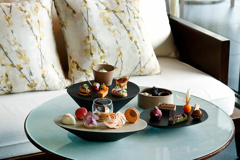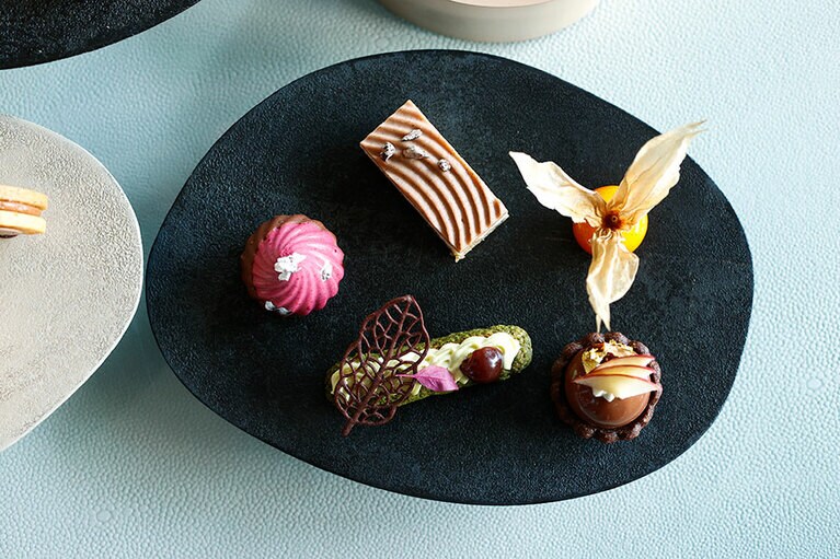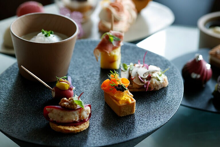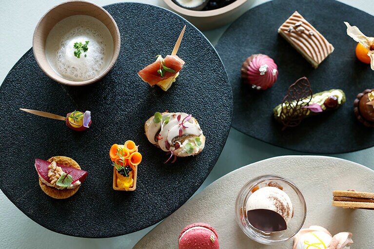 塗師 赤木 明登(あかぎ・あきと)●編集者を経て1988年に輪島へ。輪島塗の下地職人・岡本進のもとで修業後、1994年に独立。現代の暮らしに息づく生活漆器「ぬりもの」の世界を切り拓く。ドイツ国立美術館「日本の現代塗り物十二人」に選ばれ、国内外で高い評価を受ける。 ほおずき アプリコットとヴァニラのパート ド フリュイ/カシスのムース/ピスタチオのエクレア/タルト ポム/栗 グリュエ ド カカオの糖衣がけ/洋梨のジュレ。 ババ オゥ ラム コーヒー風味のクリーム/全粒粉を使った塩サブレ プラリネのガナッシュクリーム/メープル風味のムラングシャンティイ オレンジのジュレ/ブルーベリーチーズケーキ/「菓匠 菊家」の練り切り(※二十四節季毎にメニュー変更)/紅茶風味のマカロン 紅茶のバタークリーム。 竹炭とカカオのスコーン クロテッドクリーム 葡萄のジャム。 寿月堂の抹茶「初昔」 ※善昇窯でつくられた清水焼のオリジナル野点碗で提供。パレスホテル東京 オリジナル落雁。 ラディ オ ブール 柚子風味/舞茸のヴルーテ/人参のタルト/サーモンのリエット マッシュルームのサラダ/ビーツ 林檎 胡桃とフロマージュブランのカナッペ/サツマイモとリゾーニのテリーヌ レモン風味/玉子とトリュフのフォカッチャサンドウィッチ。 1名 8,000円、グラスシャンパーニュ付き 10,400円(消費税込・サービス料別) ※一日限定20食。