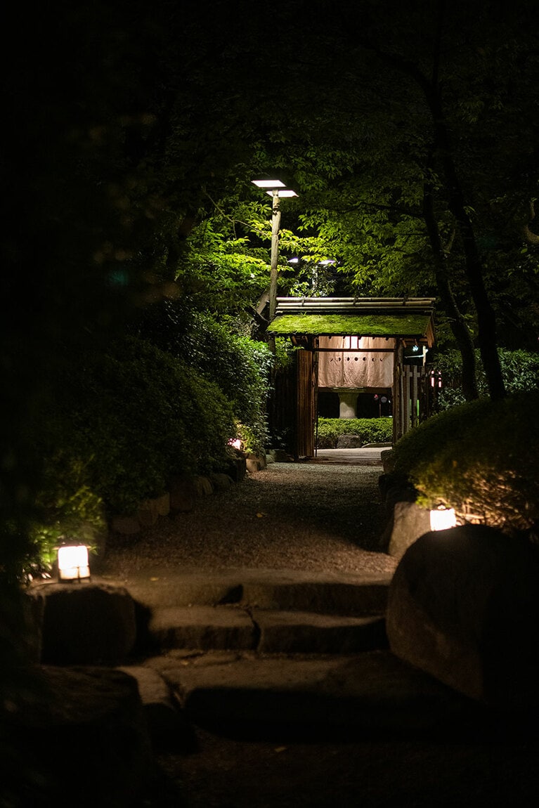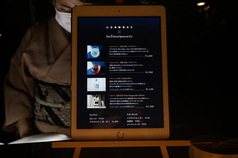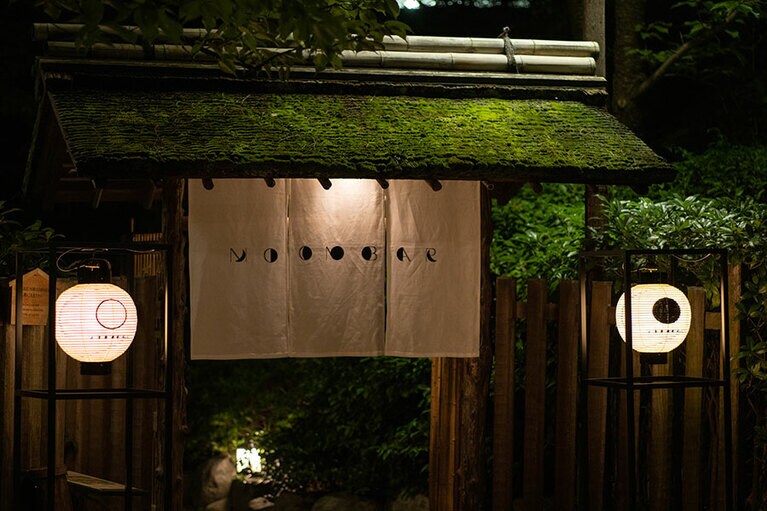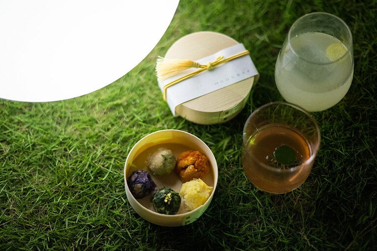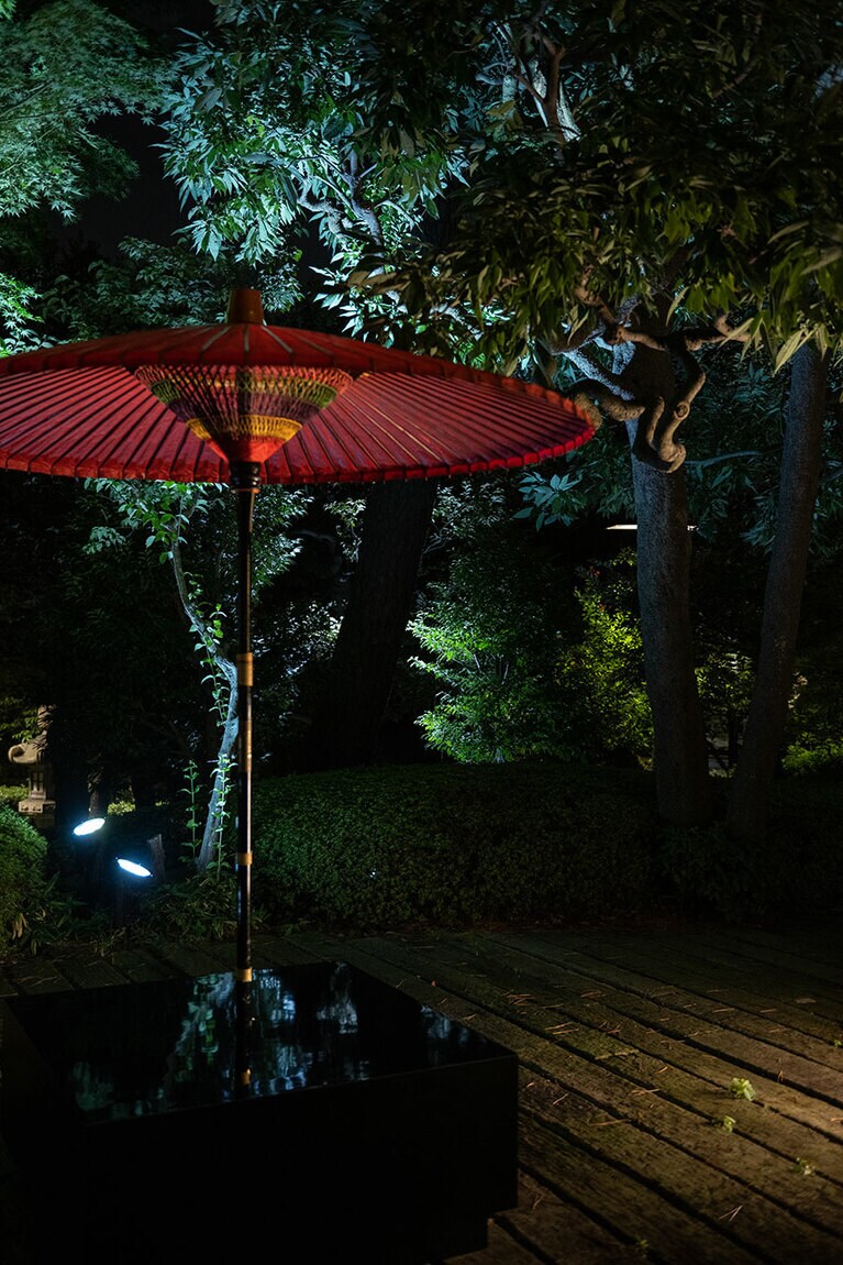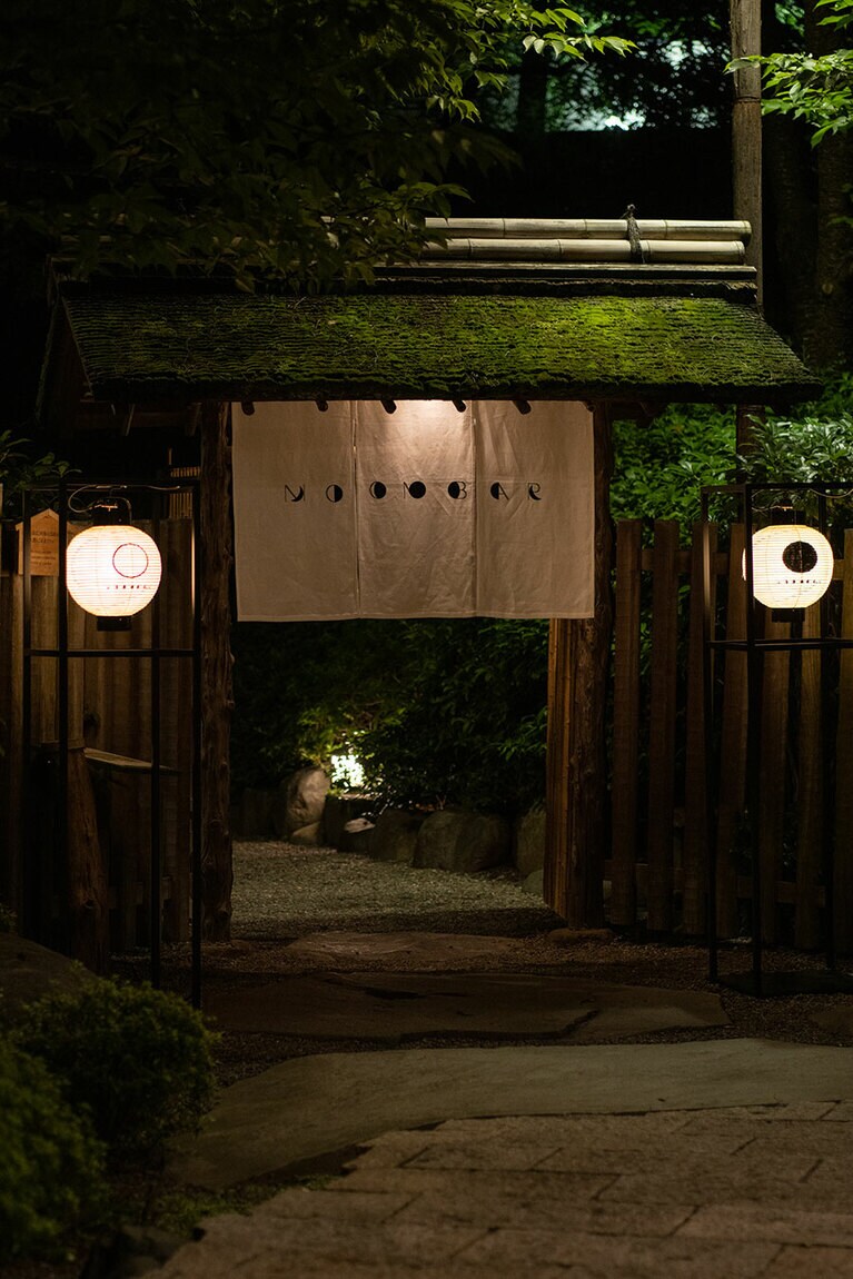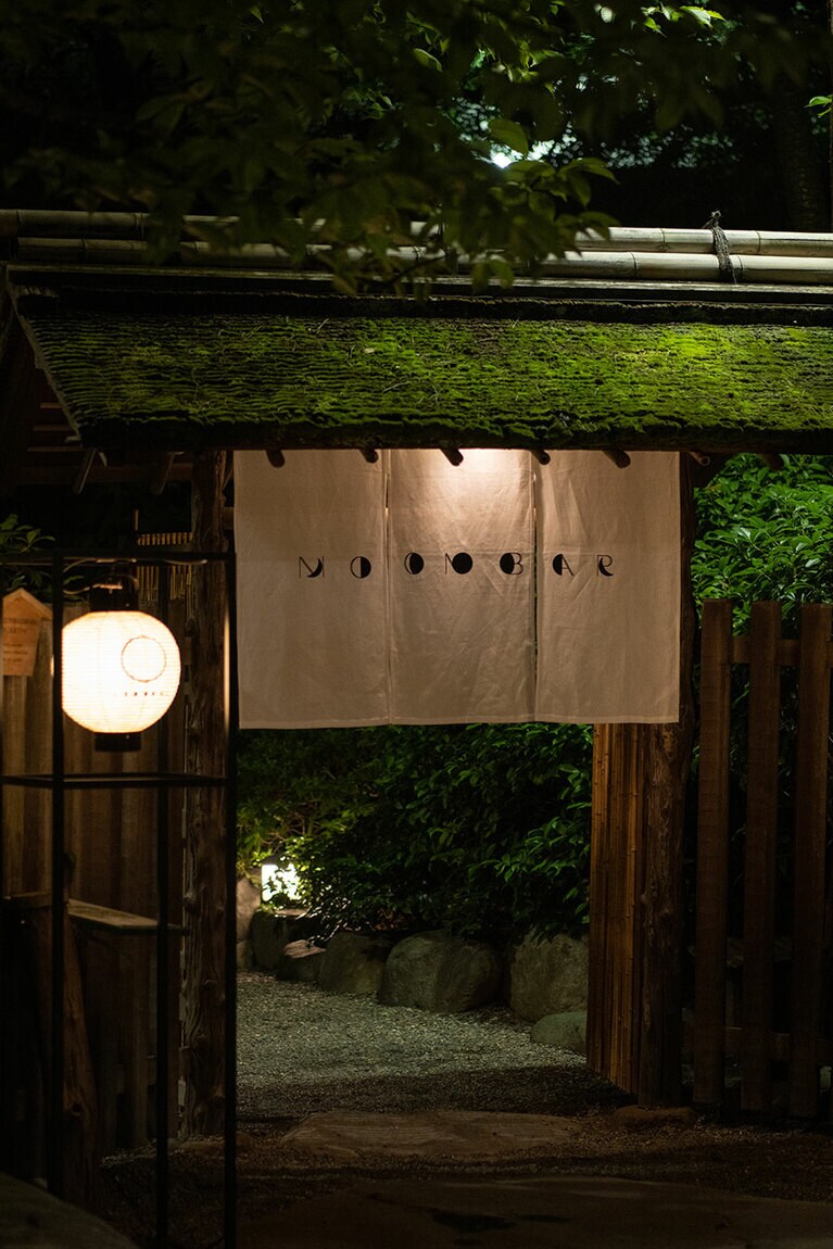 ライトアップした庭園「Moon Light -光の庭-」。お琴の演奏もある。 厳かな門構え。 普段はなかなか入る機会がない壺中庵。 緑豊かな場所。 オリジナルカクテルの「月見日和」(奥)1,600円と「梅見心地」(手前)1,500円。 特別メニュー「シーズナルボール」は参加費に含まれる。