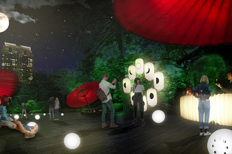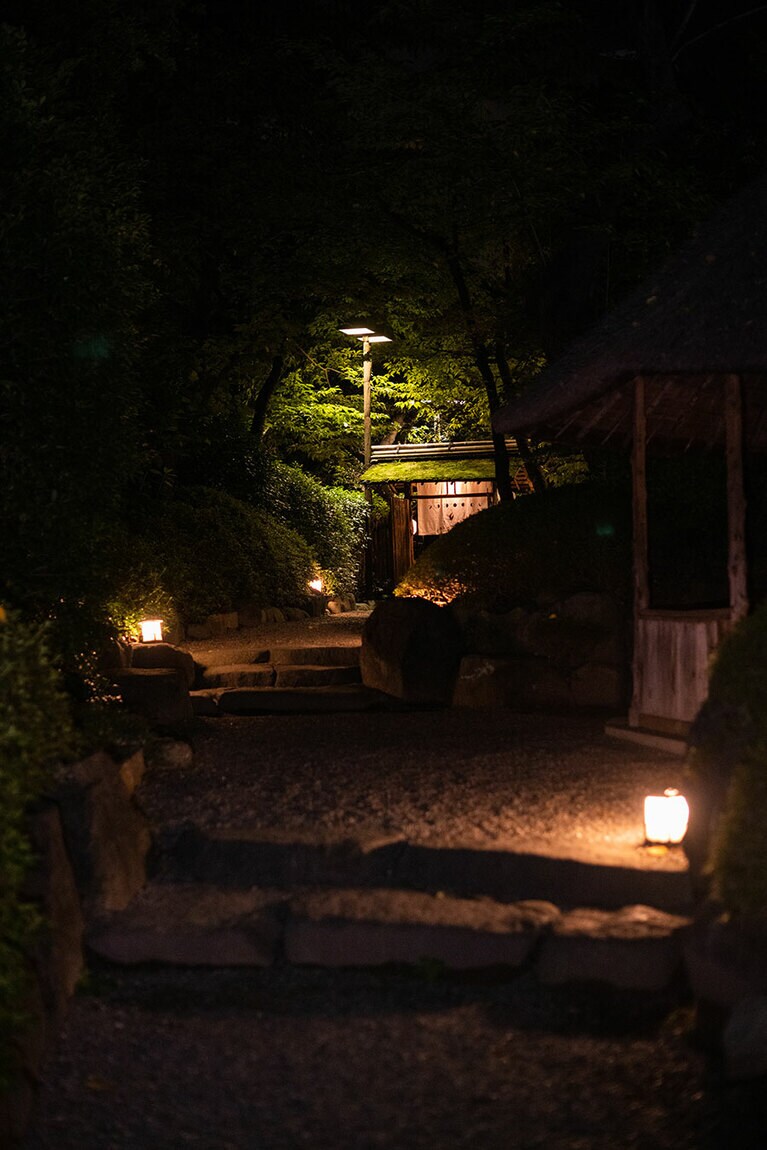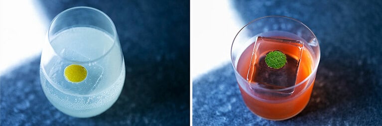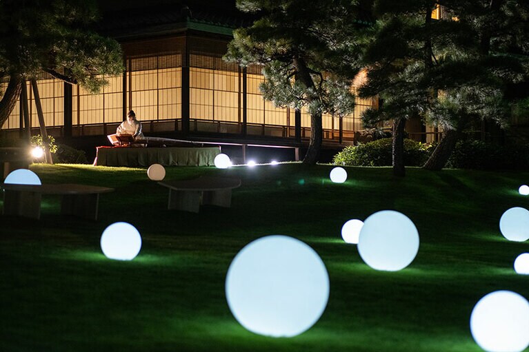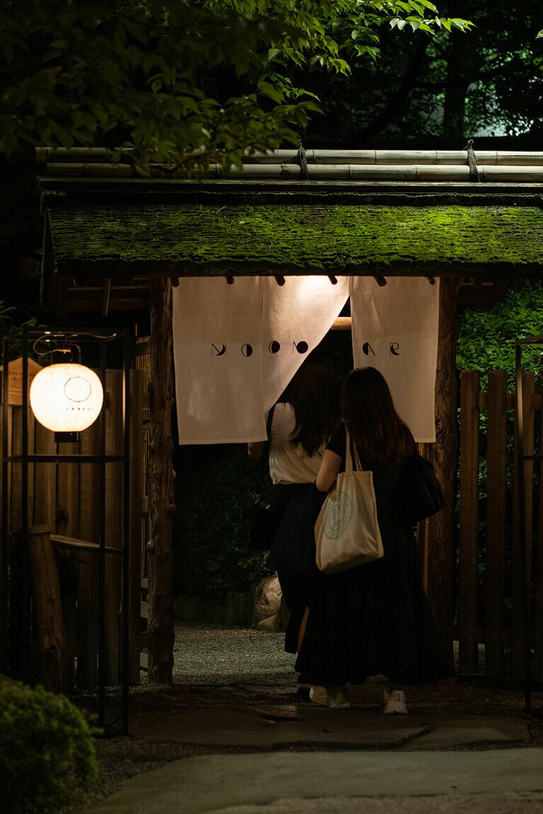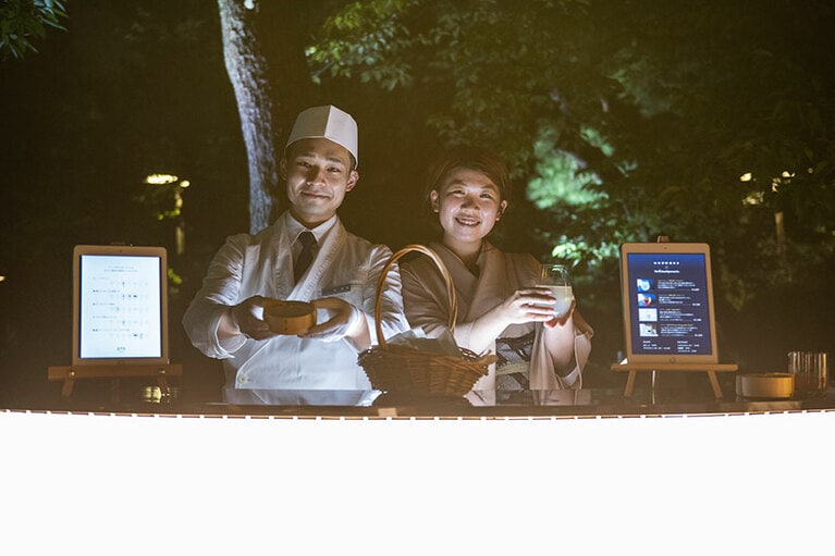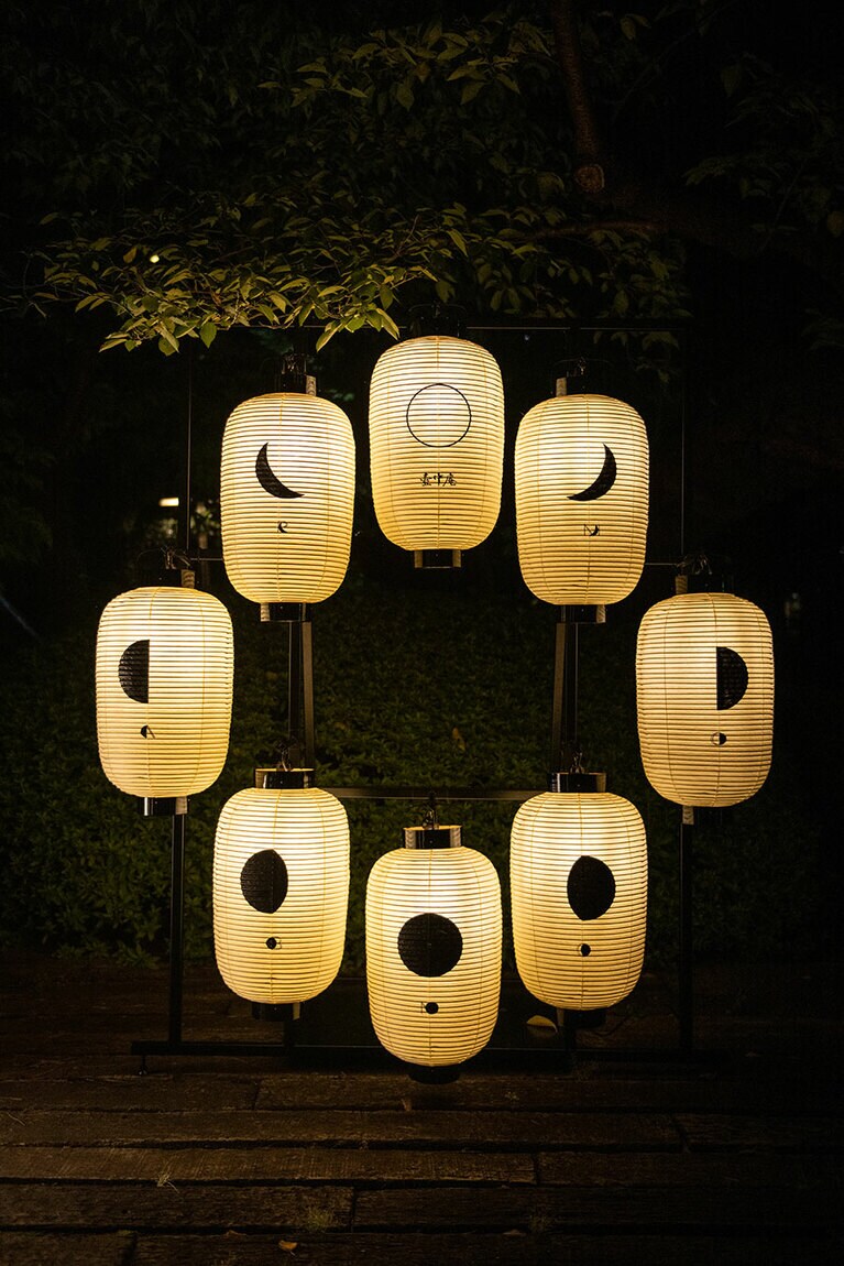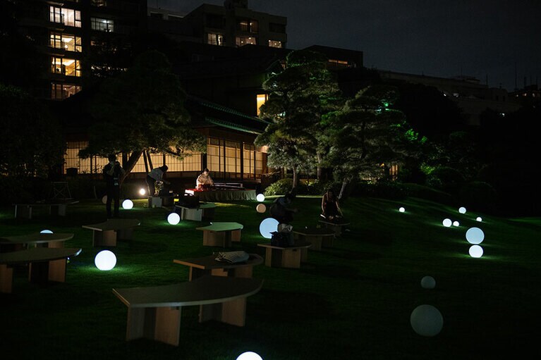 ライトアップした庭園「Moon Light -光の庭-」。お琴の演奏もある。 厳かな門構え。 普段はなかなか入る機会がない壺中庵。 緑豊かな場所。 オリジナルカクテルの「月見日和」(奥)1,600円と「梅見心地」(手前)1,500円。 特別メニュー「シーズナルボール」は参加費に含まれる。
