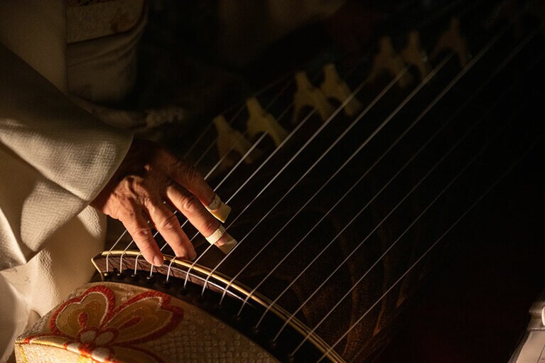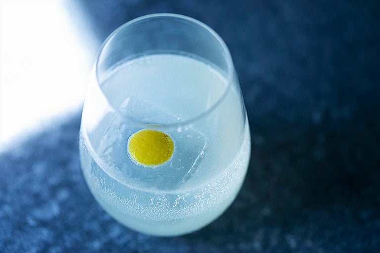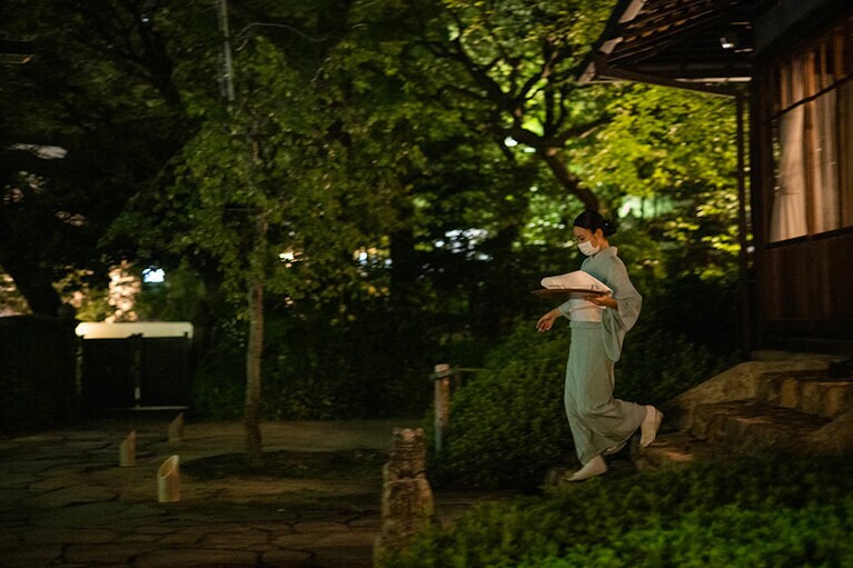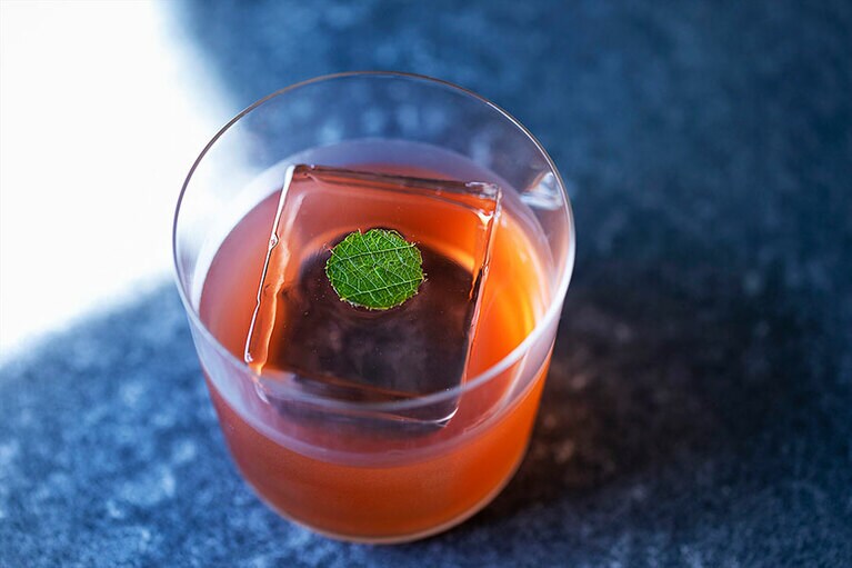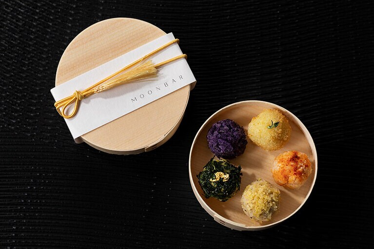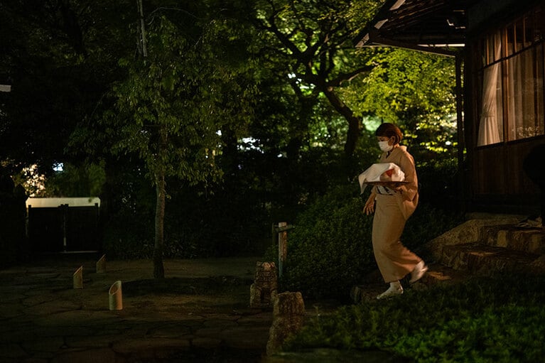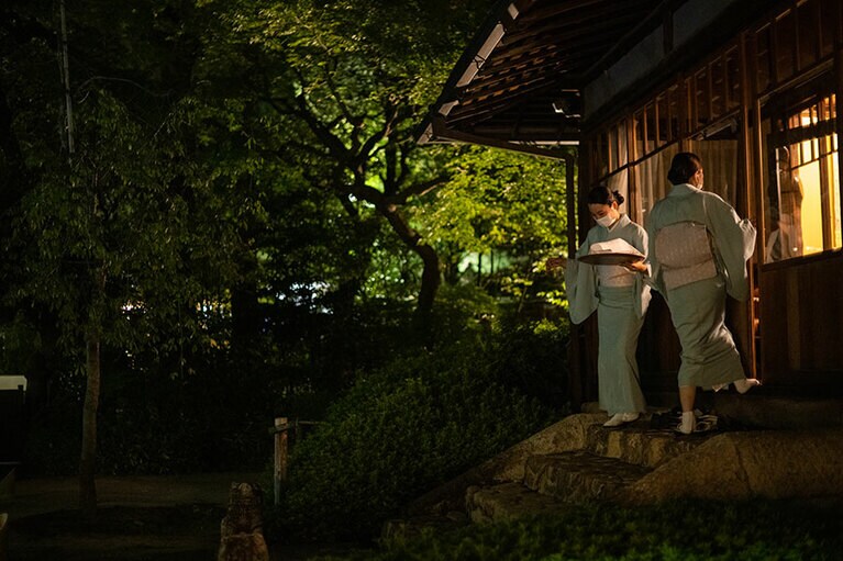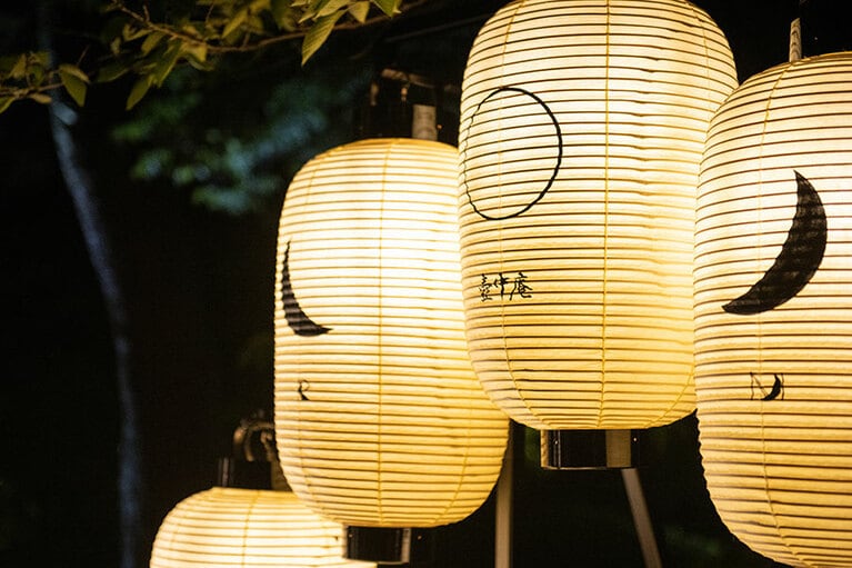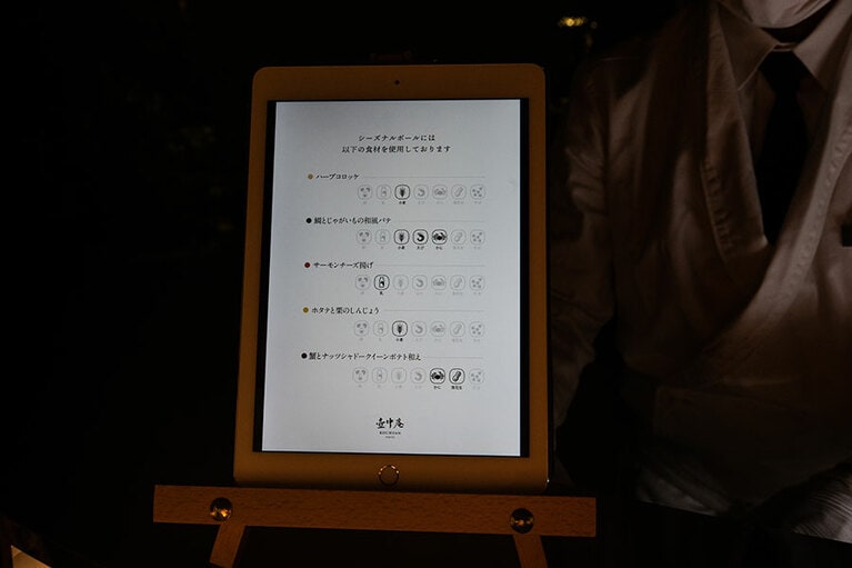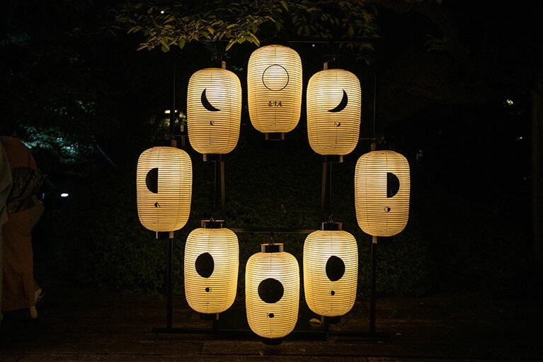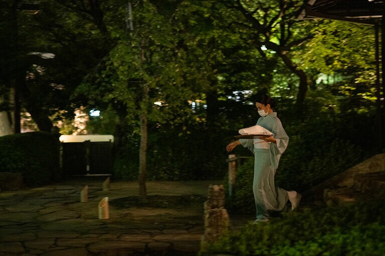 ライトアップした庭園「Moon Light -光の庭-」。お琴の演奏もある。 厳かな門構え。 普段はなかなか入る機会がない壺中庵。 緑豊かな場所。 オリジナルカクテルの「月見日和」(奥)1,600円と「梅見心地」(手前)1,500円。 特別メニュー「シーズナルボール」は参加費に含まれる。