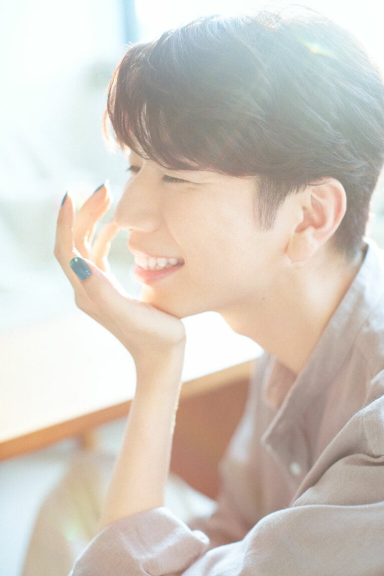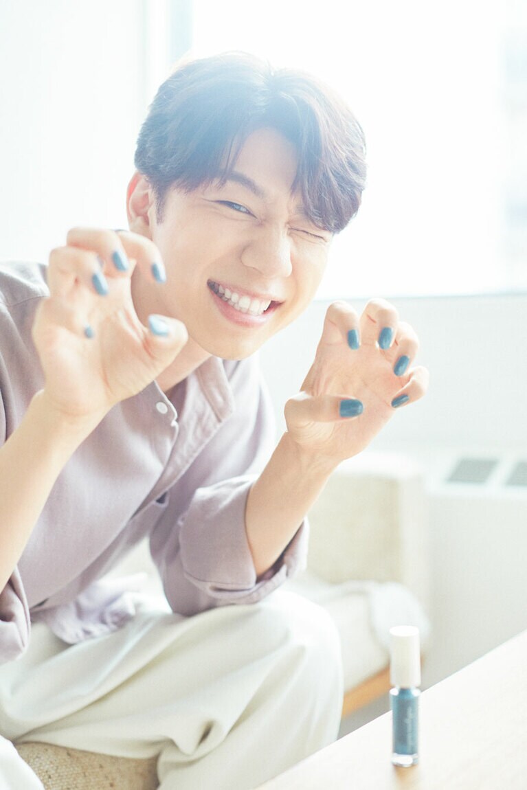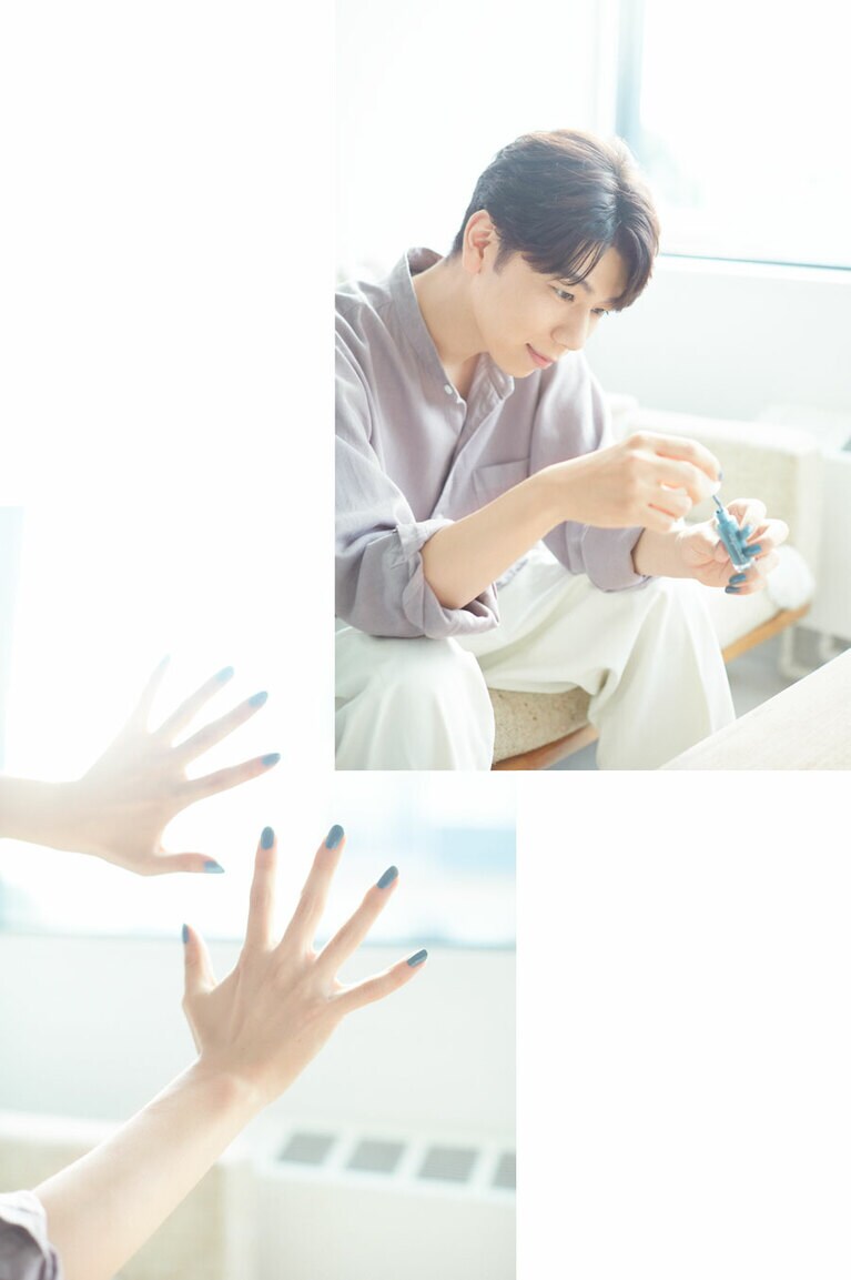 シャツ 35,200円/ヘリル(にしのや)、パンツ 30,800円/ニート(にしのや)、靴下 3,520円/ワイズ×シックストックス(ノーデザイン) 西山宏太朗さんプロデュースのネイルが誕生。「01日光浴」「02鐘の音」など色名も詩的! 写真で西山さんが塗っているのは「03 シティボーイ」。バビメロ マイフェイブネイル 全6色 各1,300円(ポーチ付きの3色セットもあり)/CREE`MARE 薬用スキンコンディショナーエッセンシャル N[医薬部外品]330mL 9,350円/アルビオン フラルネ ストリンギー ウォッシュ 120g 2,750円/アルビオン