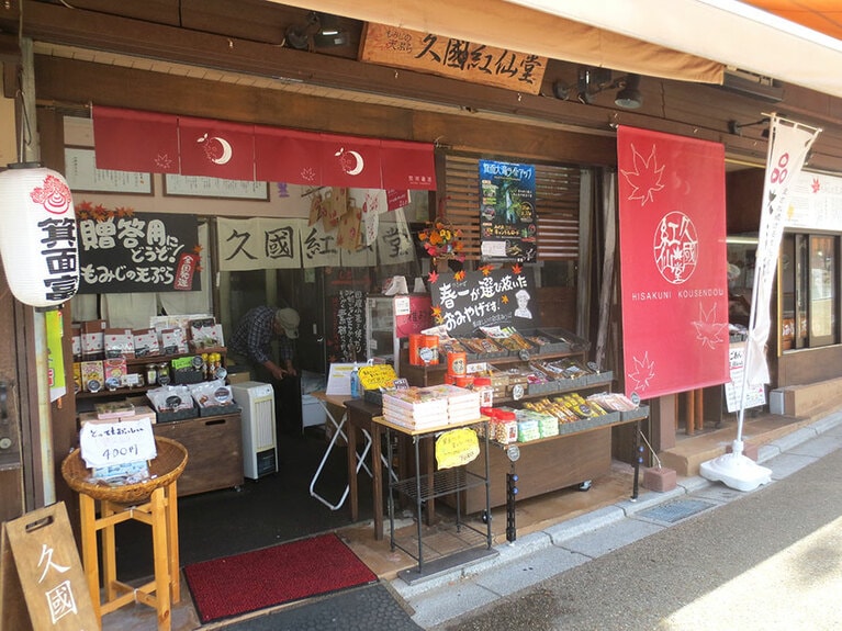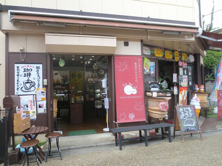 もみじの天ぷら。 1枚1枚揚げる「もみじの天ぷら」は、箕面名物。滝道では、1年中、何軒ものお店が目の前で揚げています。 もみじの形のまま、パリッと揚げるベテランの女将・久國節子さん。 所有している山から色づいた食用のもみじの葉を収穫して水洗いし、1年間塩漬けしたもの。 揚げる前に、流水で塩抜き。 こんがり色付くまでじっくり揚げます。 左上から時計回りで「伝統のプレーン」350円、「こっくり黒糖」420円、「豆好きのきなこ」420円、「ちょい辛七味」380円、「甘辛のしお」380円、「はんなりグリーンティー」420円。全て1袋の値段。 もみじの天ぷらは、日持ちがして常温で持ち歩けるのでお土産に最適。「もみじの天ぷら」60g 440円~。ギフト用90g 720円~。パッケージや紙袋のデザインも素敵。 「Cobeni店」の責任者・久國香保里さんは、新商品の開発に熱心に取り組む。 1枚ずつていねいに形を整え、水気を拭いてから油で揚げます。 左上から時計回りで「伝統のプレーン」「こっくり黒糖」「豆好きのきなこ」「ちょい辛七味」「甘辛のしお」「はんなりグリーンティー」。 「もみじの天ぷら個包装」12枚980円、24枚1960円。全てプレーン味。 ひと口サイズの「もみじの天ぷら こつぶ」1袋 60g 590円。欠けたり曲がったりした「わけあり天ぷら」1袋180円。どちらもプレーン味。 「Cobeni」で味わえる「もみじソフトクリーム」400円。もみじの天ぷらを添えて。銀座の老舗「パウリスタ」のブレンドコーヒー300円がイートインやテイクアウトで飲める。