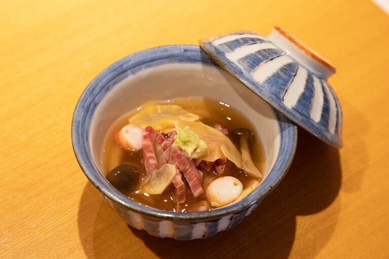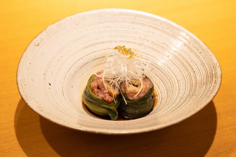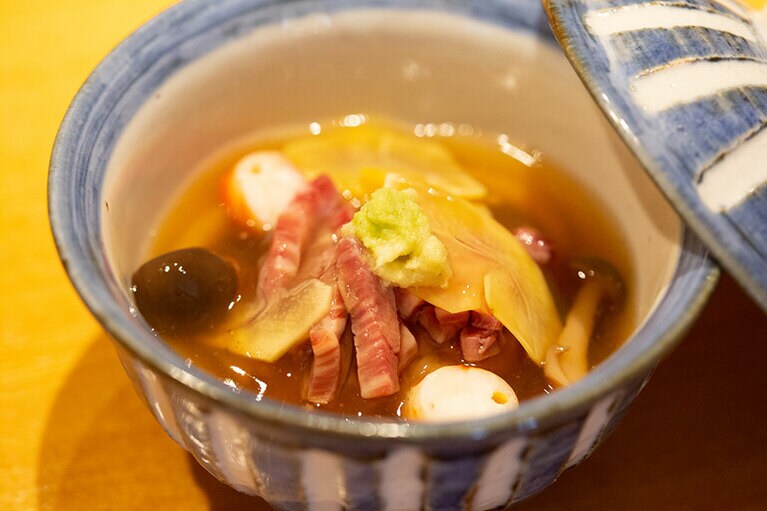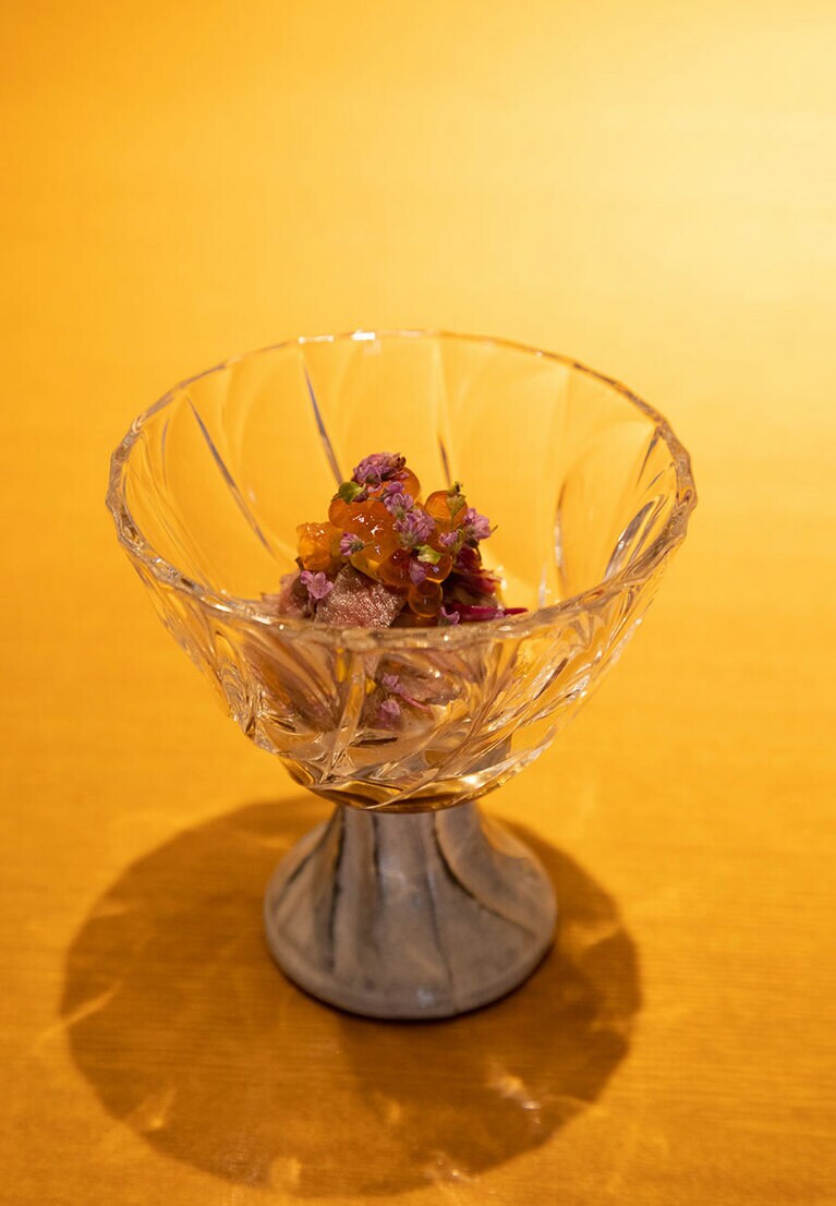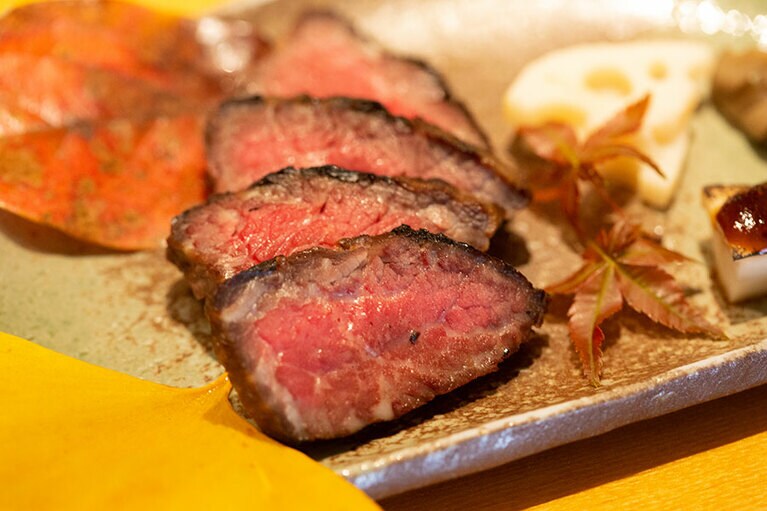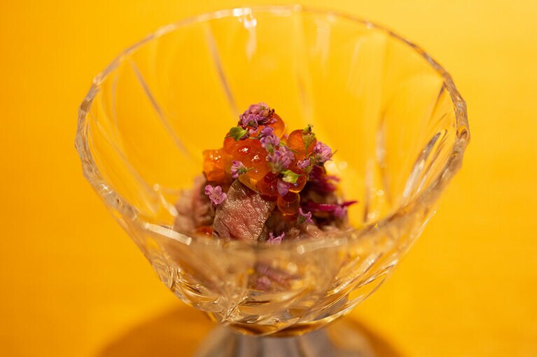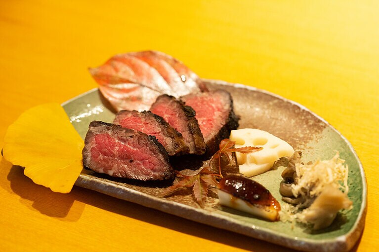店内はカウンター席と、お座敷のテーブル席がある。 夜コースの一例。※季節によってメニューが変更します。 菊の花と紫蘇の花が彩りを添えている。上にはアクセントとしてイクラをトッピング。 比婆牛ヒレ肉飯蒸し 丹波餡掛け。 穴子の濃厚な味と比婆牛の力強い味がハーモニーを奏でます。 写真左から、比婆牛のランプ、マルシン、ヒレ肉、棒寿司。 それぞれの部位の味わいをより引き出すために、工夫がされている。 比婆牛のランプ肉を使った棒寿司。ひと口サイズで食べやすい。