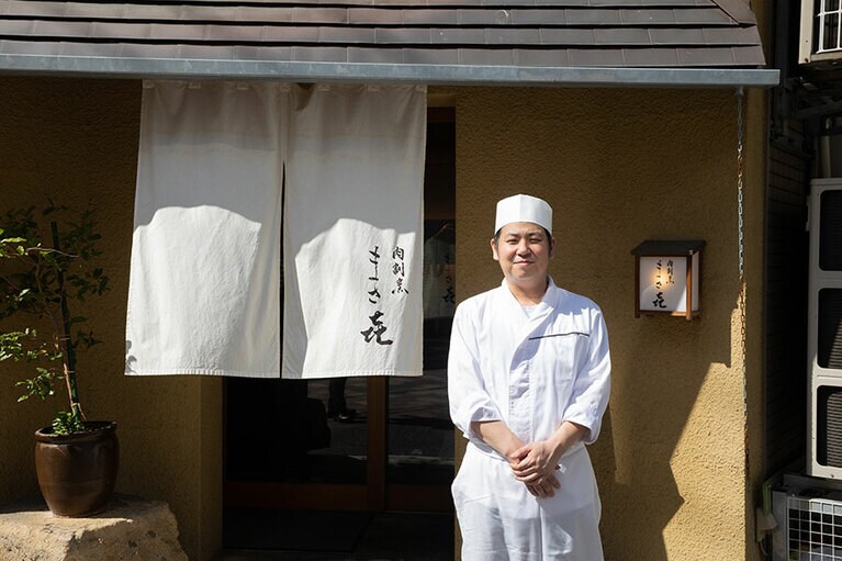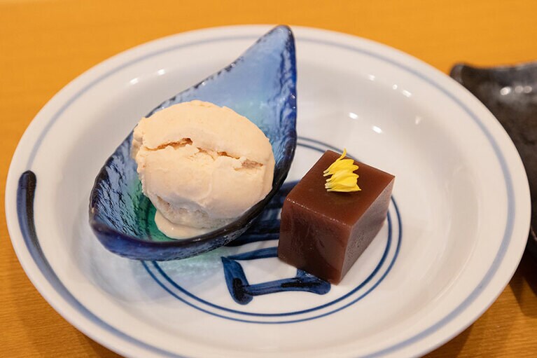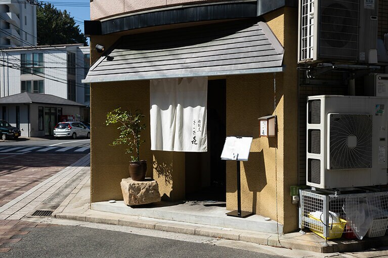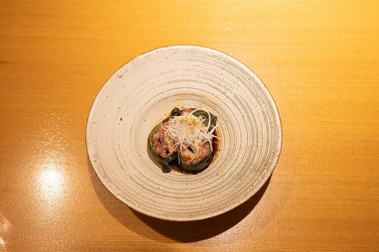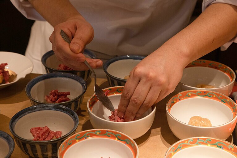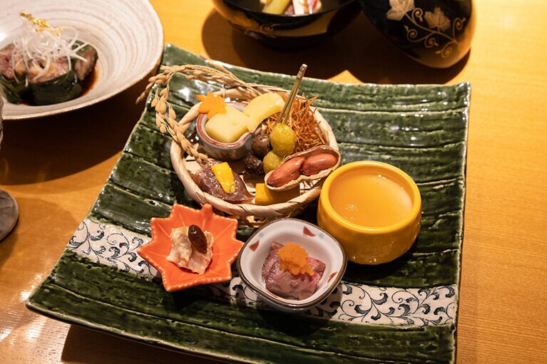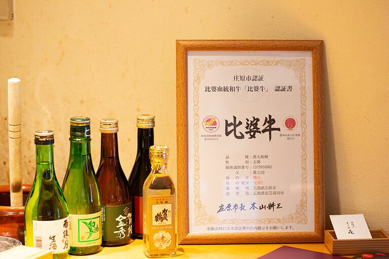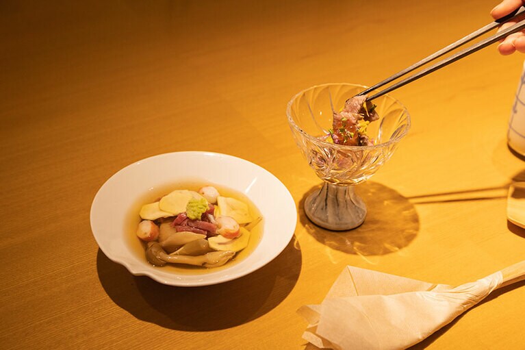 店内はカウンター席と、お座敷のテーブル席がある。 夜コースの一例。※季節によってメニューが変更します。 菊の花と紫蘇の花が彩りを添えている。上にはアクセントとしてイクラをトッピング。 比婆牛ヒレ肉飯蒸し 丹波餡掛け。 穴子の濃厚な味と比婆牛の力強い味がハーモニーを奏でます。 写真左から、比婆牛のランプ、マルシン、ヒレ肉、棒寿司。 それぞれの部位の味わいをより引き出すために、工夫がされている。 比婆牛のランプ肉を使った棒寿司。ひと口サイズで食べやすい。