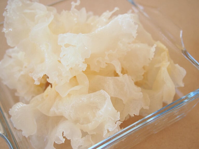 白木耳とレンコンの炊き込みご飯。 乾燥白木耳:2株/レンコン:100g/えのき:1/2株/生姜:10g/米:2合分/塩:少々/醤油:小さじ1/だし汁:360ml(2合分の水分量)。 (1) 白木耳は水で戻して食べやすい大きさに切ります。えのきは固い軸の部分を切り落とし、3等分にします。レンコンは皮を剥いて薄く半月切りにし、5分ほど水に晒します。生姜はよく洗って、皮付きのまま千切りにします。 (2) 米を水で研ぎ、水分を捨て、だし汁と一緒に鍋に入れます。(1)の食材を全て鍋に入れます。※同じ工程で、炊飯器で炊くこともできます。 (3) 塩、醤油を加え、全体を混ぜます。蓋をして強火で加熱し、沸騰してきたら弱火にして12〜15分加熱します。 (4) 時間が経ったら蓋を開け、底の部分に水が溜まっていないか確認します。全体を切るように混ぜ、再び蓋をし10分間蒸らします。 (5) 器に盛り付け、お好みで葱などを飾って完成です。 里芋と白木耳のおやき。 乾燥白木耳:2株ほど/里芋:6個/鶏モモひき肉:100g/素焼きクルミ:10g/塩:少々/醤油:小さじ2/みりん:小さじ2/片栗粉:大さじ2〜3/ごま油:適量。 (1) 里芋は皮を剥き、一口大に切ります。白木耳は水で戻したら粗くみじん切りにします。 (2) フライパンにごま油を敷き、鶏ひき肉を炒めます。赤みがなくなってきたら、(1)の白木耳、醤油、みりんを入れて炒めます。水分がなくなるまで煮詰めて、火を止めます。 (3) 里芋は15分ほど蒸して、串が刺さる程度になったら火から下ろします。※里芋は茹でたり、レンジを使ったりして柔らかくしても大丈夫です。 (4) ボウルに里芋を入れてフォークやマッシャーで潰します。(2)の具材、すり鉢で擦ったクルミ、塩を入れて全体をよく混ぜます。 (5) 混ぜたタネを10個ほどに小分けにしたら、片栗粉を広げたバットにひと塊りずつ入れて粉をつけます。丸く形を整えます。※片栗粉を周りにつけるとベタつかず成型しやすくなります。 (6) フライパンにごま油を敷いて、丸く整えたタネを並べて焼きます。 (7) 両面がキツネ色になるまで焼いたら、取り出します。 (8) 器に盛り付け、お好みで醤油を添えて完成です。 梨と白木耳のコンポート。 乾燥白木耳:2〜3株/梨:1個/はちみつ:20g/レモン汁:大さじ1/水:1000ml/クコの実:大さじ1。 (1) 白木耳は水で戻し、食べやすい大きさに切ります。梨は皮をむいてくし切りにします。クコの実は水で戻します。 (2) 鍋に水、はちみつ、(1)の白木耳と梨を入れて加熱します。 (3) 白木耳が柔らかくなり、とろみが出るまで弱火でゆっくり20〜30分ほど加熱します。※途中で水分が足らなくなったら足しながら煮ましょう。 (4) 白木耳がとろみのある食感になったら、レモン汁、およびクコの実を戻し汁ごと入れます。 (5) お好みで水を入れて水分調節をし、器に盛り付けて完成です。