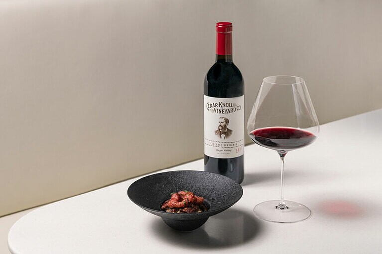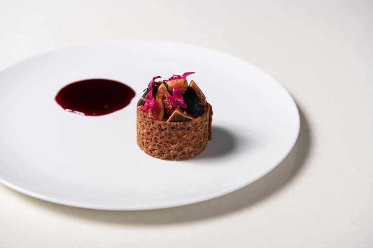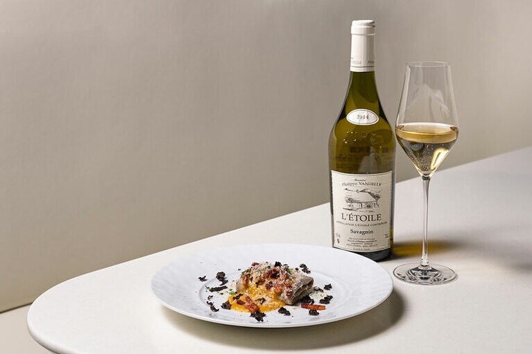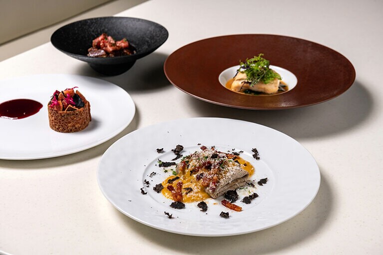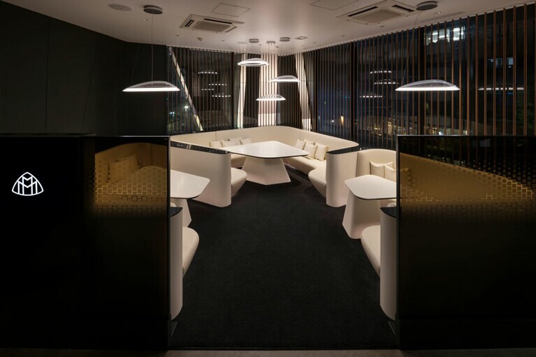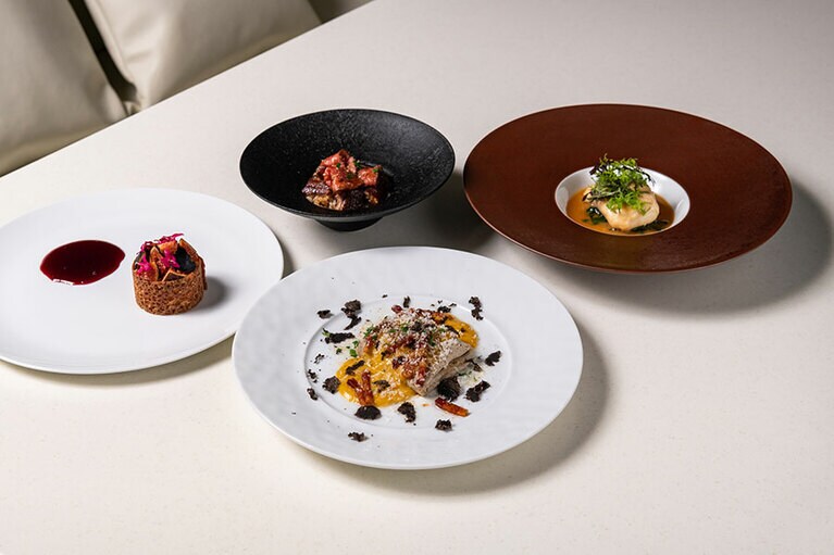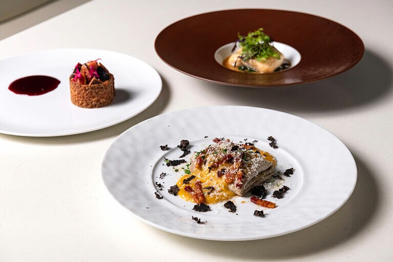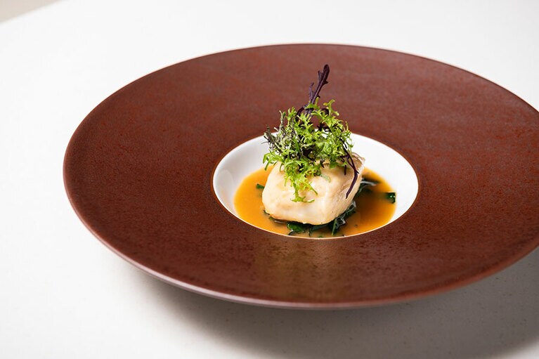 「最善の中の最善を届ける」ことをテーマに開発された「メルセデス・マイバッハ」。 香り高いトリュフをゲストの目の前で削る演出も。 ローストした宮崎牛と鰻の洋風蒲焼をのせた一皿はフレンチを日本のどんぶりに再解釈した一品。 別途料金でワインペアリングを楽しむことも。