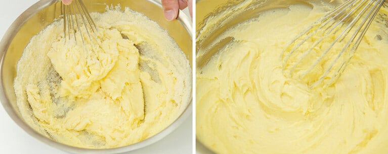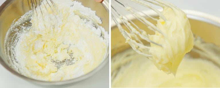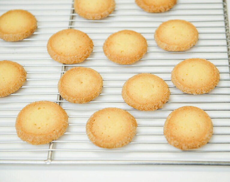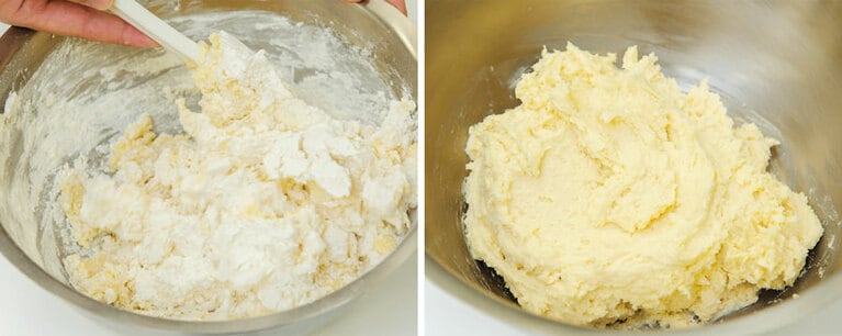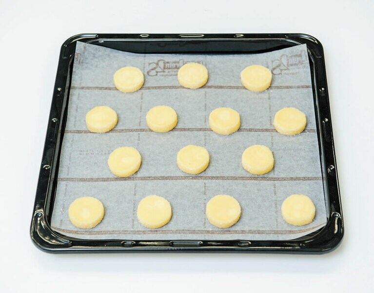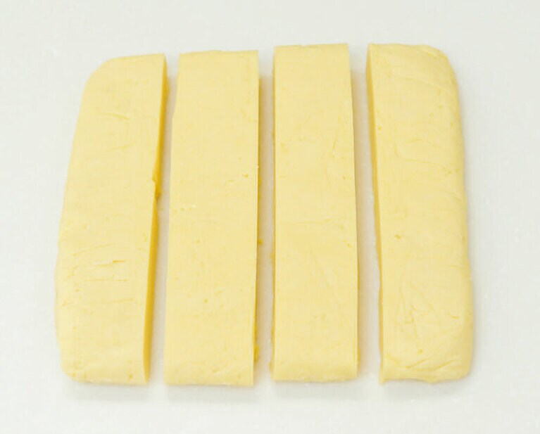 全体に同じ柔らかさにしておくと、粉糖や粉類がムラなく混ざります。 クリーム状でつやのある状態がベストです。 最初に切るように筋を入れると、全体にムラなく混ざります。 混ぜすぎると生地が固くなるので、1回目に加えた粉は完全に混ぜきりません。 厚みを均一にすると、生地の状態も均一になって扱いやすくなります。 休ませることによって、バターがしっかり冷え、焼いている間に溶け出さず、軽い食感に仕上がります。 この状態でラップでぴっちり包んで冷凍保存でき、約2週間はもちます。必要な分だけ焼き、残りは別の日に焼いてもOK。 つきにくければ、生地に霧を吹いてください。 生地の角や表面が荒れていると、きれいに焼き上がらないので注意してください。