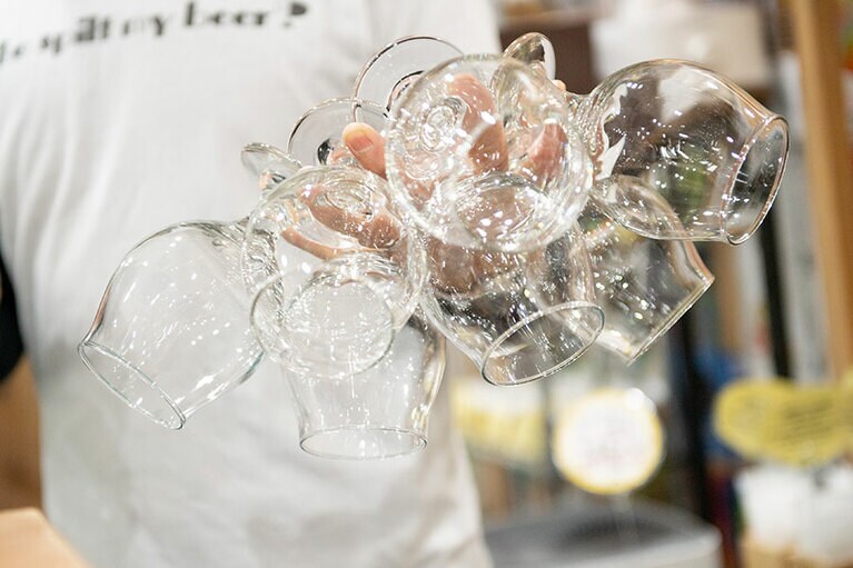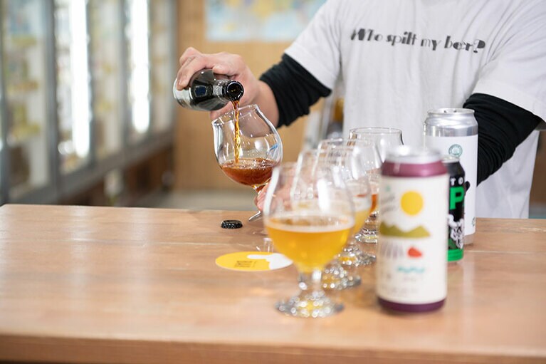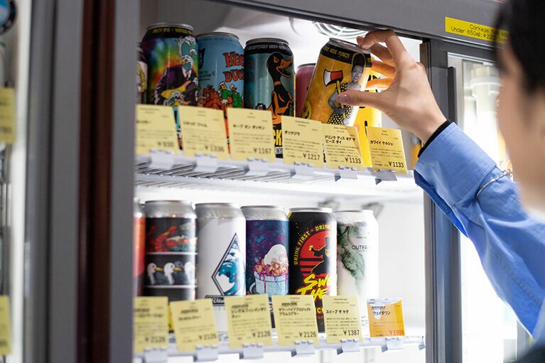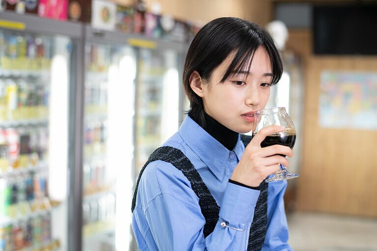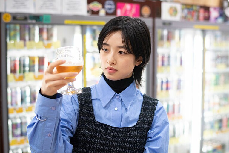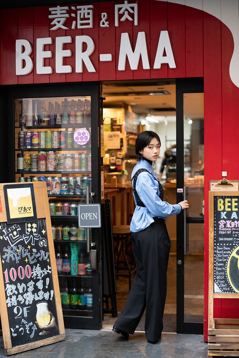 ニットブラトップ 26,400円(KOTONA/alpha PR 03-5413-3546)、ブラウス 21,780円(MIJEONG PARK/THE WALL SHOWROOM 03-5774-4001)、タートルネックトップス 53,900円(WOLFORD/The SAZABY LEAGUE 03-5412-1937)、パンツ 39,600円(Graphpaper 03-6418-9402)、ローファー 49,500円(BEAUTIFUL SHOES/GALLERY OF AUTHENTIC 03-5808-7515)、バングル 36,300円、リング 24,200円、イヤーカフ 14,300円(以上LORO 03-6804-5499) 神田駅より徒歩2分の場所にあるクラフトビール専門店『びあマ神田』(東京都千代田区鍛冶町1-6-4)。1,000種類以上のクラフトビールを楽しむことができる。営業時間[月~土]16:00~23:00[日、祝]15:00~22:00/定休日:無休 ※年末年始除く ビールが大好きな河合さん。家ではお気に入りの銘柄を冷蔵庫に常備しているそう。 世界各国のクラフトビールが並ぶショーケース。店頭に並ぶ商品は製造量に限りがあるものも多く、次に来店しても同じ銘柄を飲めるとは限らない。「でもそれがクラフトビールの面白いところなんですよ」(店主・清水隆雄さん) (左から)グリーンライト CBDインフューズドセッションIPA 500ml(原産国:日本/1,367円)、ストーンIPA 355ml(原産国:アメリカ/795円)、うちゅうブルーイング シリウス 330ml(原産国:日本/913円)、ハーヴェストスウーン2022 473ml(原産国:アメリカ/1,268円)、ドゥシャス デ ブルゴーニュ330ml(原産国:ベルギー/616円)、オリジンオブダークネス クラウドウォーター インペリアルスタウト 355ml(原産国:カナダ/1,256円) 河合さんと「びあマ神田」店主の清水隆雄さん。クラフトビール初心者の河合さんに飲んでほしい銘柄を事前に考えてプレゼンしてくれました。 ドキドキしながら河合さんにグラスを差し出します。 これは、ビール好きの顔! 2本目の「ストーンIPA」。「クラフトビールを楽しむなら苦みと香りが特徴のIPAは外せない。特にこのストーンIPAは基本のキとなる王道のビールです」(清水さん) ちょっと濁りがあってフルーティなヘイジーIPA、「シリウス」。うちゅうブルーイングのビールはそれぞれコンセプトが決まっているのも面白い。シリウスのコンセプトは「五次元フェス」! 酔ってはいないけれど、少しずつ表情が柔らかくなってきた? 3本飲んだ段階で、もう一度1本目のグリーンライトに立ち戻ってみたり……。 4本目の「ハーヴェストスウーン2022」。ケトルサワーと呼ばれるサワーエールの一種で、ビールらしからぬ酸っぱい味わい。でも「酸っぱいものが大好き」という河合さんは……「なにこれ、美味しい……! 原材料なにかな?」とラベルをしげしげと眺めていました。 5本目はワインのようなボトルが印象的な「ドゥシャス デ ブルゴーニュ」。オーク樽で熟成させた芳醇さが特徴。こちらもハーヴェストスウーン同様、サワーエールの一種で酸っぱさと甘みを感じる味わいです。 ラストの6本目は、“黒ビール”として呼ばれることも多いスタウトの「オリジンオブダークネス クラウドウォーター」。インペリアルスタウトというスタイルで、まるでチョコレ―トのような濃厚でコクのある味わいが特徴です。河合さんは初めて飲むスタウトを、どうレポートするのでしょうか……? スタウトを「スープ」と表現した河合さんに、清水さんが「えっ? スープですか?」と聞き返す。「ちなみに、ヘイジ―IPAのシリウスは……餃子の味がしたような……」と気まずそうに続ける河合さんに、清水さんも思わず「ちょっと香り確かめてもいいですか?」とグラスを借りて、くんくん。「確かに少しニラのような青っぽい香りがする気も……河合さんの表現のセンス、とても勉強になります」と驚いていました。 全種類を飲み比べたところで、お待ちかねのセレクトタイムです。 「どうしよう、本当に悩む……」と困った様子の河合さんですが、なんだか楽しそう。 悩んだ末に、2本に絞り込みました。何度も飲み比べて、ついに……。 河合さんのお気に入りのクラフトビールは、ブラックチェリーやパッションフルーツのような複雑な香りと酸味が特徴のサワーエール、ドゥシャス デ ブルゴーニュに決定!