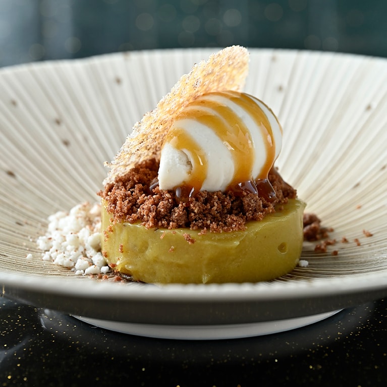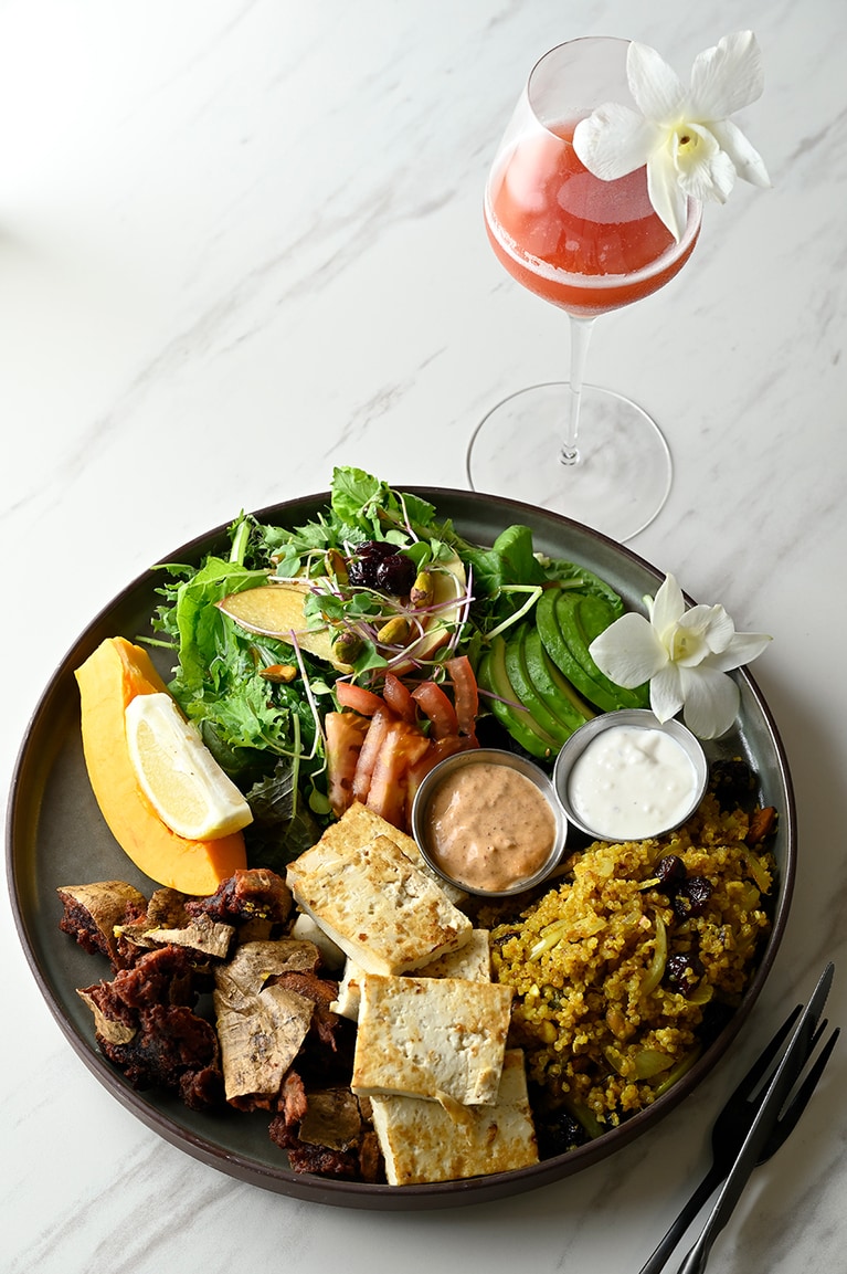 “リリコイモアナボウル” 13.95ドル~、“アサイースムージー” 11.50ドル、“ヴィーガンポケ” 20.95ドル。 “ベジ・ベーグル” 19.95ドルにはクリームチーズが入っているが、植物性チーズに変更可能。 開放的なダイニング。 “アルメニア風レンズ豆のヴィーガンミートボール”。もちもちした衣の食感もいい。 “フォー”は、ライスクラッカーと香味野菜のスープをアガーで固めたもの、マーマイトなどで構成。 日本酒ペアリング可。