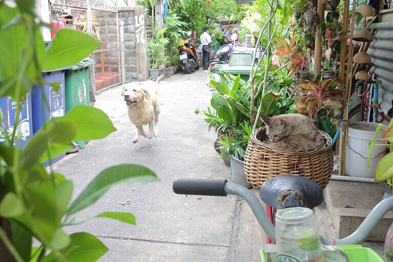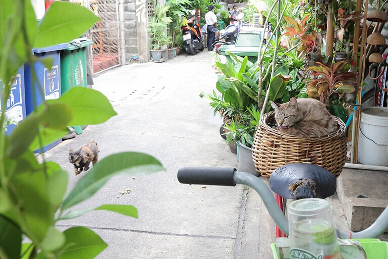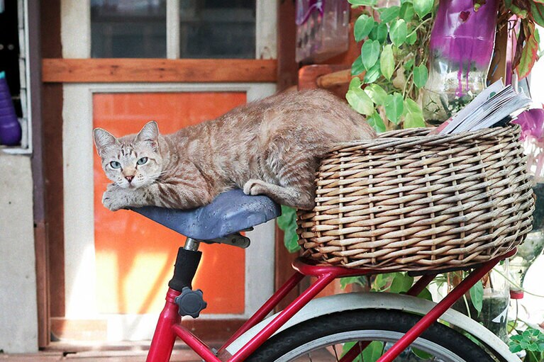 市場で見つけたミケねこちゃん。自ら商品カゴの中に入り、店主のおばちゃんの笑いを誘っていました。 ラン島のねこさん。30軒ほど立ち並ぶパラソルへ順にご挨拶をして回っており、ようやく私の所へ。一緒にのんびりした時間を過ごすことができました。