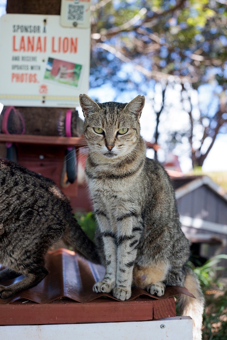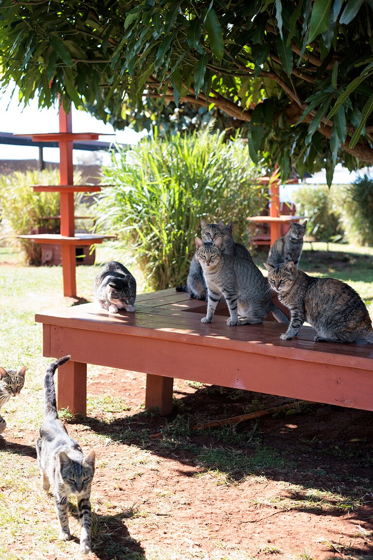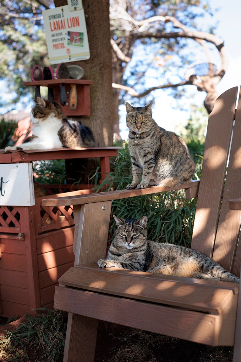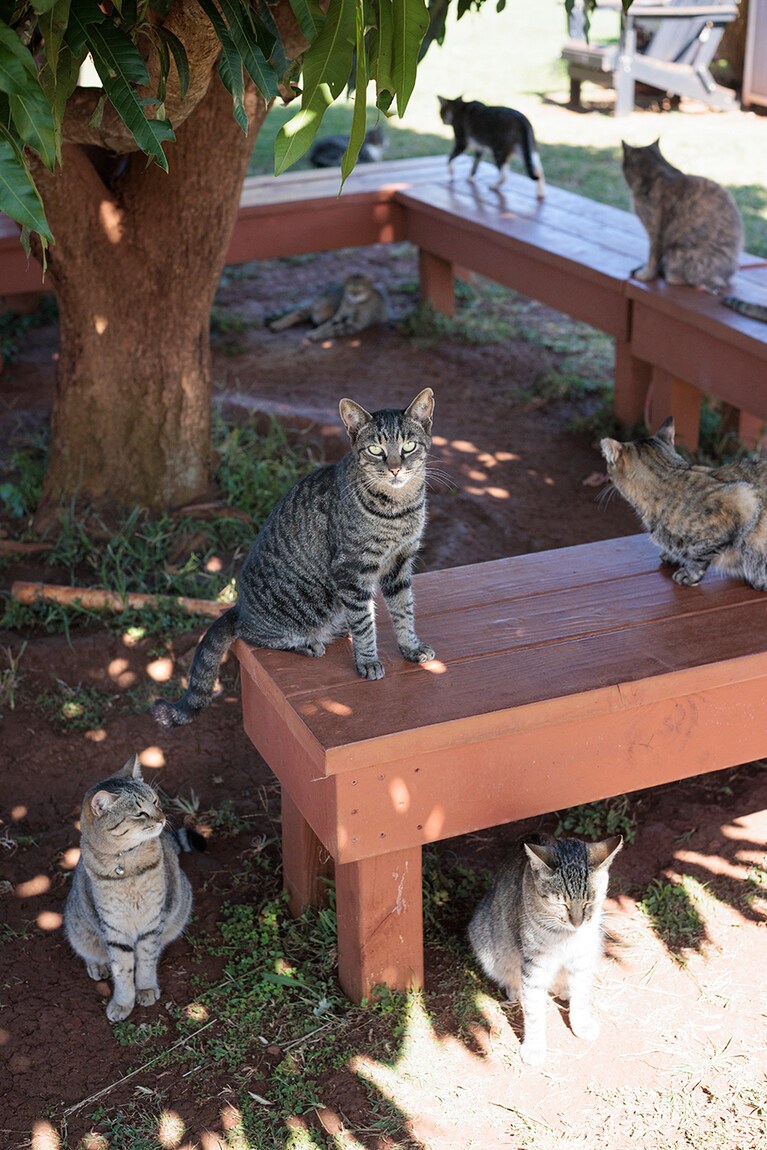 幹線道路からこの施設への案内板はだいぶ地味なので、お見逃しなく。 開放的な敷地。「ラナイ・キャット・サンクチュアリ」の面積は2,300㎡。 「ラナイ・キャット・サンクチュアリ」。木陰に集い、思い思いにくつろぐ猫たち。 こちらは、シャイな猫ばかりを集めたコーナー。蛇のごとく枝に絡まる様子が愛おしい。 こちらは、シャイな猫ばかりを集めたコーナー。蛇のごとく枝に絡まる様子が愛おしい。 同じ柄の猫たちが自然に集合する。血縁があるのだろうか。 理想の老後。 こんなに気候のいいところで暮らしていたら、こういう状態にもなるであろう。うらやましい限りである。 椅子に座っているだけで、猫が寄ってくる。 Tシャツをはじめ、キャップなど、オリジナルグッズも豊富。