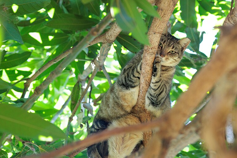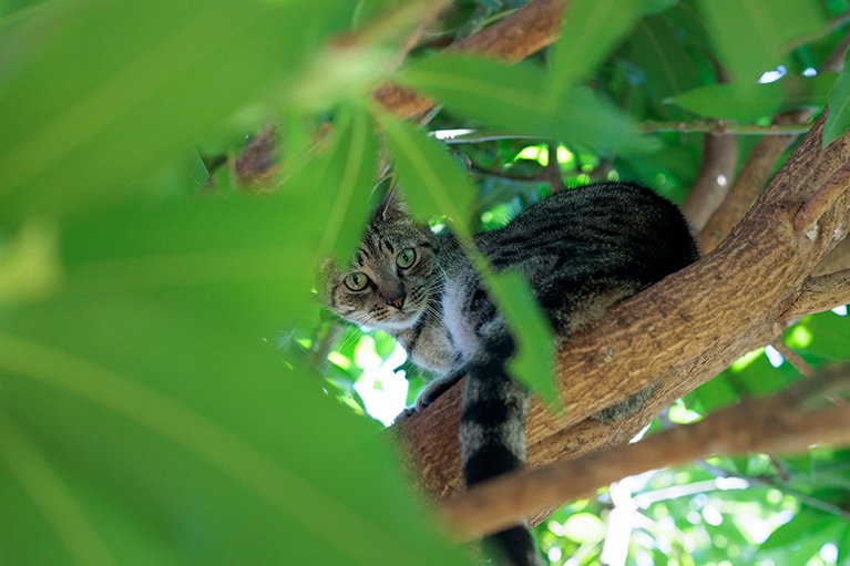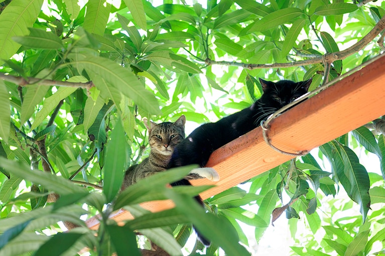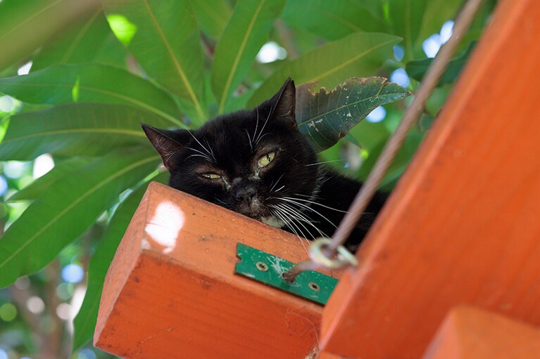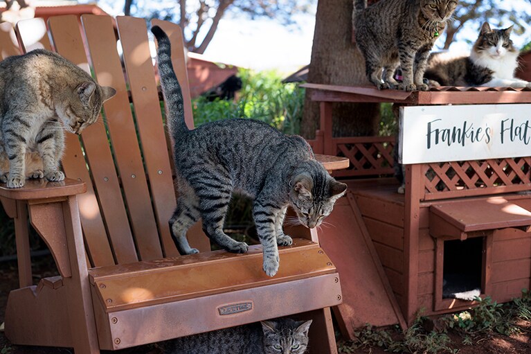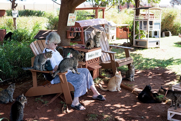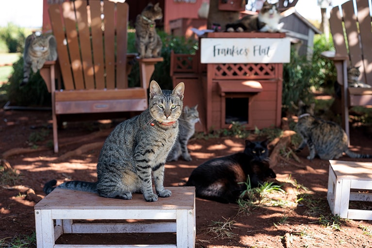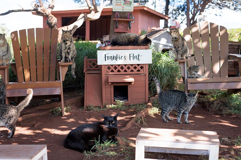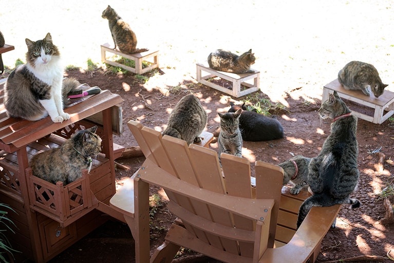 幹線道路からこの施設への案内板はだいぶ地味なので、お見逃しなく。 開放的な敷地。「ラナイ・キャット・サンクチュアリ」の面積は2,300㎡。 「ラナイ・キャット・サンクチュアリ」。木陰に集い、思い思いにくつろぐ猫たち。 こちらは、シャイな猫ばかりを集めたコーナー。蛇のごとく枝に絡まる様子が愛おしい。 こちらは、シャイな猫ばかりを集めたコーナー。蛇のごとく枝に絡まる様子が愛おしい。 同じ柄の猫たちが自然に集合する。血縁があるのだろうか。 理想の老後。 こんなに気候のいいところで暮らしていたら、こういう状態にもなるであろう。うらやましい限りである。 椅子に座っているだけで、猫が寄ってくる。 Tシャツをはじめ、キャップなど、オリジナルグッズも豊富。