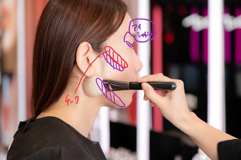 ルミネエスト新宿のM・A・C STORE。 M・A・C ナショナル アーティストのRYOKO SHIONOさん。ファッションショーやメイクセミナー、SNSなどで活躍中。 一般的に、頬骨の下に入れることの多いシェーディングは私には不要。右の写真の黄緑部分は、ハイライト(光)を入れる大まかなポイントです。 イラストのように陰影をつけていただきました。赤色の①はパレットの下段3色、青色の②は上段右2色で主にクスミ取りに使用。オレンジの③は、上段左でハイライトとして使用。 スタジオ フィックス スカルプト&シェイプ コントアー パレット ライト/ミィディアム 7,590円。(以下、アイテムは全てM·A·C) 下段3色にさっとブラシを走らせて使用。 陰影は、ほんの少し入れるだけで効果抜群! 鼻の「底」にシャドウを入れて、鼻先にハイライトを入れる。 顔の側面にハイライト! アイメイクは顔幅を「広げる」意識で。 紫色で示した3つのラインを平行にするとキレイに!(チークやアイシャドウも合わせて考える)。 RYOKOさんのメイク後。顔がシャープ! 持っているのは、シェーディングとハイライトで使ったブラシです。 左から時計回りに:スタジオ フィックス スカルプト&シェイプ コントアー パレット ライト/ミィディアム 7,590円、スタジオ フィックス フルイッド SPF 15 / NC20 32g 5,830円、#170 シンセティック ラウンド スラント ブラシ 6,710円。 左から時計回りに:アイ コール / テディ 2,970円、スモール アイシャドウ/オメガ 3,080円、エクストラ ディメンション アイシャドウ/スウィート ヒート 3,850円、パウダー キス アイシャドウ/ライプンド 3,850円、M·A·C ロックド キス インク リップカラー/ミスチーフ 5,060円。