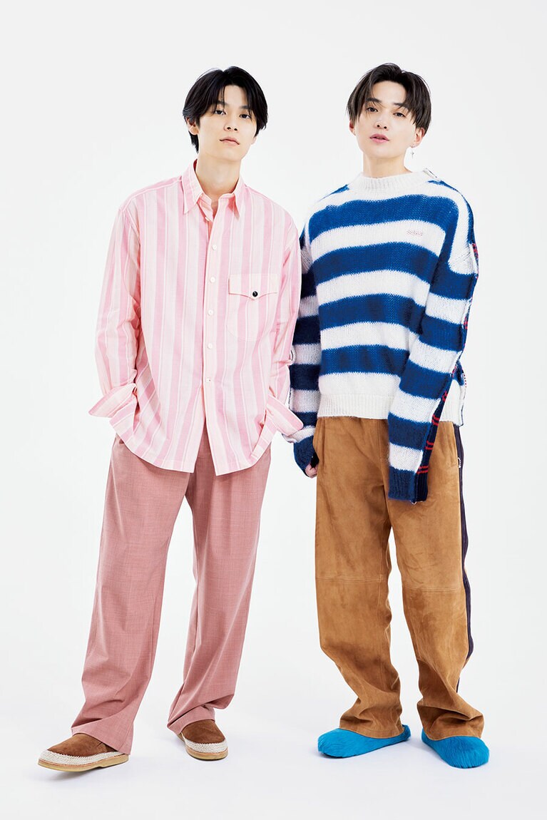 シャツ 36,300円/エルイージェイ、パンツ 42,900円/セラー ドアー、シューズ 25,300円/アーロン(すべてユナイテッドアローズ 六本木ヒルズ店) ニット 151,800円、パンツ 400,400円、シューズ 118,000円/すべてマルニ(マルニ ジャパン クライアントサービス)