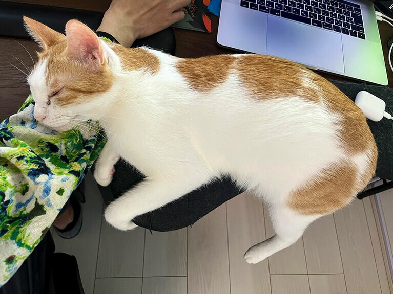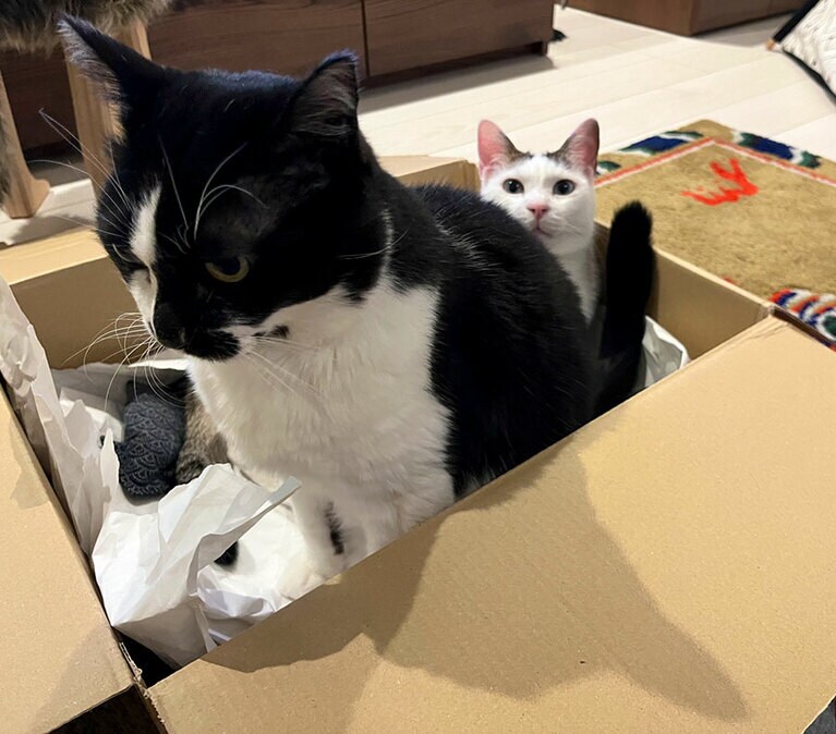 焦がしてしまった餃子を、ネコ助が教えてくれた方法でリメイク。ラザニアみたいで美味しい! ©卵山玉子/文藝春秋 ネコ助の「マズくなります」は、レシピ監修の田中優子先生の言葉だった! ©卵山玉子/文藝春秋 しゅんとしているとき、お腹の毛をつかむネコ助の仕草。©卵山玉子/文藝春秋 卵山さんの愛猫たち。左の白黒がトンちゃん。右奥は預かり猫のたねおくん。卵山玉子さんのTwitter(https://twitter.com/tongarirooms)より。 奥がシノさん。手前がたねおくん。卵山玉子さんのTwitter(https://twitter.com/tongarirooms)より。