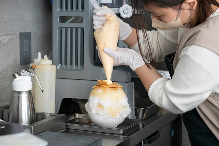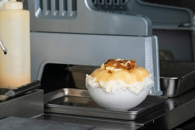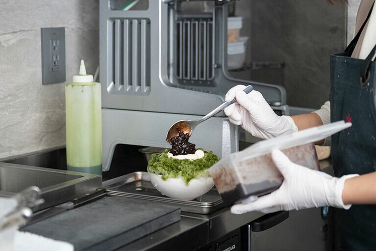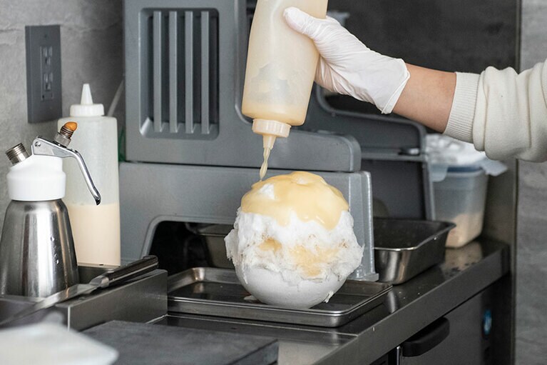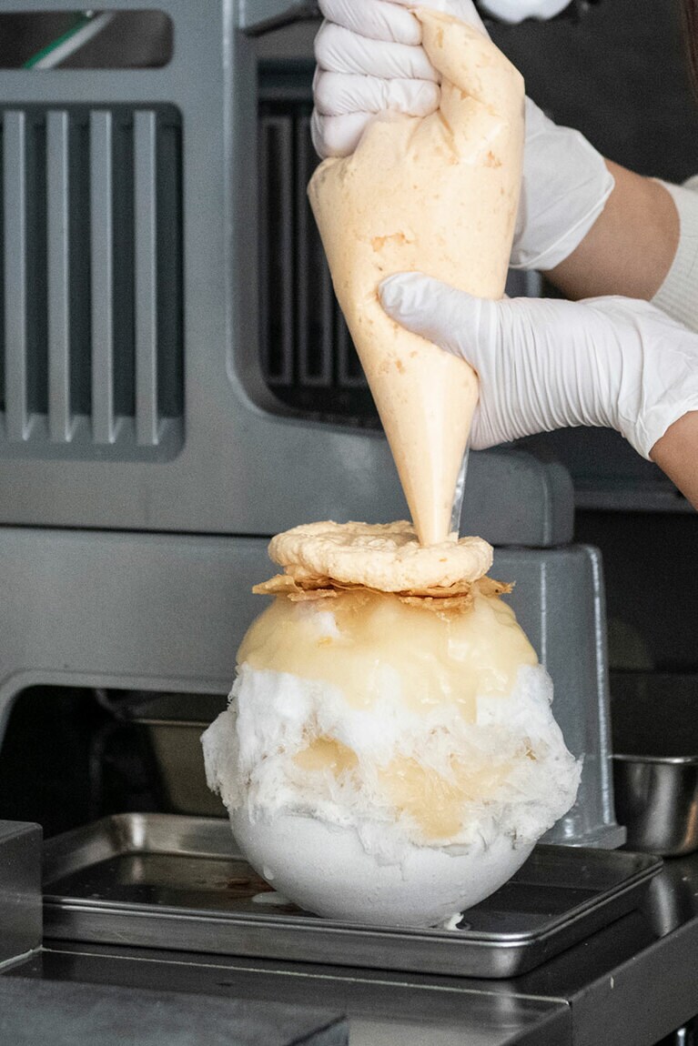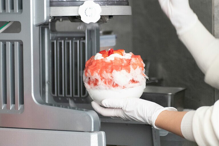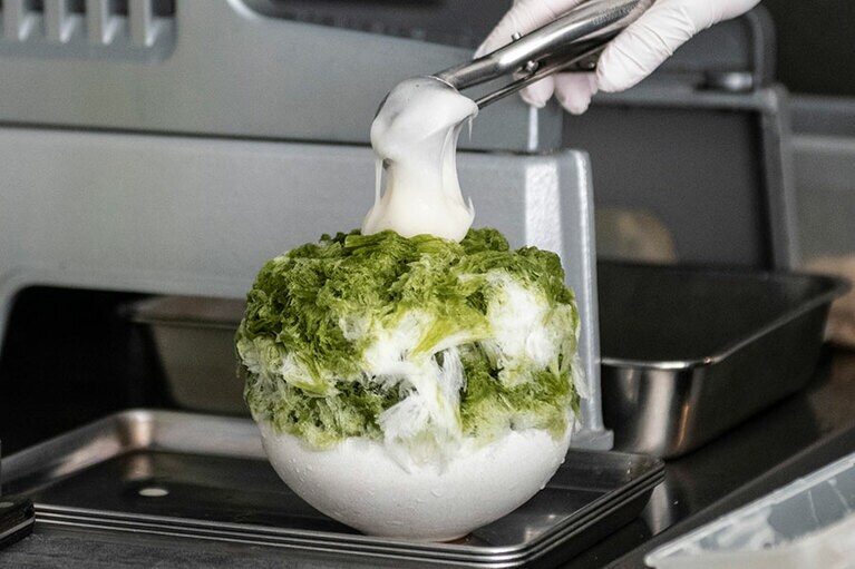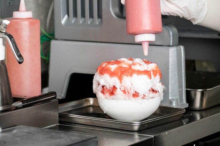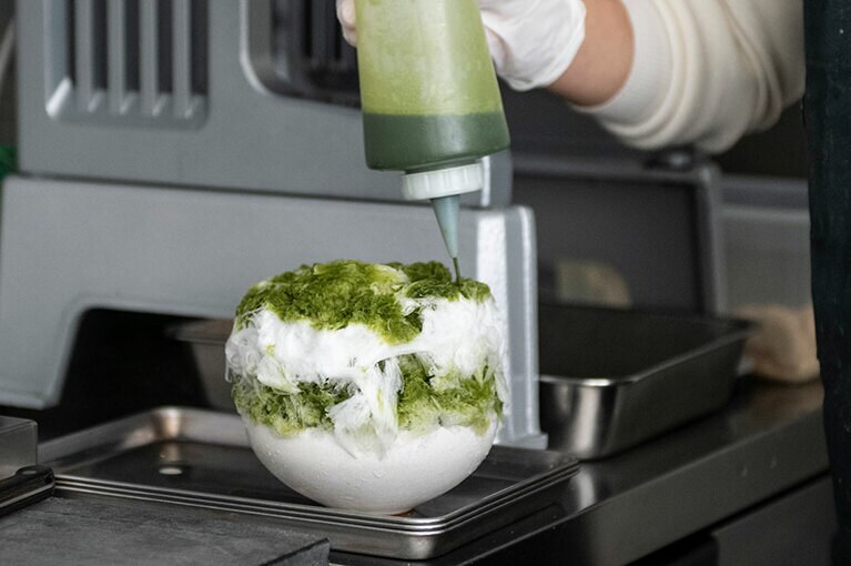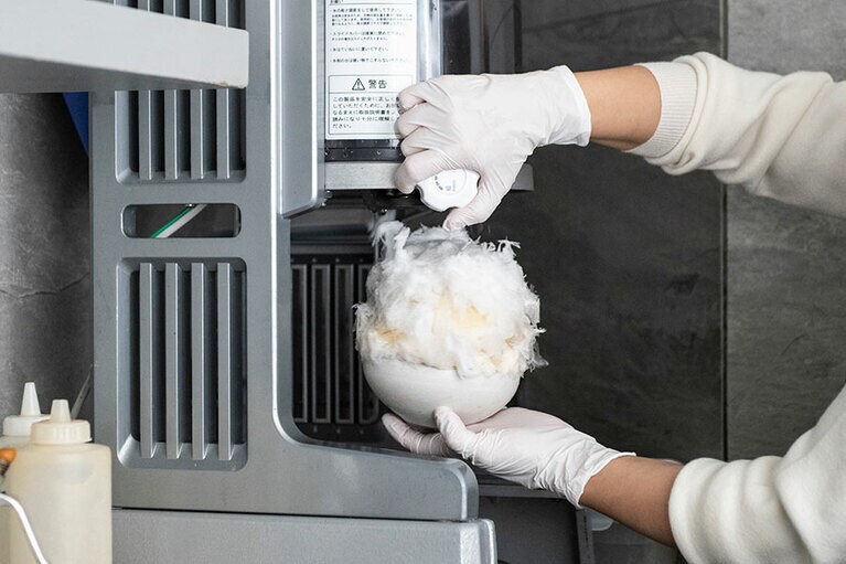 レストラン仕込みの完成度の高さにリピーターが多い。 店主・堀尾美穂さん。レストランでの経験をかき氷に。 「苺とトマト」2,800円。 カウンターごしにかき氷作りを見ることができる。 かき氷にオリーブオイルが新鮮。 「りんごのシブースト」2,850円。 かき氷と炎の組み合わせに驚きが。 かき氷とキャラメルの組み合わせが楽しい! 「今日のスープ」600円。この日は、かぶのスープに昆布のオイルをかけて。 「抹茶あずきメレンゲ」2,500円。 日本の文化を背負って羽ばたいた「抹茶あずきメレンゲ」。中にはお餅が入っている。 「純氷に比べて天然氷は、削った時の軽さが断然違います。干し立ての布団に入ったような気分になって、『ふわふわだなー、最高だなー』と思います」と堀尾さんは笑う。