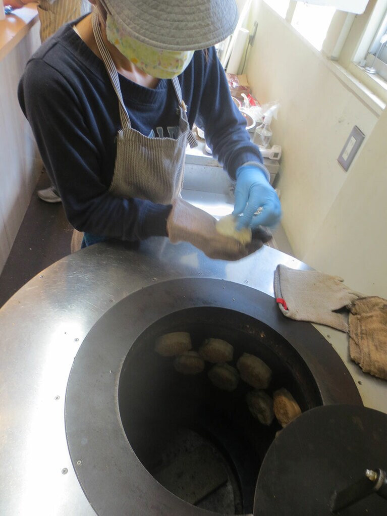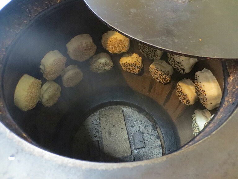 胡椒餅3種類。手前左から時計回りで、醤油味、カレーチーズ味、甘味噌味。 店内入ってすぐに並べられた胡椒餅。 「醤油味」1個380円。ピリリとした胡椒味とネギの甘さが絶妙。 「甘味噌味」1個380円。甜麺醤ベースの甘辛い味わいの後、胡椒がピリリ。 「カレーチーズ味」1個400円。カレースパイスにチーズの優しい旨みが重なる。1日限定20個。 たっぷりの肉と粗く小口切りした九条ネギを生地に包む。 窯の内側に1個1個貼り付け、270度で12分程焼く。 焼きたての胡椒餅。表面の白ゴマと黒ゴマが醤油味、たっぷりの白ゴマが甘味噌味。 胡椒餅を作る山村優佳さん。 イートインの「クラフトビールセット」1,200円。胡椒餅1個+特性肉焼売3個+クラフトビール1杯。