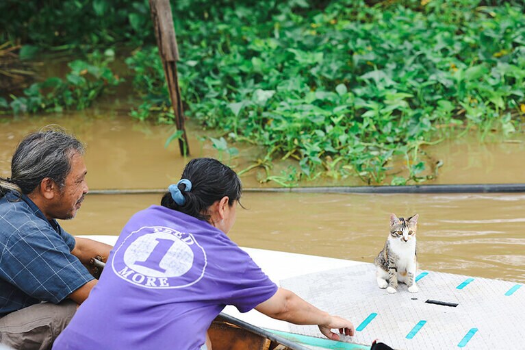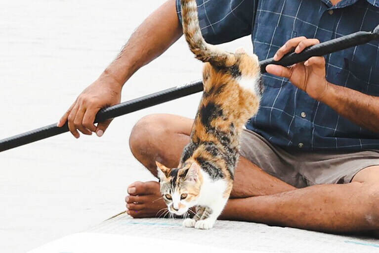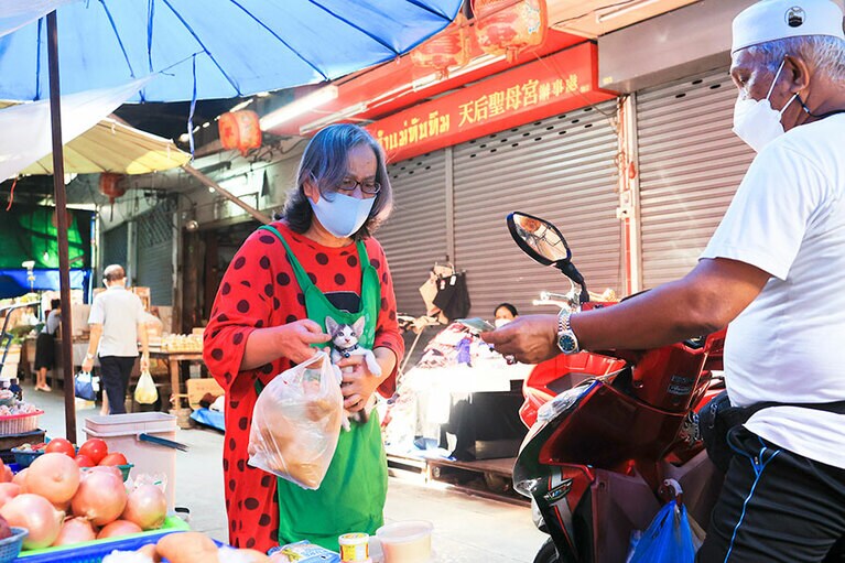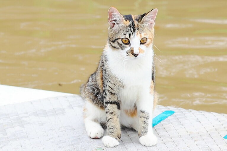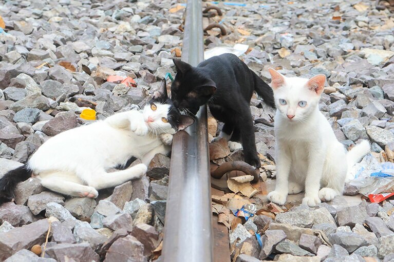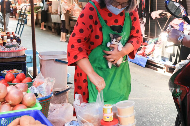 カラフルな造花市場の中、お花の一員になっていた美しい三毛ねこさん。 寺院を知り尽くしくつろいでいた子は、建物の隙間を活用してお顔のツボ押しをしていました。 「可愛い」を連呼していたら、まったく同じポーズ&表情でキメてくれた、駄菓子屋の看板ねこたち。 市場で見つけたミケねこちゃん。自ら商品カゴの中に入り、店主のおばちゃんの笑いを誘っていました。 ラン島のねこさん。30軒ほど立ち並ぶパラソルへ順にご挨拶をして回っており、ようやく私の所へ。一緒にのんびりした時間を過ごすことができました。