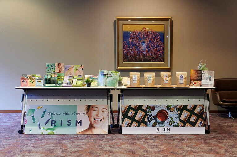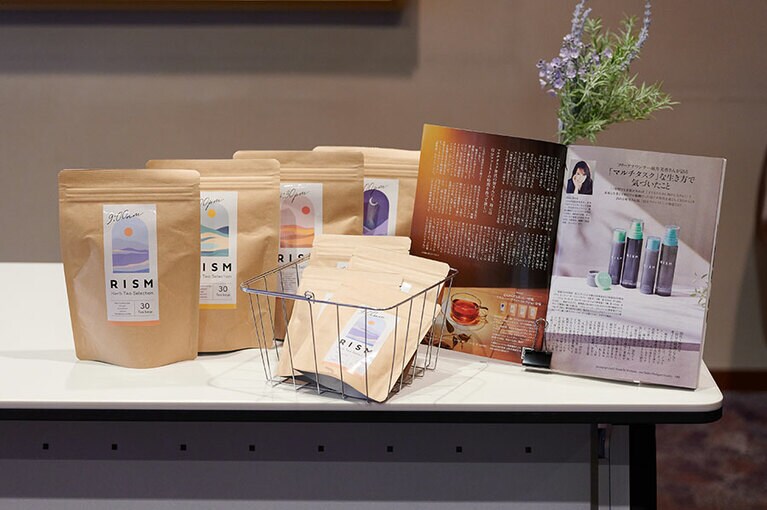 こんな豪華な現品セット! 左から:リズム/RISM ディープケアマスク ビタミン 198円、エニウェイローション(スプレー化粧水)1,980円、トゥーゴースキンバーム(美容液バーム)1,980円、リズム ブジャンガ クリーム(ネック&フェイスクリーム)2,530円/サン・スマイル 会場にはブースも登場。 「リズム/RISM」のハーブティーを提供するブース。 リズム/RISM ハーブティーセレクション 全4種(ルイボスチャイティー、ウーロンブレンドティー、カカオスウィートティー、ビューティーベリーズティー)1袋30包入り 各3,024円。