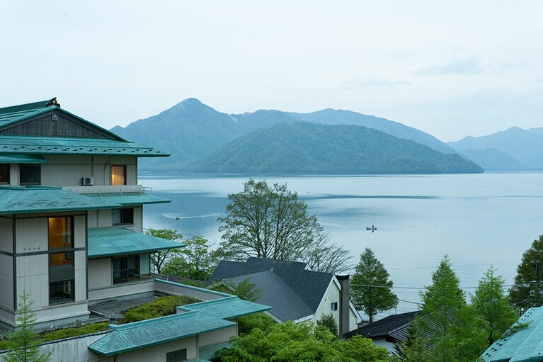 開放感ある内風呂と岩造りの露天風呂で温泉三昧。 ほぼすべての客室から中禅寺湖の絵画的風景が望める。 繊細な組子細工から中を覗き込むようにして客室へ。 熟練の職人だけが為せる伝統と技術の結晶に囲まれた贅沢なひとときを。 組子の障子を斜めから見ると、男体山やいろは坂の模様が浮き出て見える。 トラベルライブラリーの窓辺にも鹿沼組子や日光彫などの意匠が施されている。 組子のボックスに投函すれば、実際に届けてくれるとのこと。 鹿沼組子、日光彫、益子焼、大田原の竹籠などの伝統工芸を巧みに取り込んだ空間演出。 色とりどりのパーツから、これぞという組み合わせを選んで。 同系色を選べば無難にまとまるが、反対色で冒険するのもあり。 鹿沼組子を代表する「麻の葉模様」は魔除けの意味がある縁起のいい模様。 半露天の貸切風呂は大人5、6人がゆったり浸かれるサイズ感。 昼間は中庭の緑を眺めながら、夜は清涼な山の風を感じながらプライベートな湯浴みを。 畳の小上がりがある湯上がり処。こうしたパブリックスペースの贅沢さも宿の魅力。 自然豊かで酒の仕込みに適したおいしい水が湧き出る栃木には30を超える酒蔵がある。 好みのぐい呑みを選んで、好みのお酒を見つけて。 特別会席のメインは日光名産の湯波に和牛をあわせた鍋料理。 生湯波と和牛を甘辛い出汁で軽く煮込み、甘い香りがしてきたところで卵をとろりと。 湯波と和牛の濃厚な旨味、卵のコクが渾然一体に。白ごはんください(くださいます)。 甘味は「苺と軽いチーズのムース」。ごちそうの後にピッタリの軽い口溶け。 食後は能舞台で繰り広げられる「ご当地楽」へ。 日光下駄を履いたスタッフがその背景を楽しく紹介。 リズミカルな下駄タップで会場を盛り上げるスタッフ。 かなり激しく踊っても脱げない「日光下駄」。滞在中は自由に試し履きができる。