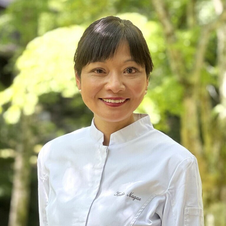 涼しい高原で味わいたい! まるで童話の世界。 涼し気な長江桂子シェフ。 「桃のバーベナ風味」。シャンパンがよく合う。 仕上げをする長江シェフ。 「エキゾチック ヴァシュラン」。 ソースをかけて仕上げる。 「フォレノワール」。 テラス席にて。 世界レベルの技を軽井沢で。 木漏れ日も美しい。せせらぎの音も。 クレソンリバーサイドストーリー旧軽井沢。