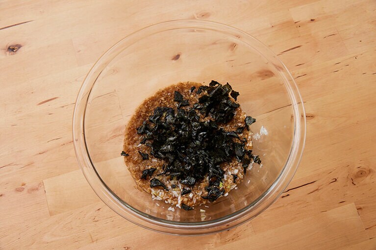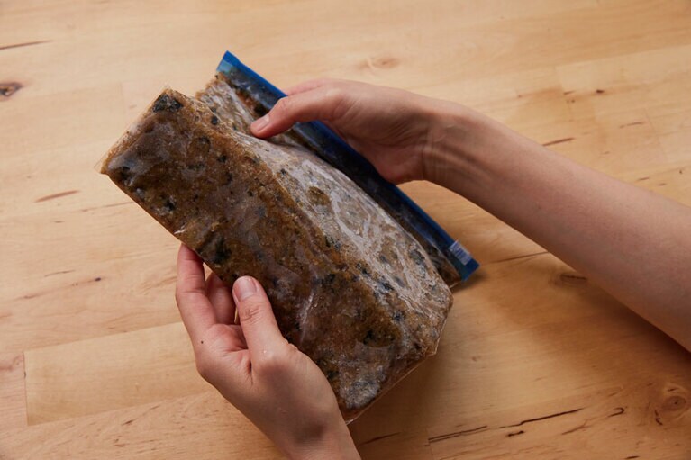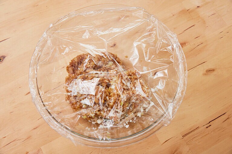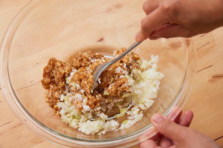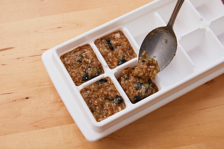 きのこは、なめこ+好きなきのこを入れます。 ※なめこのみじん切りは、包丁を持たない方の手を包丁の背に当てて切るとやりやすい。 ※すりおろしが面倒な人は、チューブ入りのしょうがでもOK! ※フォークで取り出しづらいときは、ナイフを使ってもいいですが、製氷皿を傷つけたり、手をケガしたりする危険性があるので十分に注意してください。