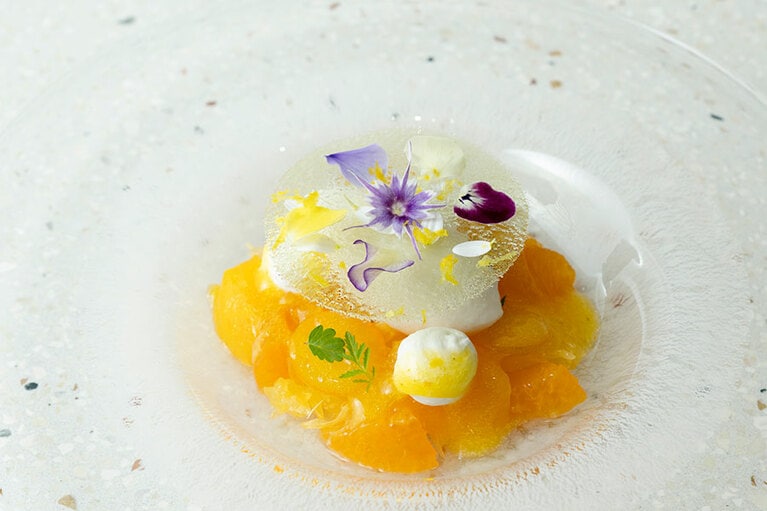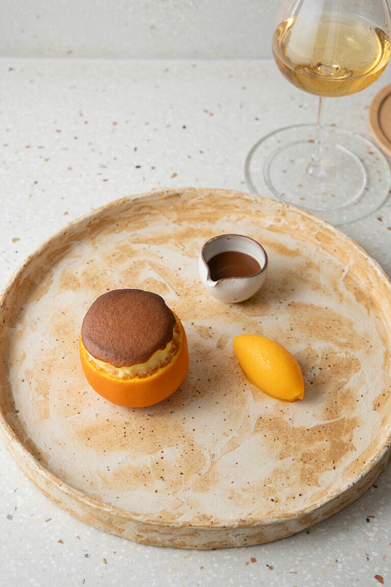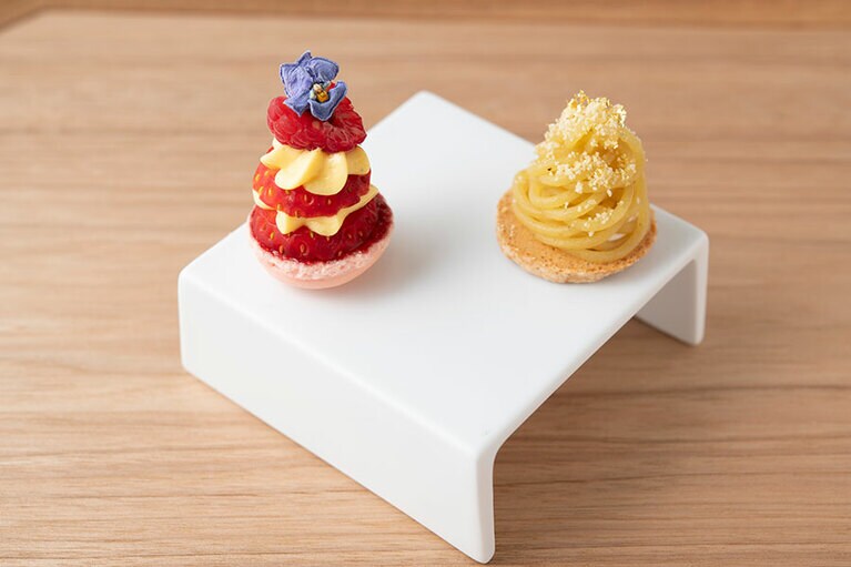 女性シェフならではの感性が楽しみ! 雑木を再生利用したトレイやスマートフォンスタンドは、静岡「iwakagu」製。 満を持しての開店だ。 カウンターには野菜の姿も!? 「富士山麓のIDEBOKU牛乳」。 季節ごとのミルクの味も感じられる。 「藏光さんの八朔と数種の柑橘、甘酒ジェラート」。 まるで室岡さんのパレット。 「淡路島産 新玉ねぎのムースとにんじんのチュイル」。 オーブンが開くと同時にいい香り! 切りたての生ハムがほんのり溶ける。 貴重なワインが登場。 シグネチャーの「水カカオ」。 カカオのパーツを重ねていく。 「愛媛県産せとかのスフレ」。 途中でソースを。 アルコールペアリングは、後味が紅茶を思わせ、せとかとマッチするオレンジワインを。 「イチゴのヴァシュラン」。 イチゴは切り方も変えて。 「チュロス」。 揚げたてを食べられるのが醍醐味。 左:イチゴマカロン、右:さつまいもモンブラン。 マカロンを組み立てる室岡さん。 お花のようなロゴは、室岡さんの夫でイラストレーターの渡邉亮太さんがデザイン。 室岡さんの雰囲気そのままの気品ある店内。 外観。