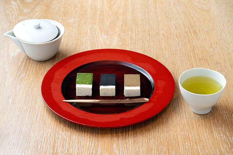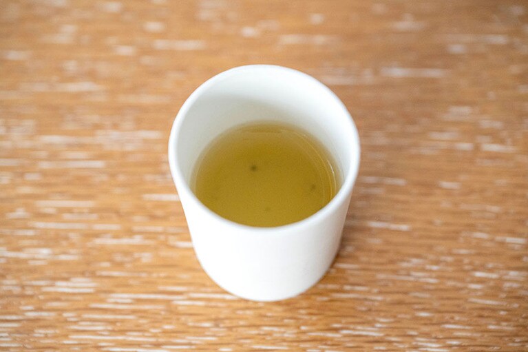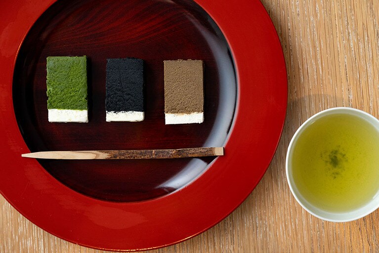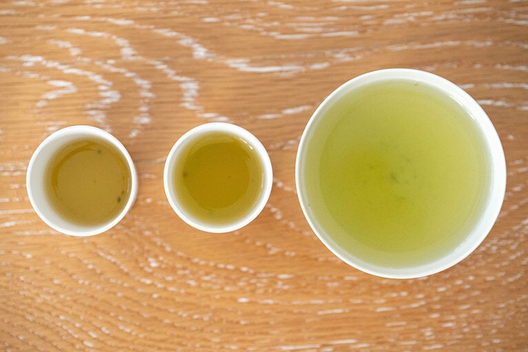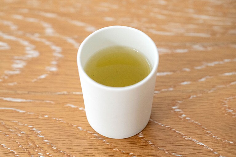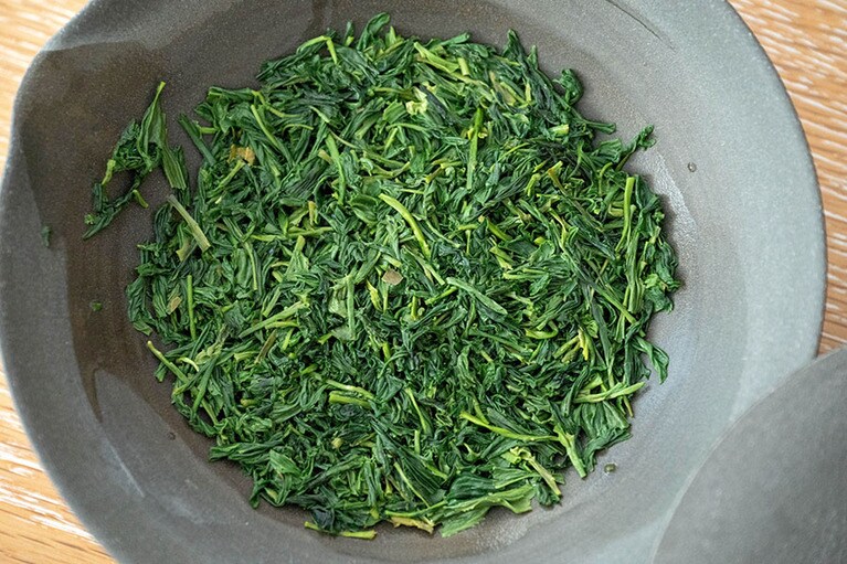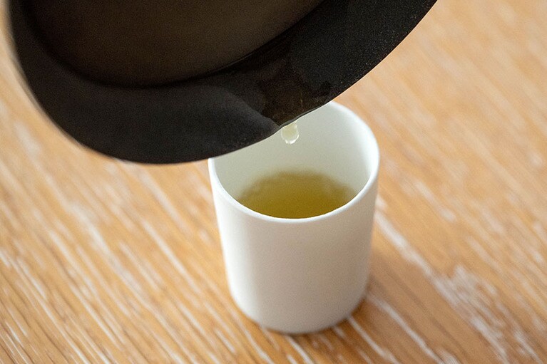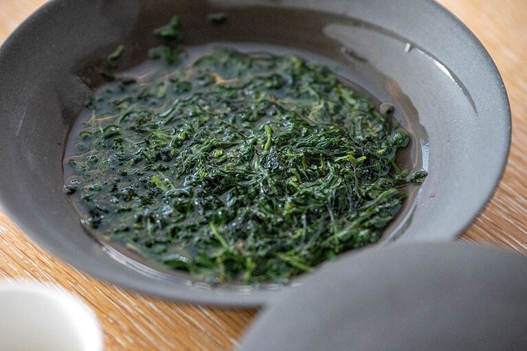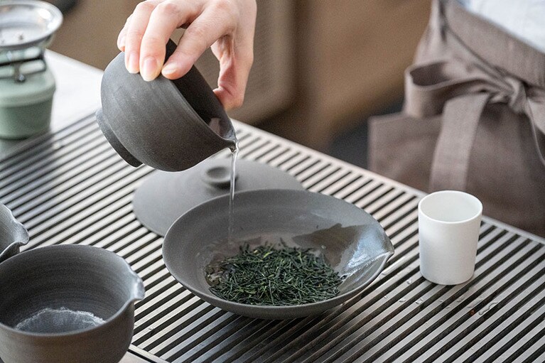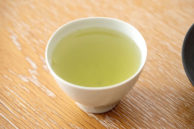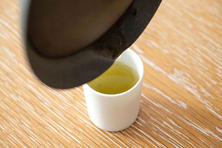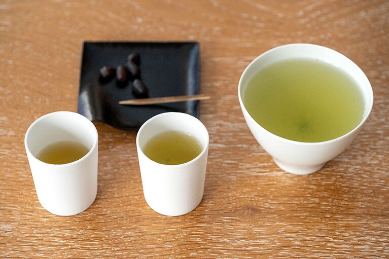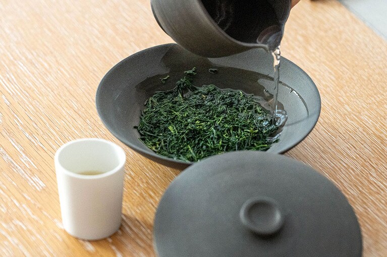 お茶を淹れる美しい所作も眺めることができるカウンター席がおすすめです。 使用する茶葉(玉露は7グラム)を正確に計ります。 器に温度差があると茶葉が過敏に反応してしまうため、まず茶器を温めます。 湯冷しして40度にしたお湯を茶葉にゆっくりと注ぎます。一煎目は小さなおちょこを使用。最後の一滴まで静かに注ぎ入れます。 一煎めは小さなおちょこを使用。最後の一滴まで静かに注ぎ入れます。 一煎めより少し緑色が濃くなります 味わいだけでなく、色の違いもわかりやすい玉露。 きれいに開いた玉露の茶葉をゆずポン酢でいただきます。 「テリーヌ食べ比べ お茶セット」2.500円。 箱入り(サイズ:横140×奥行55×高さ50mm)まっ茶テリーヌ 5,400円、ほうじ茶テリーヌ 7,560円、のりテリーヌ 8,640円。