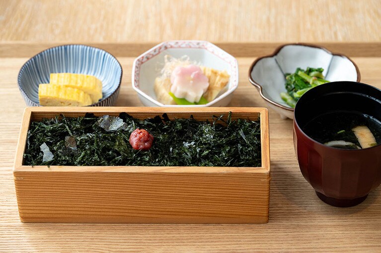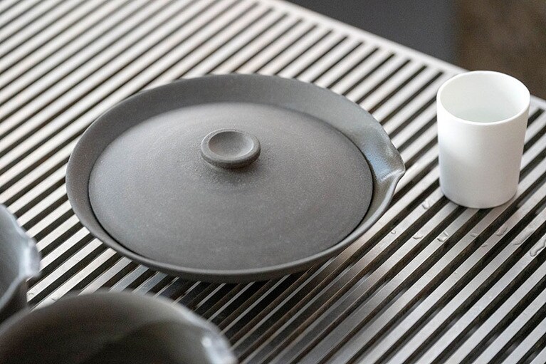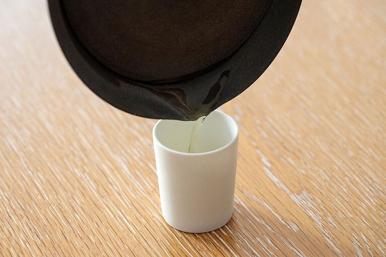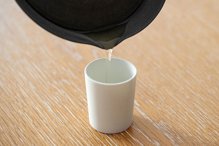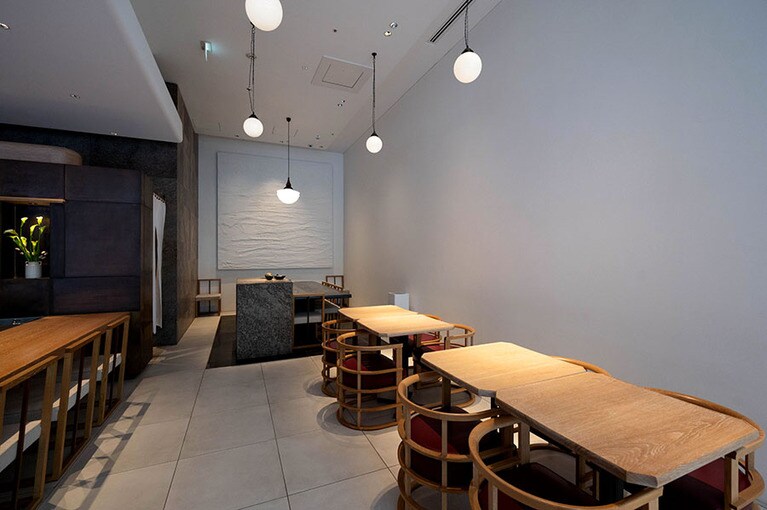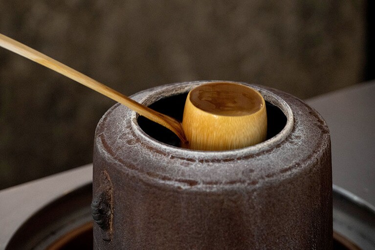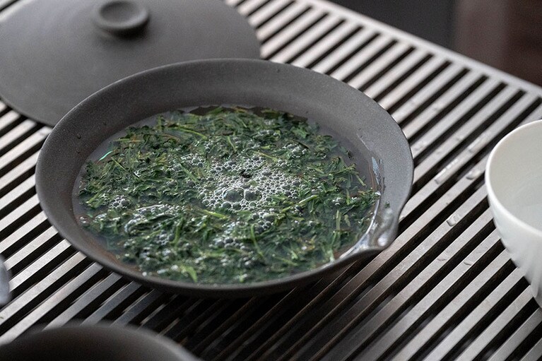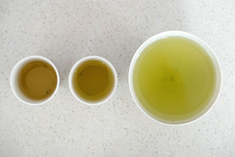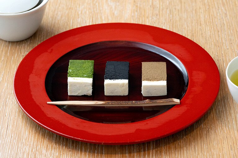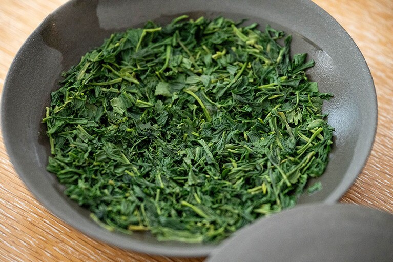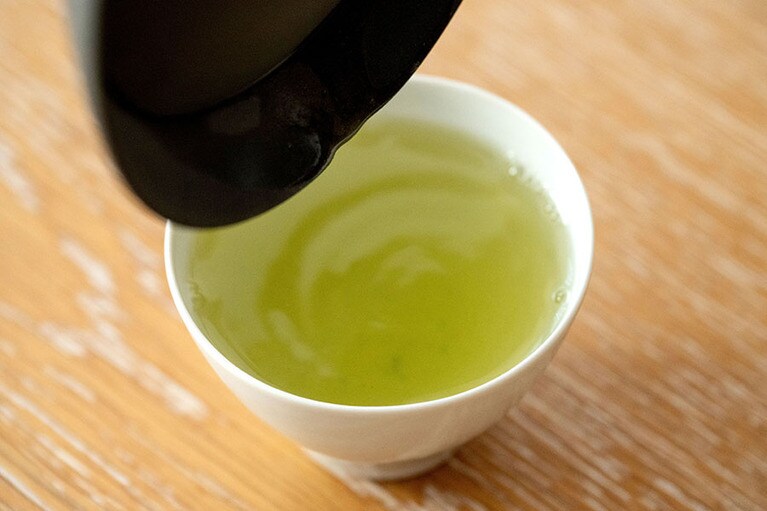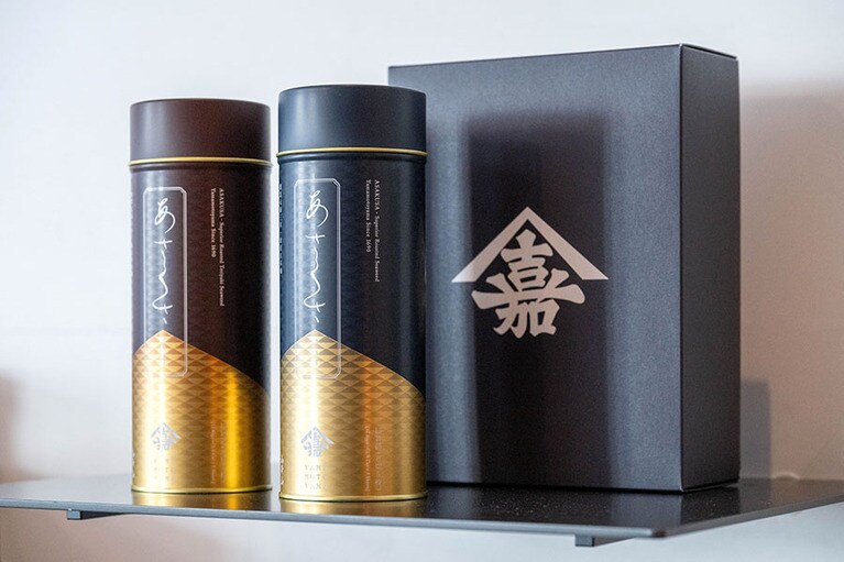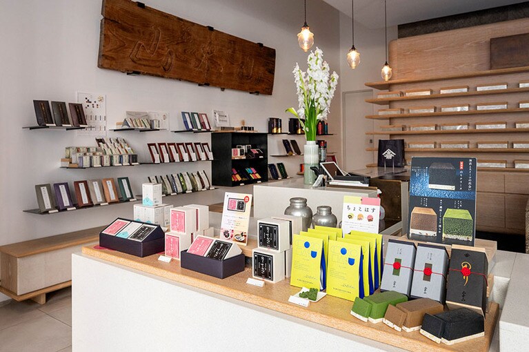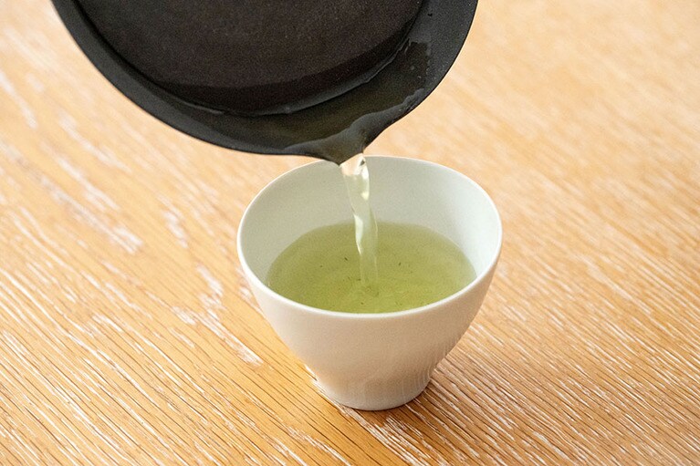 お茶を淹れる美しい所作も眺めることができるカウンター席がおすすめです。 使用する茶葉(玉露は7グラム)を正確に計ります。 器に温度差があると茶葉が過敏に反応してしまうため、まず茶器を温めます。 湯冷しして40度にしたお湯を茶葉にゆっくりと注ぎます。一煎目は小さなおちょこを使用。最後の一滴まで静かに注ぎ入れます。 一煎めは小さなおちょこを使用。最後の一滴まで静かに注ぎ入れます。 一煎めより少し緑色が濃くなります 味わいだけでなく、色の違いもわかりやすい玉露。 きれいに開いた玉露の茶葉をゆずポン酢でいただきます。 「テリーヌ食べ比べ お茶セット」2.500円。 箱入り(サイズ:横140×奥行55×高さ50mm)まっ茶テリーヌ 5,400円、ほうじ茶テリーヌ 7,560円、のりテリーヌ 8,640円。
