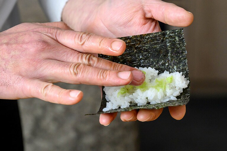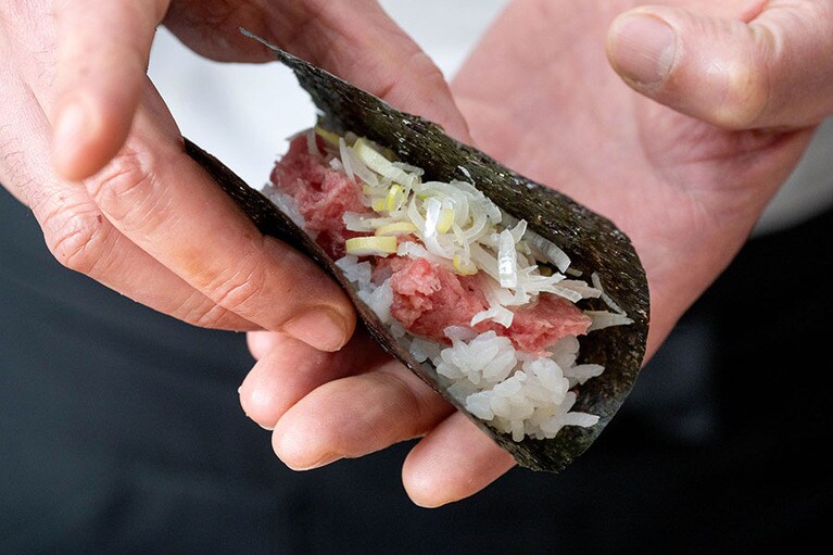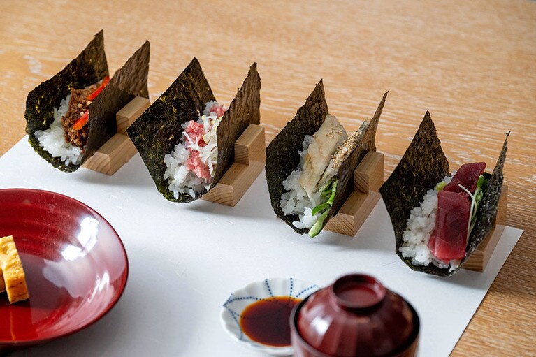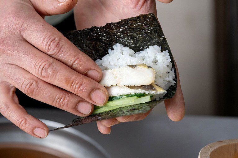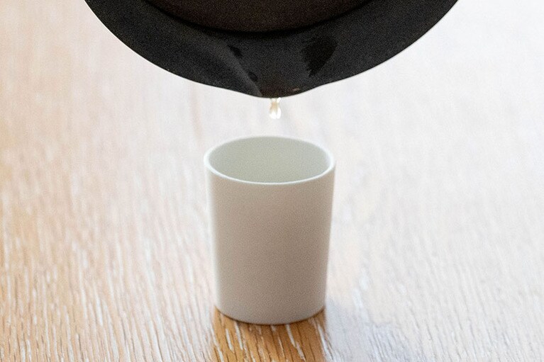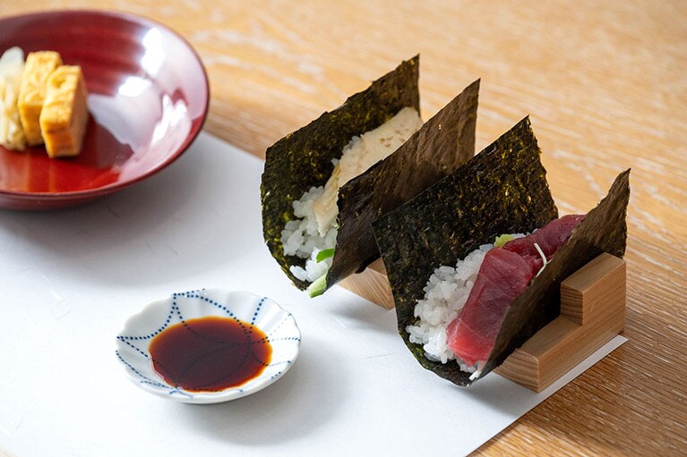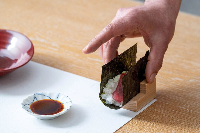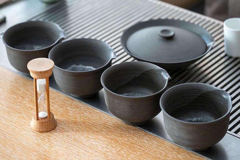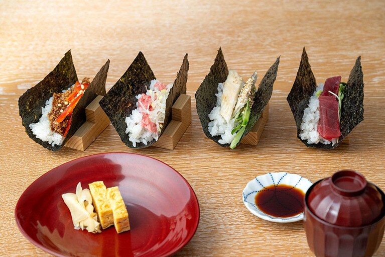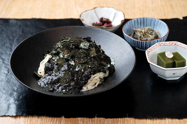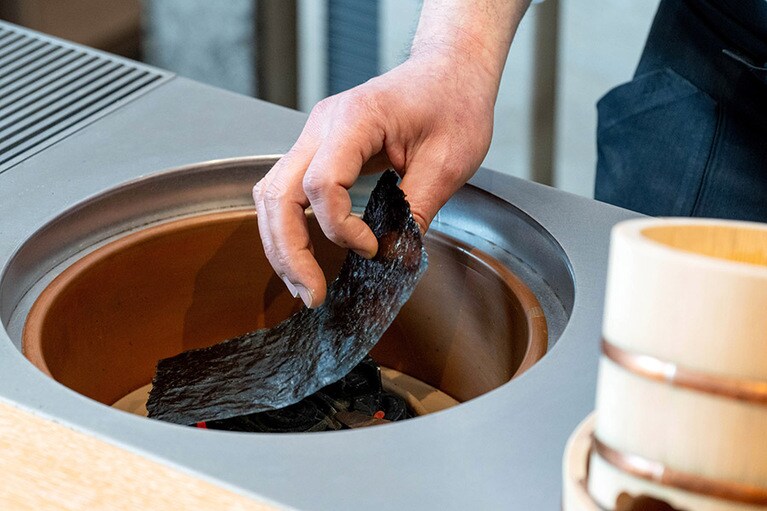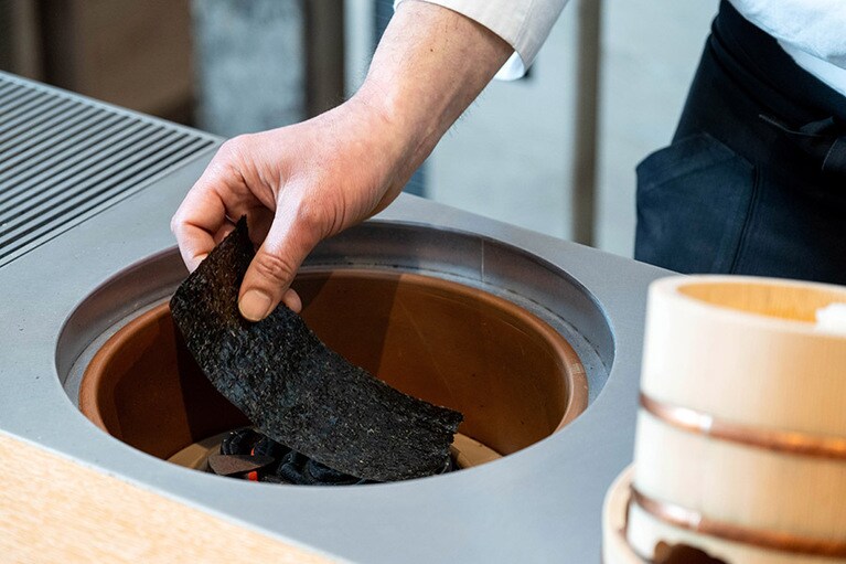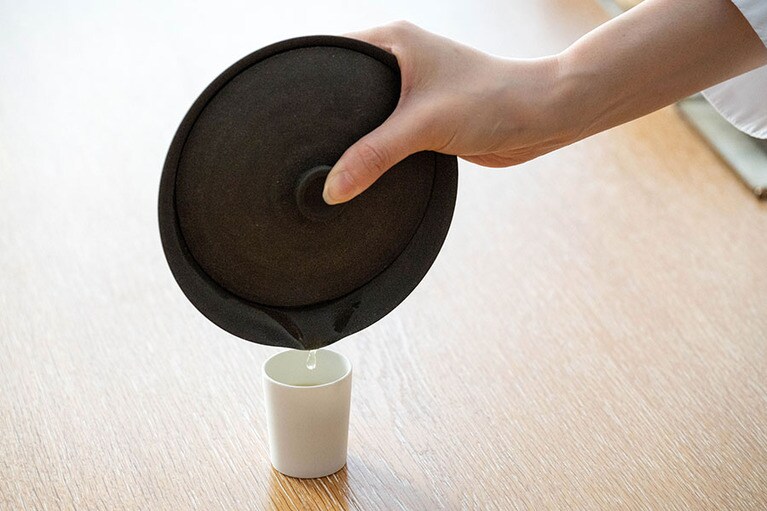 お茶を淹れる美しい所作も眺めることができるカウンター席がおすすめです。 使用する茶葉(玉露は7グラム)を正確に計ります。 器に温度差があると茶葉が過敏に反応してしまうため、まず茶器を温めます。 湯冷しして40度にしたお湯を茶葉にゆっくりと注ぎます。一煎目は小さなおちょこを使用。最後の一滴まで静かに注ぎ入れます。 一煎めは小さなおちょこを使用。最後の一滴まで静かに注ぎ入れます。 一煎めより少し緑色が濃くなります 味わいだけでなく、色の違いもわかりやすい玉露。 きれいに開いた玉露の茶葉をゆずポン酢でいただきます。 「テリーヌ食べ比べ お茶セット」2.500円。 箱入り(サイズ:横140×奥行55×高さ50mm)まっ茶テリーヌ 5,400円、ほうじ茶テリーヌ 7,560円、のりテリーヌ 8,640円。