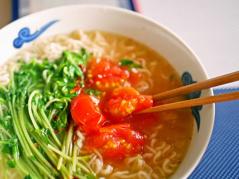 肉ニラのっけ醤油ラーメン。 「麺神(めがみ)濃香醤油」/明星 豆苗トマトのっけラーメン。 もやしどっさりのっけ辛ラーメン。 辛ラーメン 3袋パック 425円。 エビオイルふりかけのっけ麺。 海老三昧 780円/幸徳堂 トマトブロッコリーちくわのっけ塩ラーメン。