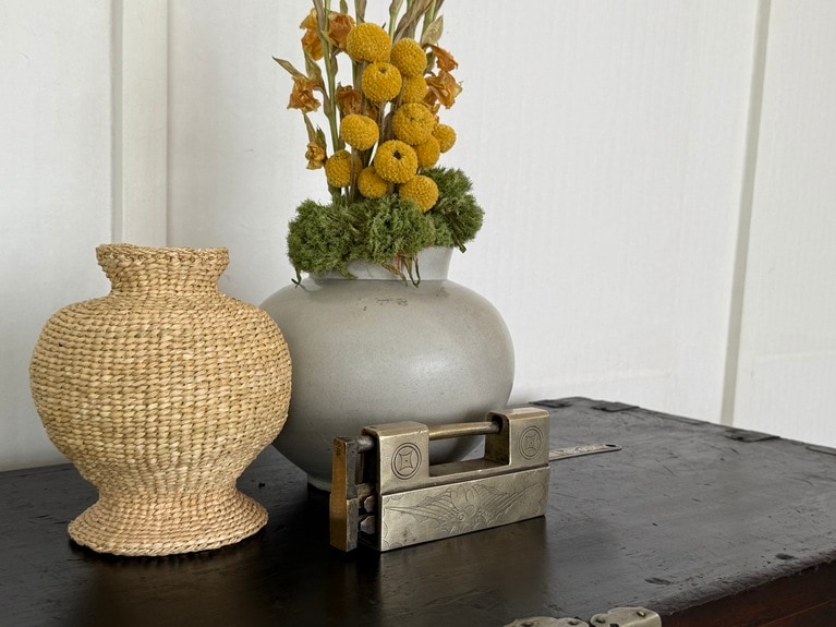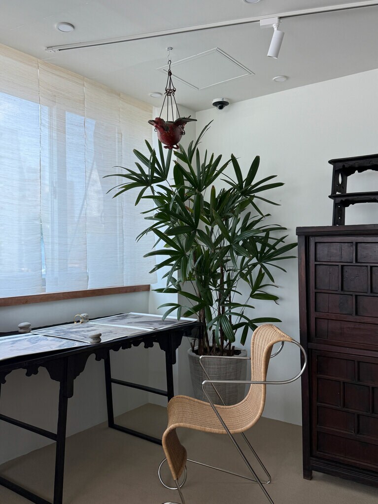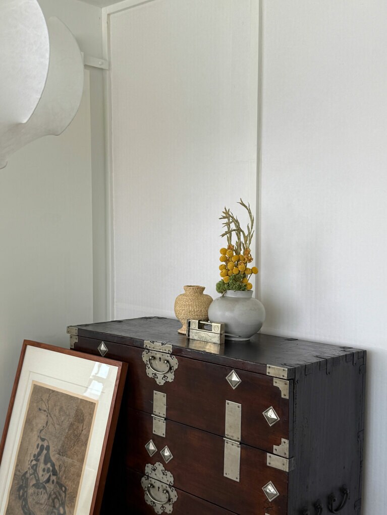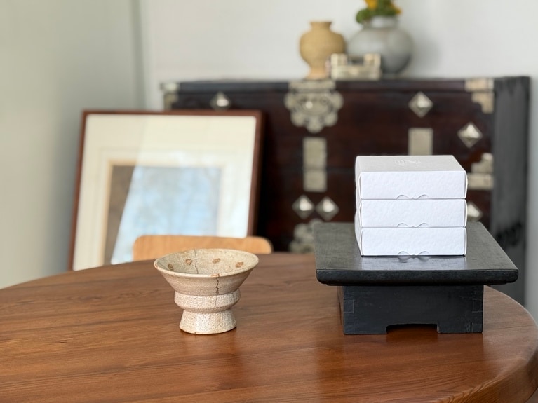 代表の審美眼にかなった韓国の古家具と古道具たち。 時代を越えた古きものと新しきものが融合した空間。 ファブリックアートスタジオ「BY GREY」、イ・チュンセ作家、伝統染めのパク・ヨンジン作家と共同製作された韓紙のオブジェ。凛とした佇まいに視線を奪われる。 ケミ地獄の始まり、ジウンさんのファースト古道具。文鎮代わりに使っているハンコ。 フランスのヴィンテージテーブルに朝鮮時代の器と木製台(ピョンデ)、シンプルなカップがしっくり馴染んでいて素敵。 左から:GOBOKIIが製作している3つのお香と19世紀朝鮮末期の白磁祭器(ペクジャジェギ)。韓国の伝統的な香りの名脈を繋げるべく、貴重な薬材を用いて作られている(上から:古150,000ウォン、福110,000ウォン、囍65,000ウォン)。 筆者は白磁祭器をお香立てに、木祭器にアクセサリーを置いて自宅で使用中。 大ぶりのスッカラを箪笥の鍵代わりに。 かの昔の農具も、ここにディスプレイされていると洗練されたインテリアに(左写真)。 ヨーロッパのヴィンテージインテリアと韓国の伝統家具が調和している。絶妙ミックスでモダンな雰囲気に。 東大門市場で購入した生地を使い韓国の伝統的な雰囲気を醸し出すカーテンに。 お香を2個以上購入すると、写真のようにポジャギで包んでくれる。 GOBOKII オリジナルポスター各55,000ウォン。