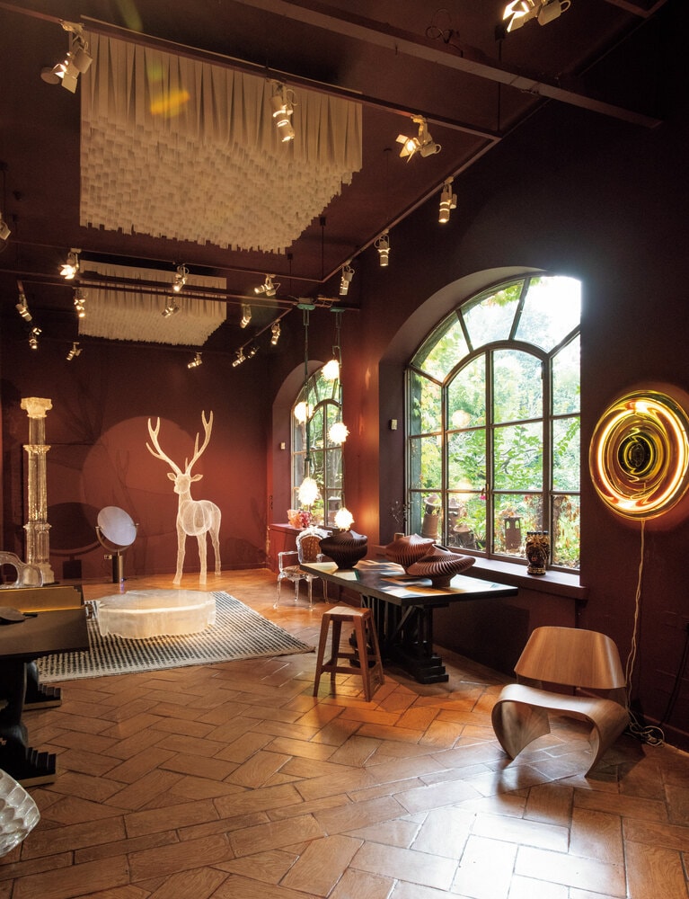 奥のシカのオブジェはベネデッタ・モリ・ウバルディーニ、手前のウォールランプはドラガ&オーレルの作品。 廃プラスチックで作った、オーナーのロッサーナさんのポートレート。持続可能な素材のためのプロジェクトも立ち上げ、最近はリサイクルプラスチックで作った作品の支援も行っている。 ヴェッツィーニ&チェンによる“ボンサイ フロア”67,370ユーロ。ギャラリーの常設展示品だが、購入可。 ロッサーナ氏の審美眼とセンスには定評がある。有名アーティストを世に送り出してきたミラノデザイン界のゴッドマザー。 道に面した展示スペースでは特別展を開催。 2階部分にはセレクトショップが。家具や照明とともに小さめのインテリア雑貨なども販売。 ギャラリーの入り口は中庭に面しており、ミラノの市街地にあるとは思えないような緑に覆われた美しい空間。デザインウィーク中は愛好家が一堂に会す最重要スポットになる。