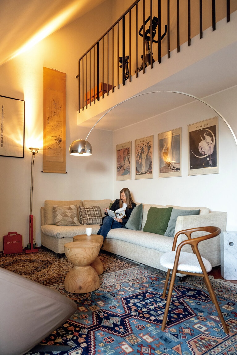 センス豊かなリビング。リーヴァの椅子「CLESSIDRA」をテーブルのように使っている。右の椅子はアルフレックスの「JK」。 ベランダが付いているのもこの家の気に入っているところ。外の椅子とテーブルはアウトドア家具ブランド、ロダのもの。日差しをいつでも部屋に取り込みたいのでカーテンはつけない。 アルフレックスの回転ラウンジチェア「LUCIA」はシェル型の背が体を包み込むよう。 カウンタータイプのダイニングテーブルは人数に応じて伸び縮みができる。 キッチンはモルテーニのもの。キッチンツールをすぐに使える機能的な造り。 日本の漆の器や鉄瓶など好きなものを集めたコーナー。 マンションの1階には玉砂利の庭が。日本の侘び寂びを感じる。